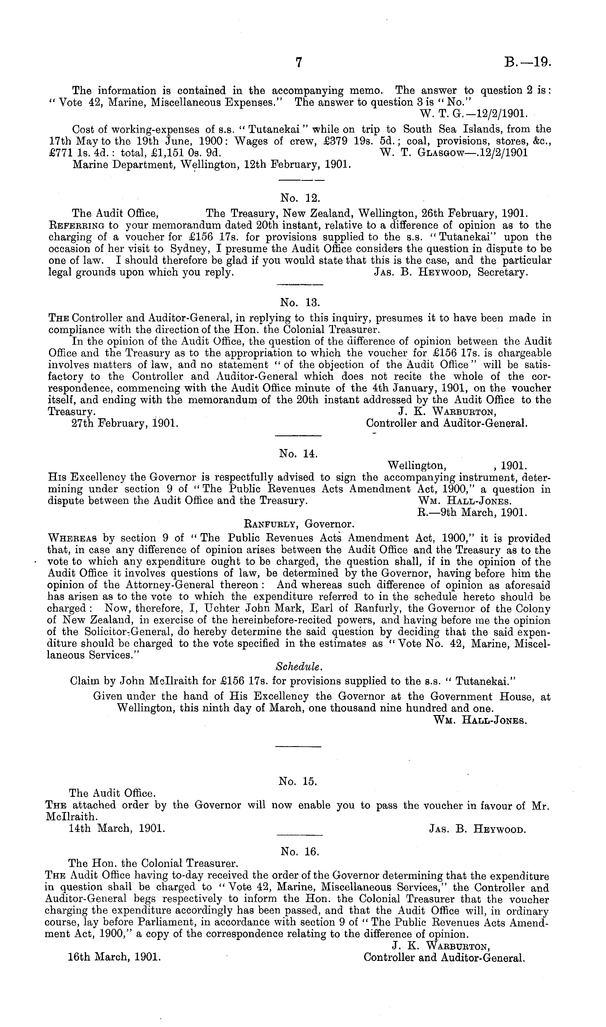 No. 16. The Hon. the Colonial Treasurer. The Audit Office having to-day received the order of the Governor determining that the expenditure in question shall be charged to "Vote 42, Marine, Miscellaneous Services," the Controller and Auditor-General begs respectively to inform the Hon. the Colonial Treasurer that the voucher charging the expenditure accordingly has been passed, and that the Audit Office will, in ordinary course, lay before Parliament, in accordance with section 9 of " The Public Eevenues Acts Amendment Act, 1900," a copy of the correspondence relating to the difference of opinion. J. K. Waebueton, 16th March, 1901. Controller and Auditor-General.
