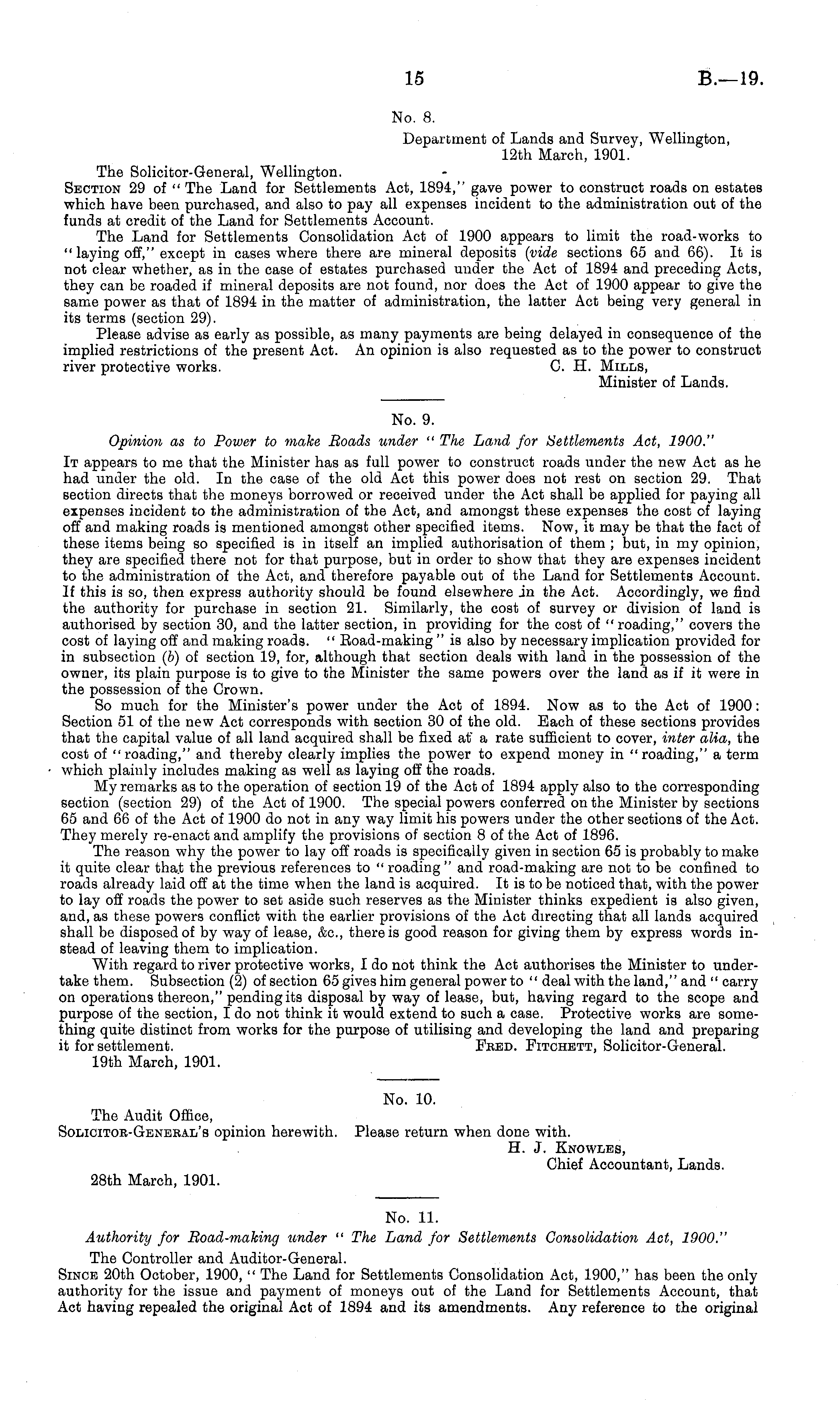 No. 8. Department of Lands and Survey, Wellington, 12th March, 1901. The Solicitor-General, Wellington. Section 29 of " The Land for Settlements Act, 1894," gave power to construct roads on estates which have been purchased, and also to pay all expenses incident to the administration out of the funds at credit of the Land for Settlements Account. The Land for Settlements Consolidation Act of 1900 appears to limit the road-works to " laying off," except in cases where there are mineral deposits (vide sections 65 and 66). It is not clear whether, as in the case of estates purchased under the Act of 1894 and preceding Acts, they can be roaded if mineral deposits are not found, nor does the Act of 1900 appear to give the same power as that of 1894 in the matter of administration, the latter Act being very general in its terms (section 29). Please advise as early as possible, as many payments are being delayed in consequence of the implied restrictions of the present Act. An opinion is also requested as to the power to construct river protective works. C. H. Mills, Minister of Lands.