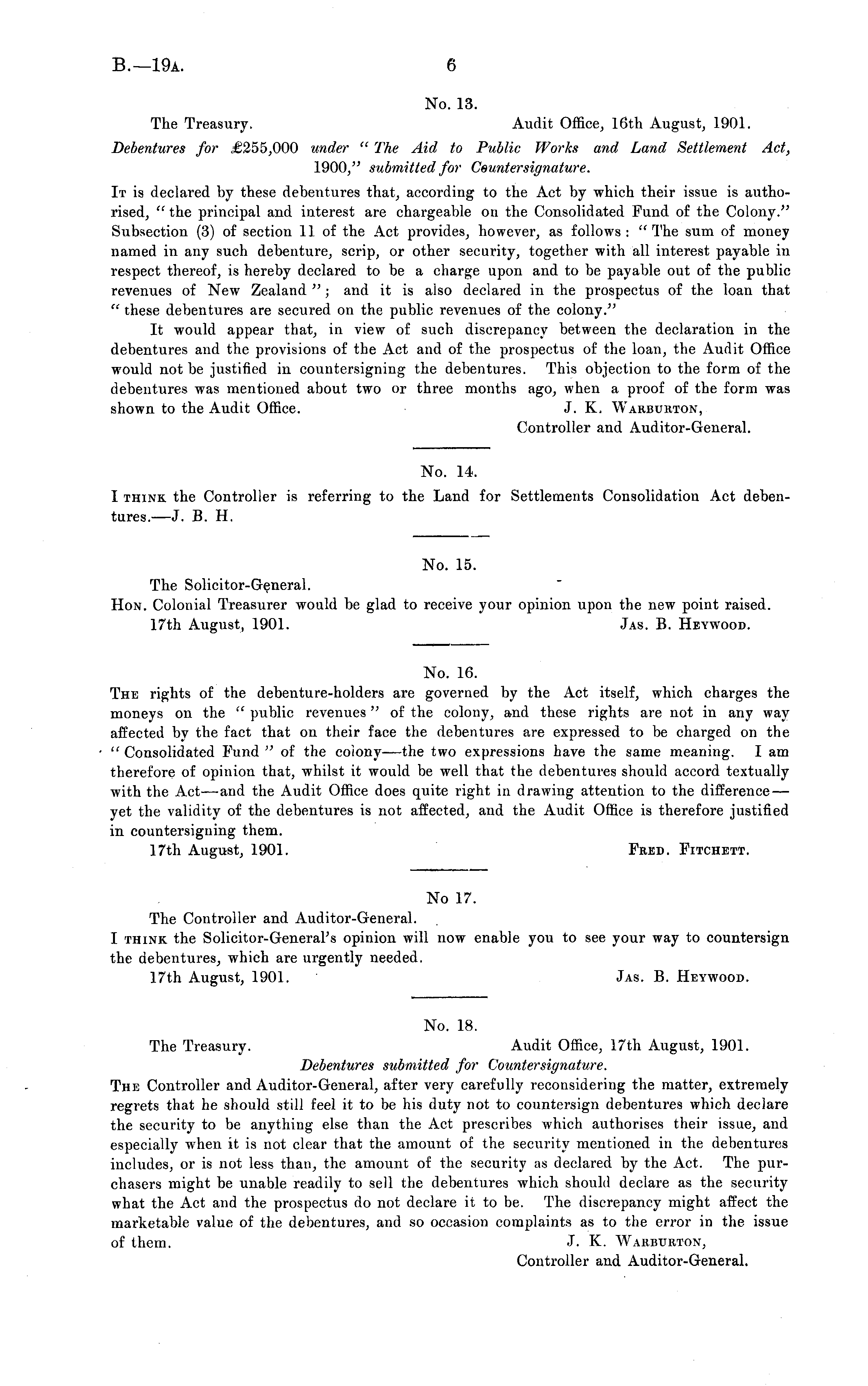 No 17. The Controller and Auditor-General. I think the Solicitor-General's opinion will now enable you to see your way to countersign the debentures, which are urgently needed. 17th August, 1901. Jas. B. Heywood.