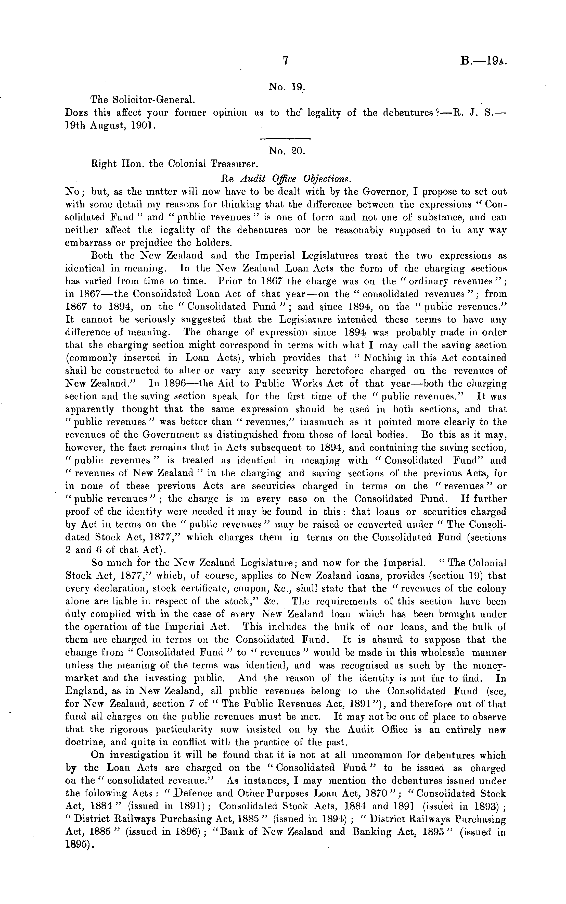 No. 20. Right Hon. the Colonial Treasurer. Re Audit Office Objections. No; but, as the matter will now have to be dealt with by the Governor, I propose to set out with some detail my reasons for thinking that the difference between the expressions " Consolidated Fund " and " public revenues " is one of form and not one of substance, and can neither affect the legality of the debentures nor be reasonably supposed to in any way embarrass or prejudice the holders. Both the New Zealand and the Imperial Legislatures treat the two expressions as identical in meaning. In the New Zealand Loan Acts the form of the charging sections has varied from time to time. Prior to 1867 the charge was on the " ordinary revenues " ; in 1867 —the Consolidated Loan Act of that year —on the " consolidated revenues " ; from 1867 to 1894, on the "Consolidated Fund"; and since 1894, ou the "public revenues." It cannot be seriously suggested that the Legislature intended these terms to have any difference of meaning. The change of expression since 1894 was probably made in order that the charging section might correspond in terms with what I may call the saving section (commonly inserted in Loan Acts), which provides that " Nothing in this Act contained shall be constructed to alter or vary any security heretofore charged on the revenues of New Zealand." In 1896 —the Aid to Public Works Act of that year—'both the charging section and the saving section speak for the first time of the " public revenues." It was apparently thought that the same expression should be used in both sections, and that "public revenues" was better than " revenues," inasmuch as it pointed more clearly to the revenues of the Government as distinguished from those of local bodies. Be this as it may, however, the fact remains that in Acts subsequent to 1894, and containing the saving section, " public revenues" is treated as identical in meaning with " Consolidated Fund" and " revenues of New Zealand " in the charging and saving sections of the previous Acts, for in none of these previous Acts are securities charged in terms on the " revenues" or " public revenues" ; the charge is in every case on the Consolidated Fund. If further proof of the identity were needed it may be found in this : that loans or securities charged by Act in terms on the " public revenues " may be raised or converted under " The Consolidated Stock Act, 1877," which charges them in terms on the Consolidated Fund (sections 2 and 6 of that Act). So much for the New Zealand Legislature; and now for the Imperial. " The Colonial Stock Act, 1877," which, of course, applies to New Zealand loans, provides (section 19) that every declaration, stock certificate, coupon, &c, shall state that the " revenues of the colony alone are liable in respect of the stock," &c. The requirements of this section have been duly complied with in the case of every New Zealand loan which has been brought under the operation of the Imperial Act. This includes the bulk of our loans, and the bulk of them are charged in terms on the Consolidated Fund. It is absurd to suppose that the change from " Consolidated Fund " to " revenues " would be made in this wholesale manner unless the meaning of the terms was identical, and was recognised as such by the moneymarket and the investing public. And the reason of the identity is not far to find. In England, as in New Zealand, all public revenues belong to the Consolidated Fund (see, for New Zealand, section 7 of " The Public Revenues Act, 1891"), and therefore out of that fund all charges on the public revenues must be met. It may not be out of place to observe that the rigorous particularity now insisted on by the Audit Office is an entirely new doctrine, and quite in conflict with the practice of the past. On investigation it will be found that it is not at all uncommon for debentures which by the Loan Acts are charged on the " Consolidated Fund" to be issued as charged on the " consolidated revenue." As instances, I may mention the debentures issued under the following Acts : " Defence and Other Purposes Loan Act, 1870 " ; " Consolidated Stock Act, 1884 " (issued in 1891) ; Consolidated Stock Acts, 1884 and 1891 (issued in 1893) ; " District Railways Purchasing Act, 1885 " (issued in 1894) ; " District Railways Purchasing Act, 1885" (issued in 1896); "Bank of New Zealand and Banking Act, 1895" (issued in 1895).