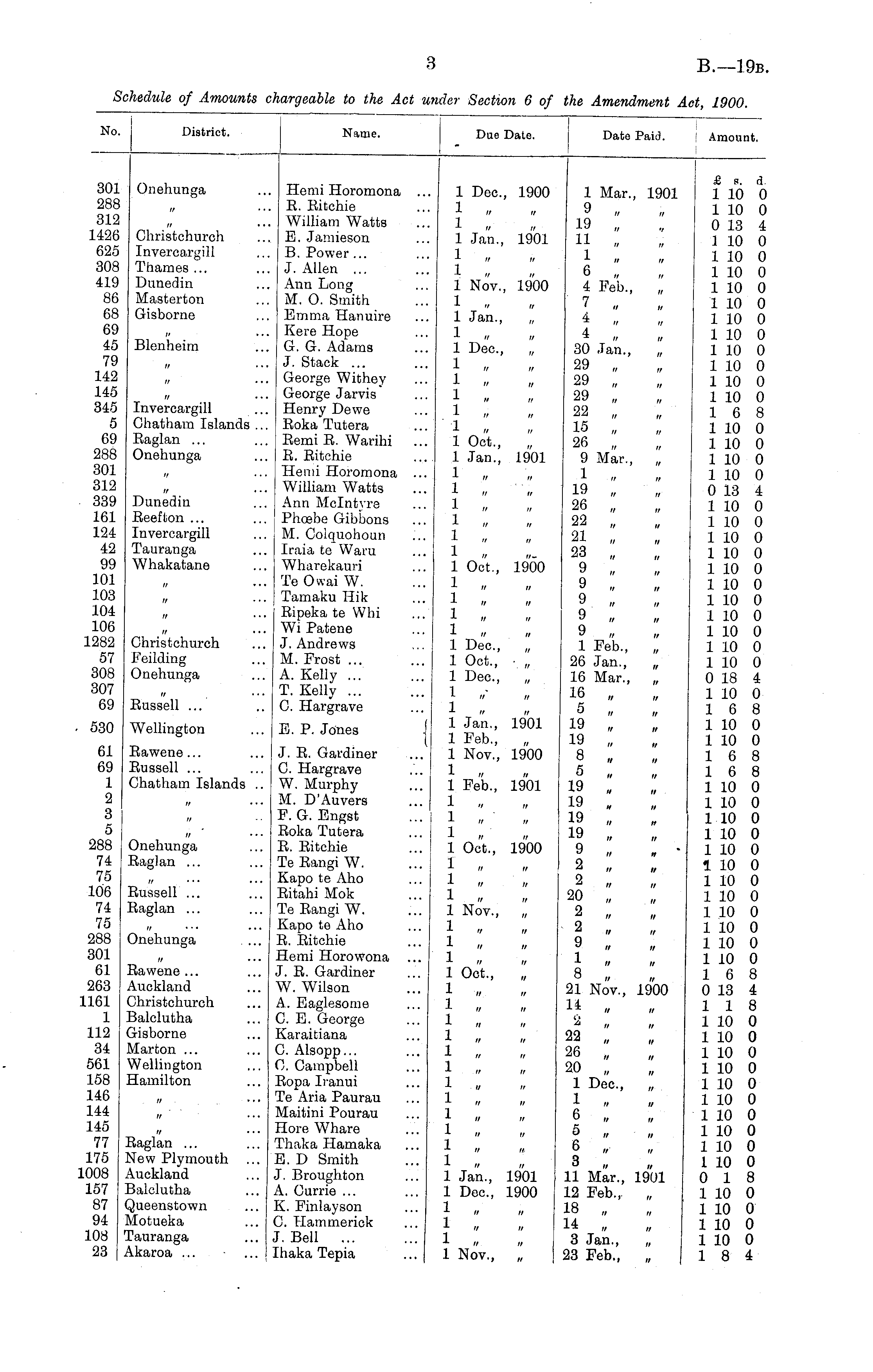 No. District. Name. Duo Date. Date Paid. Amount. 301 288 312 1426 625 308 419 86 68 69 45 79 142 145 345 5 69 288 301 312 339 161 124 42 99 101 103 104 106 1282 57 308 307 69 530 Onehunga Christchurch Invercargill Thames ... Dunedin Masterton Gisborne Blenheim Invercargill Chatham Islands ... Eaglan ... Onehunga if • • • Dunedin Eeefton ... Invercargill Tauranga Whakatane tt • • • f , ... Christchurch Feilding Onehunga Eussell ... Wellington Hemi Horomona B. Eitchie William Watts E. Jamieson B. Power... J. Allen ... Ann Long M. O. Smith Emma Hanuire Kere Hope G. G. Adams J. Stack ... George Withey George Jarvis Henry Dewe Eoka Tutera Eemi E. Warihi E. Eitchie Hemi Horomona William Watts Ann Mclntyre Phoebe Gibbons M. Coiquohoun Iraia te Waru Wharekauii Te Owai W. Tamaku Hik Eipeka te Whi Wi Patene J. Andrews M. Frost ... A. Kelly ... T. Kelly ... C. Hargrave E. P. Jones J. E. Gardiner C. Hargrave W. Murphy M. D'Auvers F. G. Engst Eoka Tutera E. Eitchie Te Eangi W. Kapo te Aho Eitahi Mok Te Eangi W. Kapo te Aho E. Eitchie Hemi Horowona J. E. Gardiner W. Wilson A. Eaglesome C. E. George Karaitiana C. Alsopp... C. Campbell Eopa Iranui Te Aria Paurau Maitini Pourau Hore Whare Thaka Hamaka E. D Smith J. Broughton A. Currie ... K. Finlayson 3. Hammerick J. Bell ... [haka Tepia ( ... I 1 Dec, 1900 1 „ 1 . 1 Jan., 1901 1 „ 1 „ 1 Nov., 1900 1 . 1 Jan., „ 1 . 1 Dec, 1 . 1 . 1 „ 1 „ 1 n 1 Oct., 1 Jan., 1901 1 „ 1 „ 1 „ 1 . 1 . 1 . 1 Oct., 1900 1 . 1 . 1 » 1 . 1 Dec, „ 1 Oct., ■ „ 1 Dec, „ 1 „■ 1 „ 1 Jan., 1901 1 Feb., 1 Nov., 1900 1 Feb., 1901 1 , 1 . 1 . 1 Oct., 1900 1 . 1 . 1 „ 1 Nov., „ 1 » 1 , 1 „ 1 Oct., „ 1 . 1 „ 1 . -*- it ft it it 1 „ 1 . 1 , 1 „ 1 . 1 „ 1 Jan., 1901 1 Dec, 1900 1 „ 1 „ 1 , 1 Nov., . 1 Mar., 1901 9 „ 19 „ 11 . 1 . 6 , 4 Feb., „ 7 „ 4 „ 4 „ 30 Jan., 29 „ 29 „ 29 „ 22 „ 15 „ 26 „ 9 Mar., „ 1 „ 19 „ 26 „ 22 „ 21 „ 23 . 9 . 9 . 9 „ 9 . 9 „ 1 Feb., „ 26 Jan., „ 16 Mar., „ 16 „ 5 // // 19 „ 19 „ 8 „ t, 5 . 19 . 19 » 19 . 19 ■ 9 „ 2 . 2 „ 20 „ 2 . 2 „ „ if it 8 » » 21 Nov., 1900 14 „ 2 „ 22 „ 26 „ 20 „ 1 Dec, „ 1 , 6 w „ 5 n i, 6 . g 11 Mar., 1901 12 Feb., „ 18 „ 14 „ 3 Jan., „ 23 Feb., „ & s. 1 10 1 10 0 13 1 10 1 10 1 10 1 10 1 10 1 10 1 10 1 10 1 10 1 10 1 10 1 6 1 10 1 10 1 10 1 10 0 13 1 10 1 10 1 10 1 10 1 10 1 10 1 10 1 10 1 10 1 10 1 10 0 18 1 10 1 6 1 10 1 10 1 6 1 6 1 10 1 10 1 10 1 10 1 10 1 10 1 10 1 10 1 10 1 10 1 10 1 10 1 6 0 13 1 1 1 10 1 10 1 10 1 10 1 10 1 10 1 10 1 10 1 10 1 10 0 1 1 10 1 10 1 10 1 10 i 1 8 ■ a. i o i 0 ; 4 i 0 i 0 ' 0 0 0 0 0 0 0 0 0 8 0 0 0 0 4 0 0 0 0 0 0 0 0 0 0 0 4 0 8 0 0 8 8 0 0 0 0 0 0 0 0 0 0 0 0 8 4 8 0 0 0 0 0 0 0 0 0 0 8 0 0 0 0 4 61 69 1 2 3 5 288 74 76 106 74 75 288 301 61 263 1161 1 112 34 561 158 146 144 145 77 175 1008 157 87 94 108 23 Eawene ... Eussell ... Chatham Islands .. it it it ... Onehunga Eaglan ... Eussell ... Eaglan ... Onehunga Eawene ... Auckland Christchurch Balclutha Gisborne Marton ... Wellington Hamilton » • • • a ... Eaglan ... New Plymouth Auckland Balclutha Queenstown Motueka Tauranga Akaroa ...