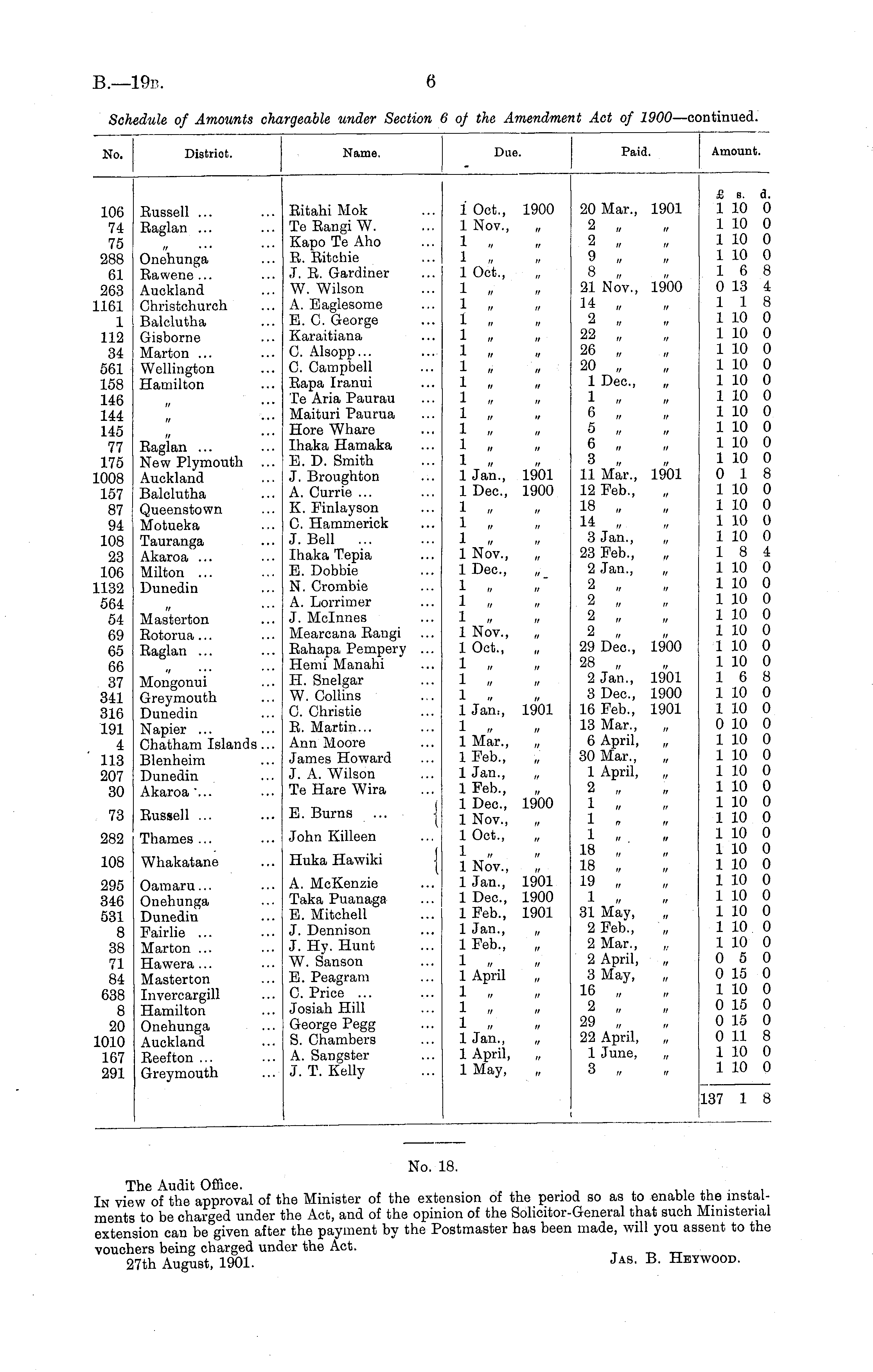No. 18. The Audit Office. , In view of the approval of the Minister of the extension of the period so as to enable the instalments to be charged under the Act, and of the opinion of the Solicitor-General that such Ministerial extension can be given after the payment by the Postmaster has been made, will you assent to the vouchers being charged under the Act. _ 27th August, 1901. Jas. B. Heywood.
