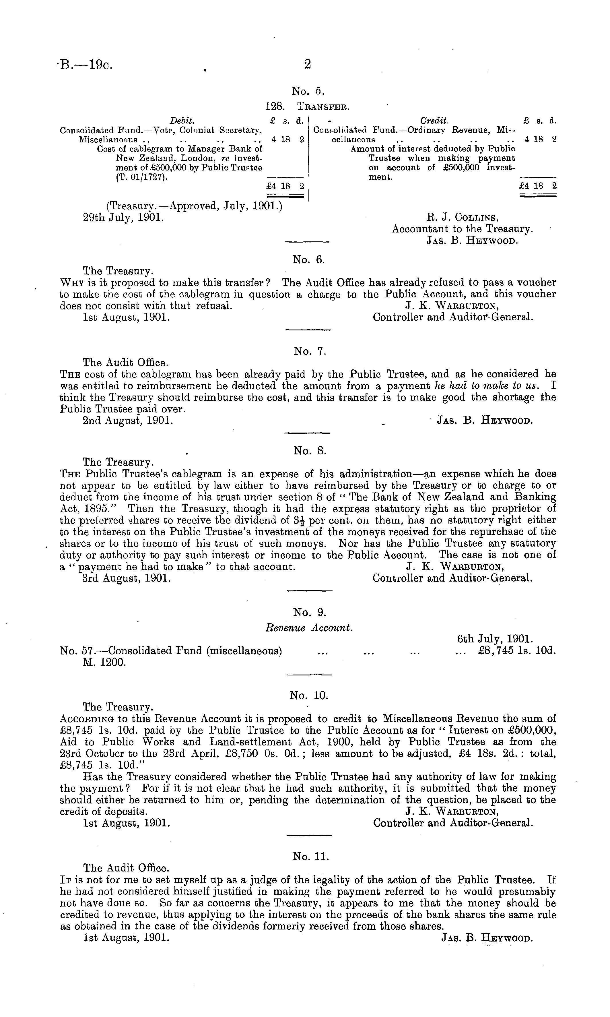 No. 7. The Audit Office. The cost of the cablegram has been already paid by the Public Trustee, and as he considered he was entitled to reimbursement he deducted the amount from a payment he had to make to us. I think the Treasury should reimburse the cost, and this transfer is to make good the shortage the Public Trustee paid over. 2nd August, 1901. _ Jas. B. Heywood.