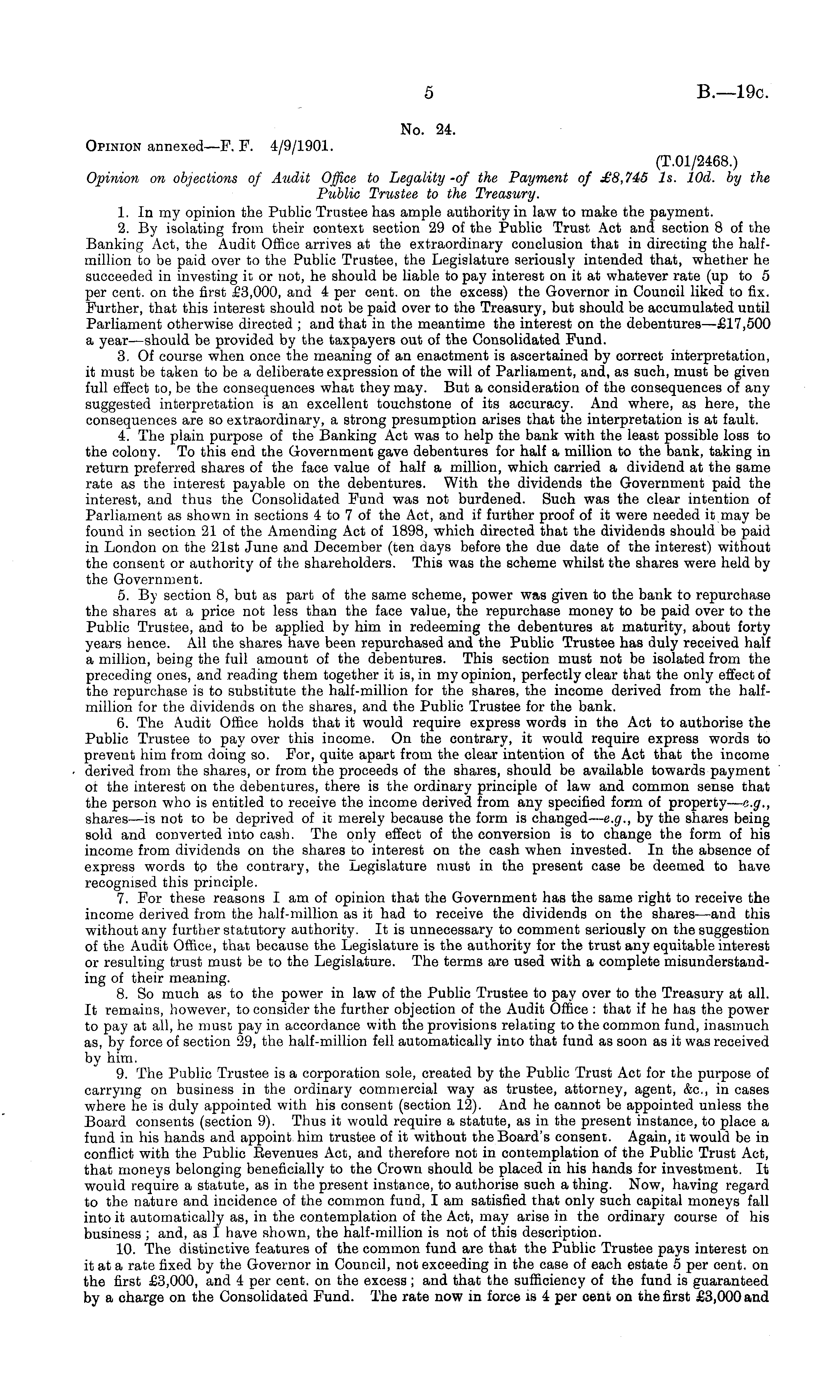 No. 24. Opinion annexed—F. F. 4/9/1901. (T.Ol/2468.) Opinion on objections of Audit Office to Legality-of the Payment of £8,745 Is. lOd. by the Public Trustee to the Treasury. 1. In my opinion the Public Trustee has ample authority in law to make the payment. 2. By isolating from their context section 29 of the Public Trust Act and section 8 of the Banking Act, the Audit Office arrives at the extraordinary conclusion that in directing the halfmillion to be paid over to the Public Trustee, the Legislature seriously intended that, whether he succeeded in investing it or not, he should be liable to pay interest on it at whatever rate (up to 5 per cent, on the first £3,000, and 4 per cent, on the excess) the Governor in Council liked to fix. Further, that this interest should not be paid over to the Treasury, but should be accumulated until Parliament otherwise directed ; and that in the meantime the interest on the debentures—£l7,soo a year—should be provided by the taxpayers out of the Consolidated Fund. 3. Of course when once the meaning of an enactment is ascertained by correct interpretation, it must be taken to be a deliberate expression of the will of Parliament, and, as such, must be given full effect to, be the consequences what they may. But a consideration of the consequences of any suggested interpretation is an excellent touchstone of its accuracy. And where, as here, the consequences are so extraordinary, a strong presumption arises that the interpretation is at fault. 4. The plain purpose of the Banking Act was to help the bank with the least possible loss to the colony. To this end the Government gave debentures for half a million to the bank, taking in return preferred shares of the face value of half a million, which carried a dividend at the same rate as the interest payable on the debentures. With the dividends the Government paid the interest, and thus the Consolidated Fund was not burdened. Such was the clear intention of Parliament as shown in sections 4 to 7 of the Act, and if further proof of it were needed it may be found in section 21 of the Amending Act of 1898, which directed that the dividends should be paid in London on the 21st June and December (ten days before the due date of the interest) without the consent or authority of the shareholders. This was the scheme whilst the shares were held by the Government. 5. By section 8, but as part of the same scheme, power was given to the bank to repurchase the shares at a price not less than the face value, the repurchase money to be paid over to the Public Trustee, and to be applied by him in redeeming the debentures at maturity, about forty years hence. All the shares have been repurchased and the Public Trustee has duly received half a million, being the full amount of the debentures. This section must not be isolated from the preceding ones, and reading them together it is, in my opinion, perfectly clear that the only effect of the repurchase is to substitute the half-million for the shares, the income derived from the halfmillion for the dividends on the shares, and the Public Trustee for the bank. 6. The Audit Office holds that it would require express words in the Act to authorise the Public Trustee to pay over this income. On the contrary, it would require express words to prevent him from doing so. For, quite apart from the clear intention of the Act that the income derived from the shares, or from the proceeds of the shares, should be available towards payment ot the interest on the debentures, there is the ordinary principle of law and common sense that the person who is entitled to receive the income derived from any specified form of property — e.g., shares —is not to be deprived of it merely because the form is changed— e.g., by the shares being sold and converted into cash. The only effect of the conversion is to change the form of his income from dividends on the shares to interest on the cash when invested. In the absence of express words to the contrary, the Legislature must in the present case be deemed to have recognised this principle. 7. For these reasons I am of opinion that the Government has the same right to receive the income derived from the half-million as it had to receive the dividends on the shares—and this without any further statutory authority. It is unnecessary to comment seriously on the suggestion of the Audit Office, that because the Legislature is the authority for the trust any equitable interest or resulting trust must be to the Legislature. The terms are used with a complete misunderstanding of their meaning. 8. So much as to the power in law of the Public Trustee to pay over to the Treasury at all. It remains, however, to consider the further objection of the Audit Office : that if he has the power to pay at all, he must pay in accordance with the provisions relating to the common fund, inasmuch as, by force of section 29, the half-million fell automatically into that fund as soon as it was received by him. 9. The Public Trustee is a corporation sole, created by the Public Trust Act for the purpose of carrying on business in the ordinary commercial way as trustee, attorney, agent, &c, in cases where he is duly appointed with his consent (section 12). And he cannot be appointed unless the Board consents (section 9). Thus it would require a statute, as in the present instance, to place a fund in his hands and appoint him trustee of it without the Board's consent. Again, it would be in conflict with the Public Revenues Act, and therefore not in contemplation of the Public Trust Act, that moneys belonging beneficially to the Crown should be placed in his hands for investment. It would require a statute, as in the present instance, to authorise such a thing. Now, having regard to the nature and incidence of the common fund, I am satisfied that only such capital moneys fall into it automatically as, in the contemplation of the Act, may arise in the ordinary cours