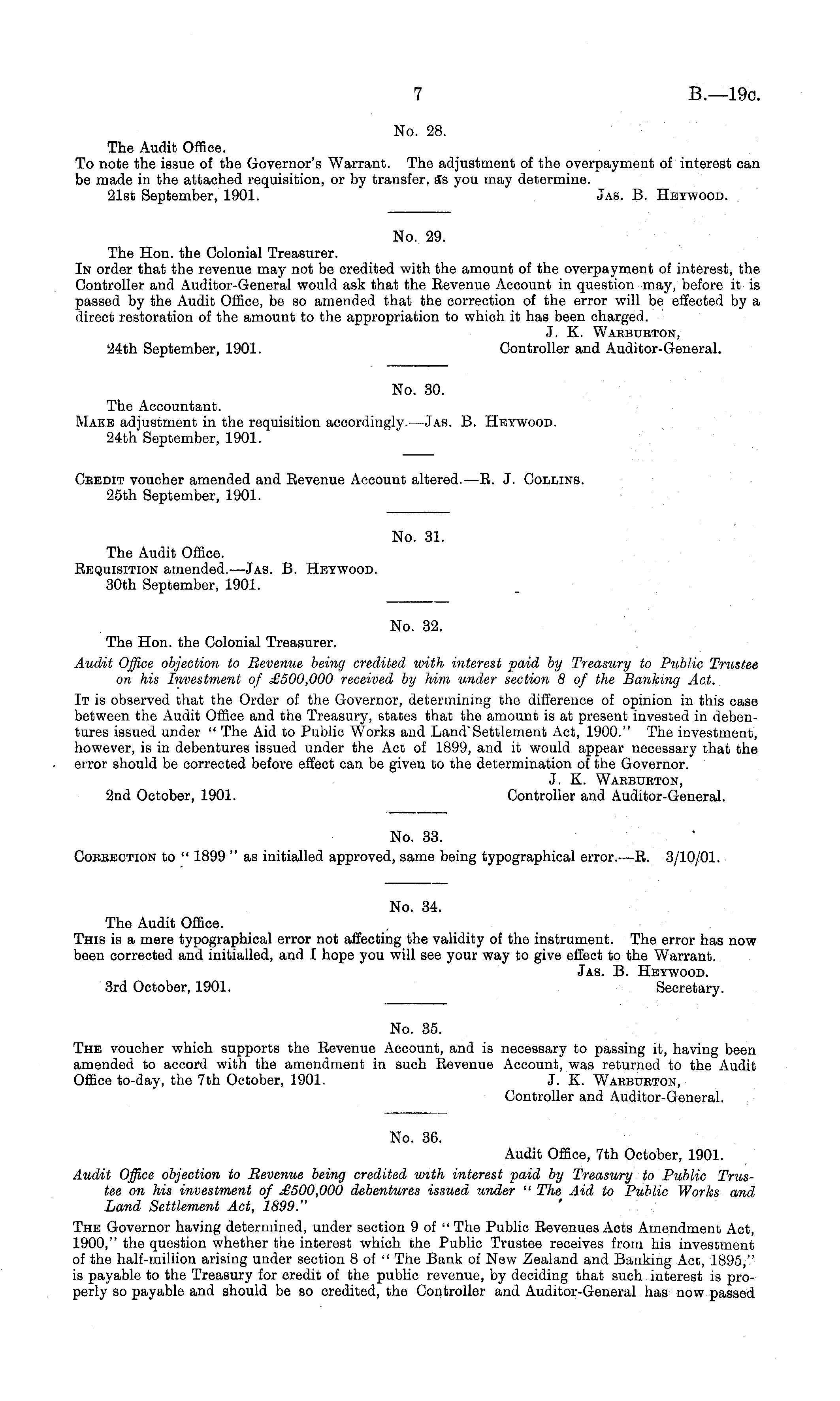 No. 28. The Audit Office. To note the issue of the Governor's Warrant. The adjustment of the overpayment of interest can be made in the attached requisition, or by transfer, a"s you may determine. 21st September, 1901. Jas. B. Heywood.