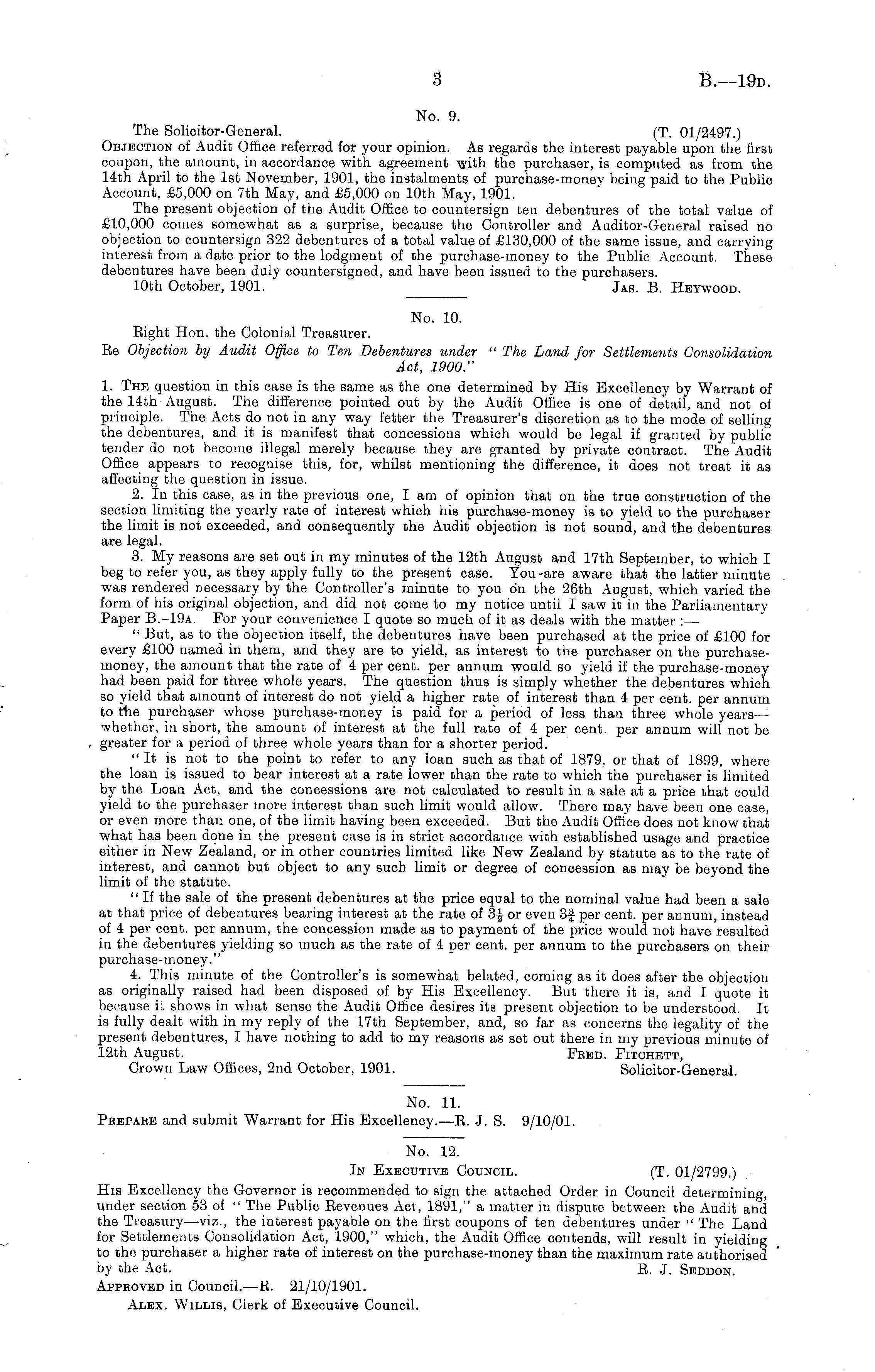 No. 9. The Solicitor-General. (T. 01/2497.) Objection of Audit Office referred for your opinion. As regards the interest payable upon the first coupon, the amount, in accordance with agreement with the purchaser, is computed as from the 14th April to the Ist November, 1901, the instalments of purchase-money being paid to the Public Account, £5,000 on 7th May, and £5,000 on 10th May, 1901. The present objection of the Audit Office to countersign ten debentures of the total value of £10,000 comes somewhat as a surprise, because the Controller and Auditor-General raised no objection to countersign 322 debentures of a total value of £130,000 of the same issue, and carrying interest from a date prior to the lodgment of the purchase-money to the Public Account. These debentures have been duly countersigned, and have been issued to the purchasers. 10th October, 1901. Jas. B. Heywood.