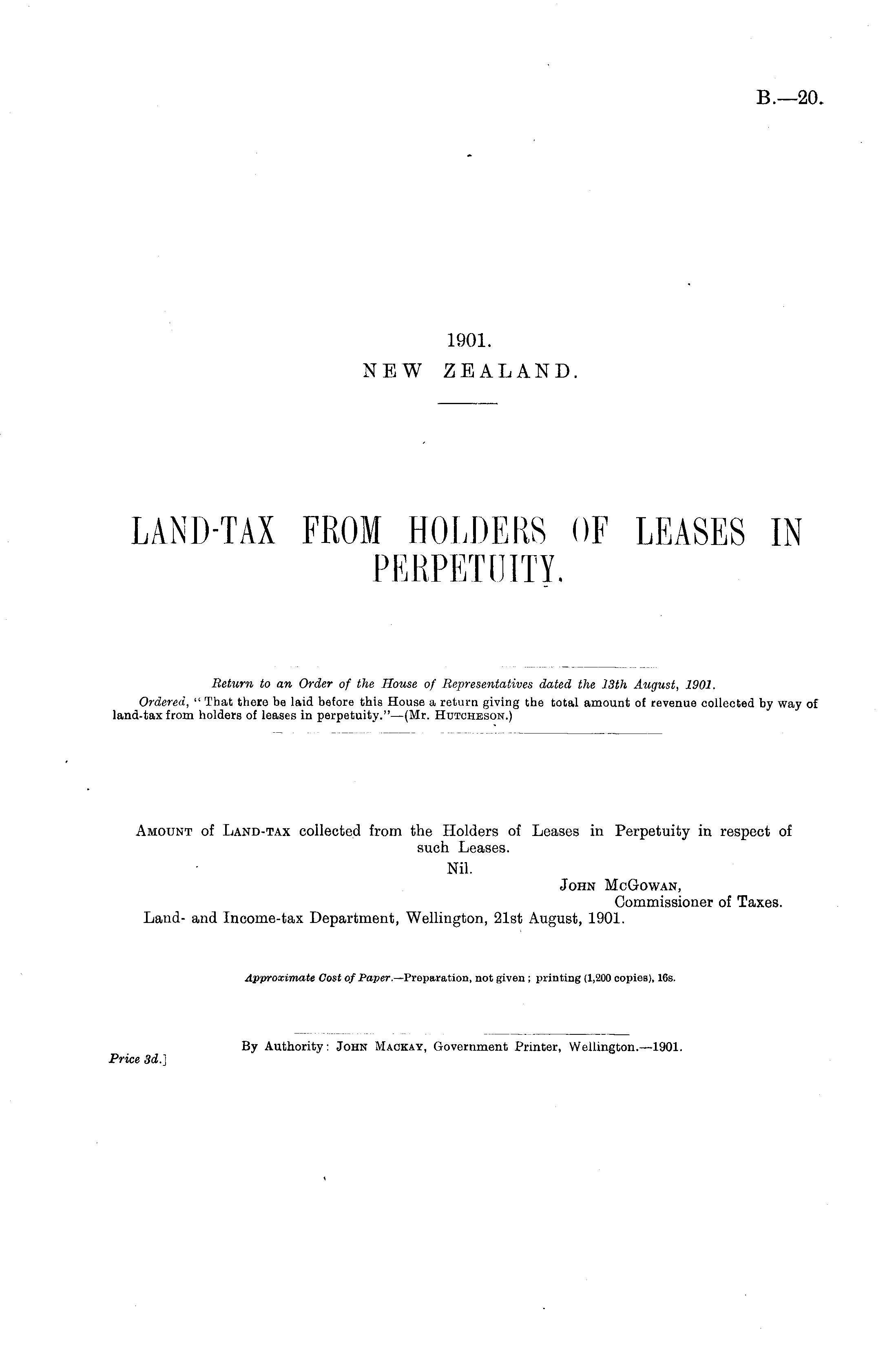 Amount of Land-tax collected from the Holders of Leases in Perpetuity in respect of such Leases. Nil. John McGowan, Commissioner of Taxes. Land- and Income-tax Department, Wellington, 21st August, 1901. Approximate Cost of Paper. —Preparation, not given; printing (1,200 copies), 16s.