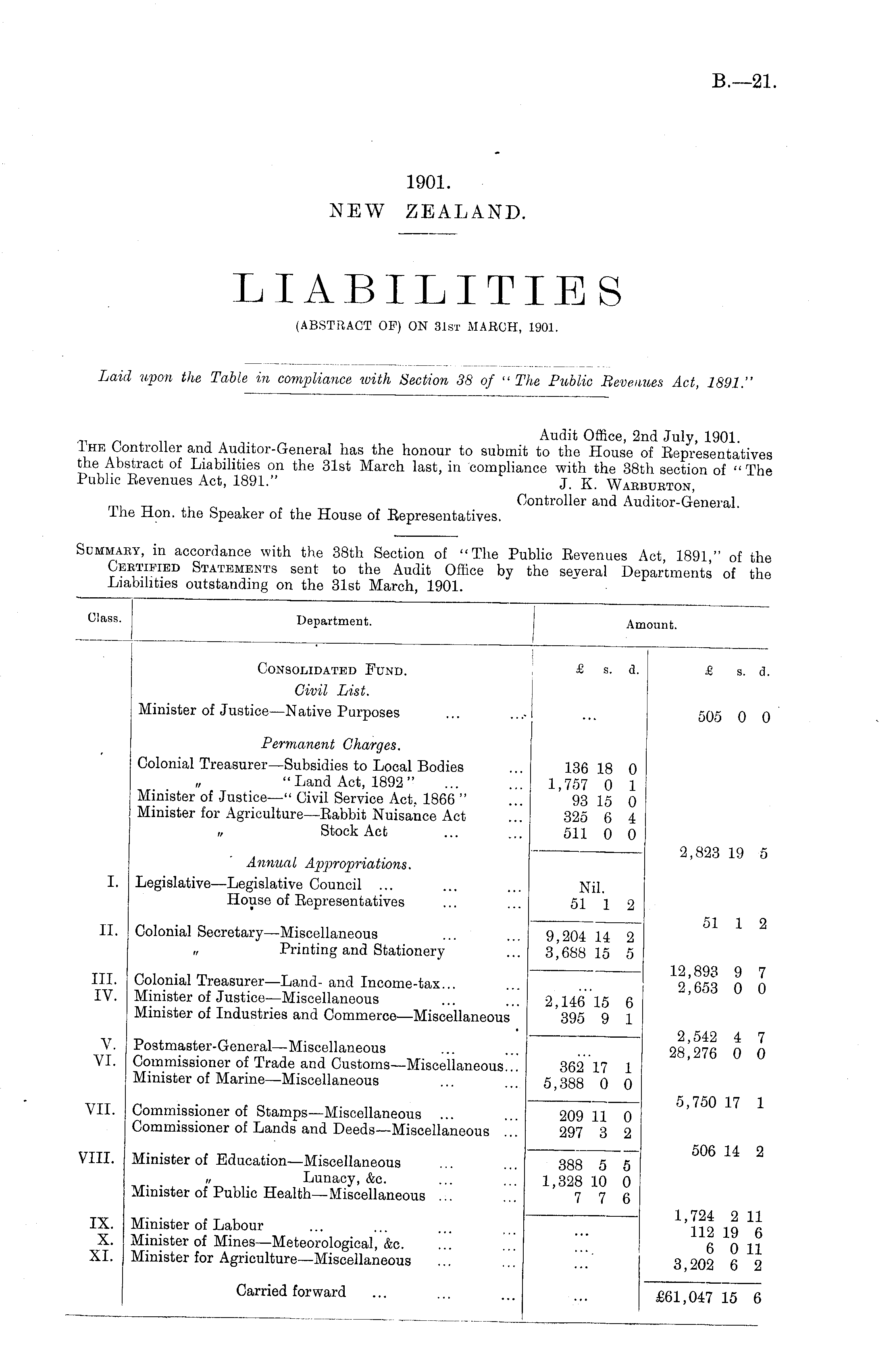71 „ ~ Audit Office, 2nd July, 1901. uai Auditor-General has the honour to submit to the House of Eepresentatives the Abstract of Liabilities on the 31st March last, in compliance with the 38th section of "The Public Eevenues Act, 1891." j. k. Wabburton, „, TT , _ Controller and Auditor-General, lire Hon. the Speaker of the House of Eepresentatives.