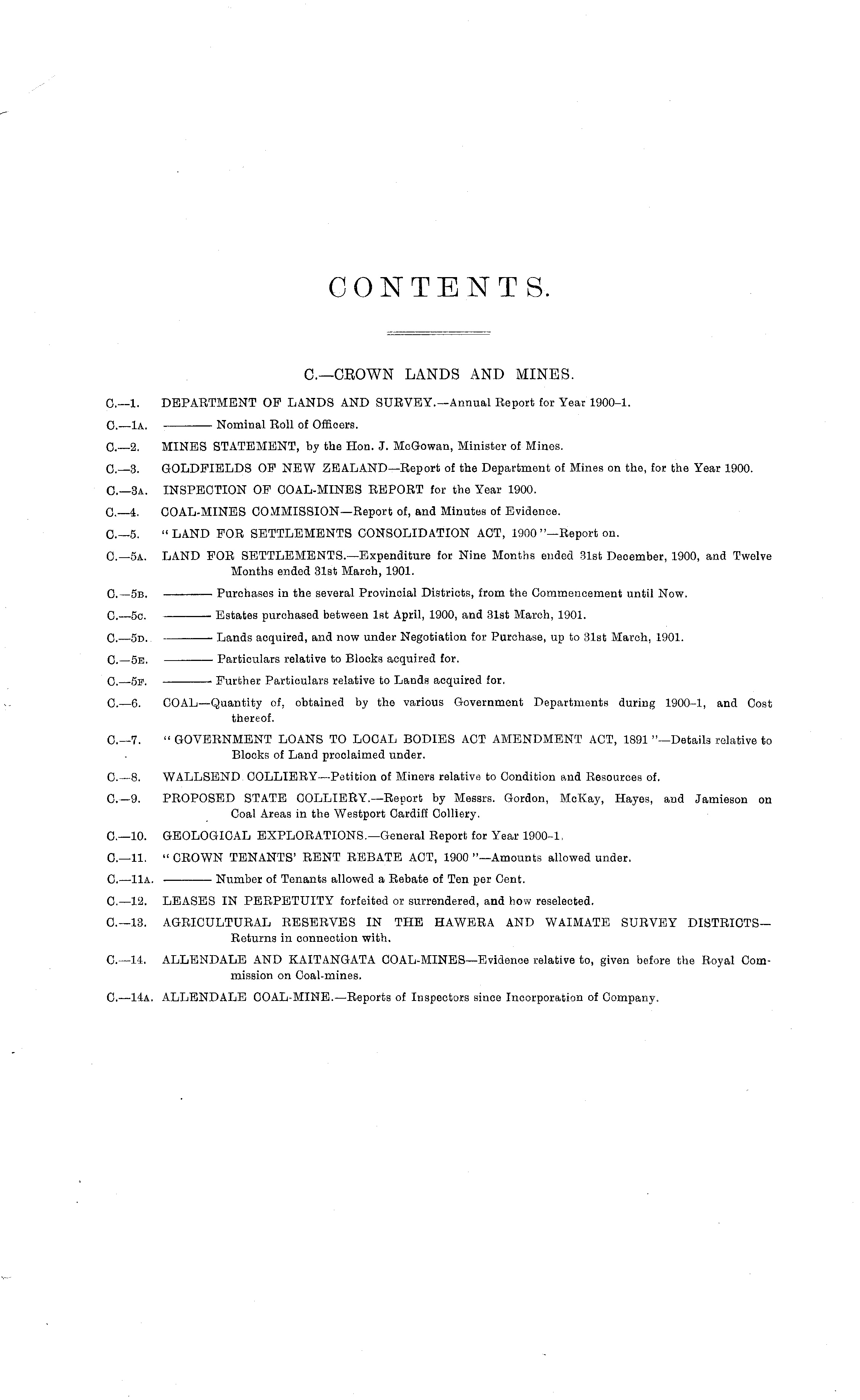 C—CEOWN LANDS AND MINES. o.—l. DEPABTMENT OP LANDS AND SURVEY.—AnnuaI Report for Year 1900-1. o.—lα. Nominal Roll of Officers. 0.—2. MINES STATEMENT, by the Hon. J. MoGowan, Minister of Mines. C.—3. GOLDPIELDS OP NEW ZEALAND—Report of the Department of Mines on the, foe the Year 1900. O.—3a. INSPECTION OP GOAL-MINES REPORT for the Year 1900. 0.—4. COAL-MINES COMMISSION—Report of, and Minutes of Evidence. C—s. "LAND FOR SETTLEMENTS CONSOLIDATION ACT, 1900 "—Report on. o.—sa. LAND FOR SETTLEMENTS.—Expenditure for Nine Months ended 31st December, 1900, and Twelve Months ended 31st March, 1901. o.—Sβ. Purchases in the several Provincial Districts, from the Commencement until Now. C.—sc. Estates purchased between Ist April, 1900, and 31at March, 1901. C.—sd. Lands acquired, and now under Negotiation for Purchase, up to 31st March, 1901. C.—se. Particulars relative to Blocks acquired for. O.—sf. Further Particulars relative to Lands acquired for. 0,—6. COAL—Quantity of, obtained by the various Government Departments during 1900-1, and Cost thereof. C—7. " GOVERNMENT LOANS TO LOCAL BODIES ACT AMENDMENT ACT, 1891 "-Details relative to Blocks of Land proclaimed under. C.—B. WALLSEND COLLlERY—Petition of Miners relative to Condition and Resources of. C—9. PROPOSED STATE COLLIERY.—Report by Messrs. Gordon, McKay, Hayes, and Jamieson on Coal Areas in the Westport Cardiff Colliery. o.—lo. GEOLOGICAL EXPLORATIONS.—GeneraI Report for Year 1900-1, C—ll. " CROWN TENANTS' RENT REBATE ACT, 1900 "—Amounts allowed under. C.—lla. Number of Tenants allowed a Rebate of Ten per Cent. C—l 2. LEASES IN PERPETUITY forfeited or surrendered, and how reselected. C—l 3. AGRICULTURAL RESERVES IN THE HAWERA AND WAIMATE SURVEY DISTRICTS— Returns in connection with. 0,-14. ALLENDALE AND KAITANGATA COAL-MlNES—Evidenoe relative to, given before the Royal Commission on Coal-mines. C. —14a. ALLENDALE COAL-MINE. —Reports of Inspectors since Incorporation of Company.