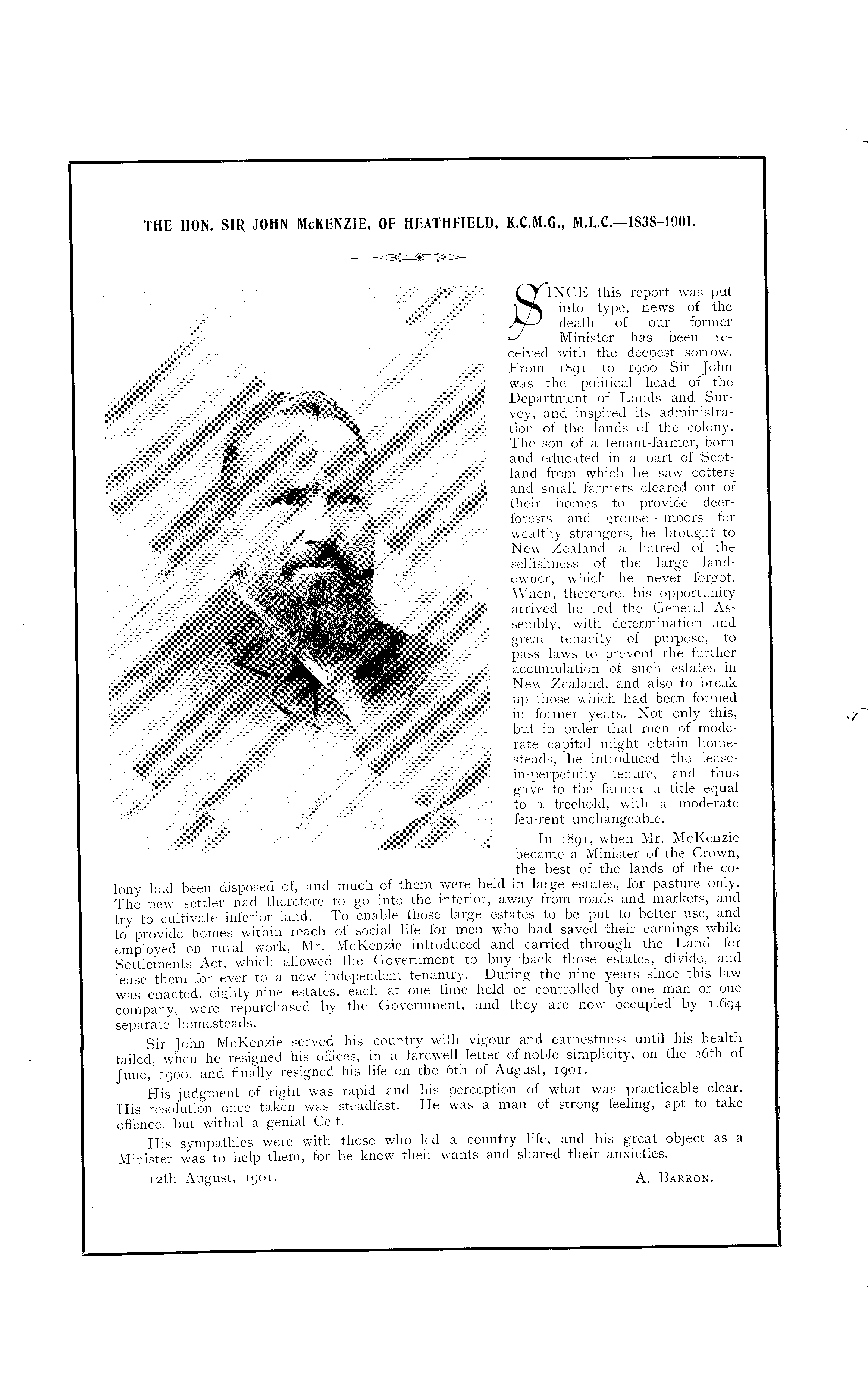 THE HON. SIR JOHN McKENZIE, OF HEATHFIELD, K.C.M.G., M.L.C.—1838-1901. this report was put 1 into type, news of the ry-J death of our former J Minister has been received with the deepest sorrow. From 1891 to igoo Sir John was the political head of the Department of Lands and Survey, and inspired its administration of the lands of the colony. The son of a tenant-farmer, born and educated in a part of Scotland from which he saw cotters and small farmers cleared out of their homes to provide deerforests and grouse - moors for wealthy strangers, he brought to New Zealand a hatred of the selfishness of the large landowner, which he never forgot. When, therefore, his opportunity arrived he led the General Assembly, with determination and great tenacity of purpose, to pass laws to prevent the further accumulation of such estates in New Zealand, and also to break up those which had been formed in former years. Not only this, but in order that men of moderate capital might obtain homesteads, he introduced the lease-in-perpetuity tenure, and thus gave to the farmer a title equal to a freehold, with a moderate feu-rent unchangeable. In 1891, when Mr. McKenzie became a Minister of the Crown, the best of the lands of the colony had been disposed of, and much of them were held in large estates, for pasture only. The new settler had therefore to go into the interior, away from roads and markets, and try to cultivate inferior land. To enable those large estates to be put to better use, and to provide homes within reach of social life for men who had saved their earnings while employed on rural work, Mr. McKenzie introduced and carried through the Land for Settlements Act, which allowed the Government to buy back those estates, divide, and lease them for ever to a new independent tenantry. During the nine years since this law was enacted, eighty-nine estates, each at one time held or controlled by one man or one company, were repurchased by the Government, and they are now by 1,694 separate homesteads. Sir John McKenzie served his country with vigour and earnestness until his health failed, when he resigned his offices, in a farewell letter of noble simplicity, on the 26th of June,'l9oo, and finally resigned his life on the 6th of August, 1901. His judgment of right was rapid and his perception of what was practicable clear. His resolution once taken was steadfast. He was a man of strong feeling, apt to take offence, but withal a genial Celt. His sympathies were with those who led a country life, and his great object as a Minister was to help them, for he knew their wants and shared their anxieties. 12th August, 1901. A. Barron.