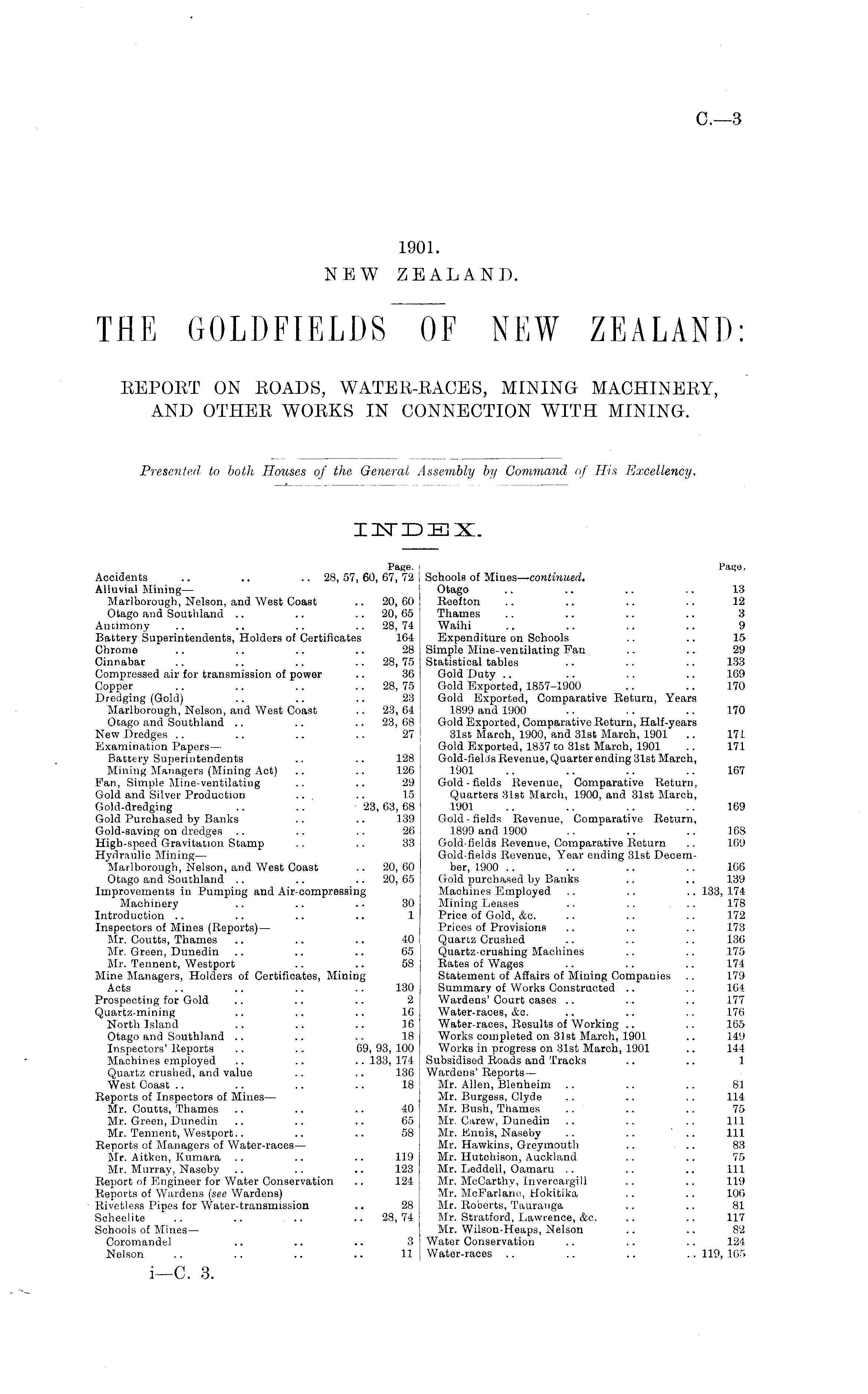 Pat>6, Schools of Mines — continued, Otago .. .. .. .. 13 Reef ton .. .. .. .. 12 Thames .. .. .. .. 3 Waihi .. .. .. .. 9 Expenditure on Schools .. .. 15 Simple Mine-ventilating Pan .. .. 29 Statistical tables .. .. .. 133 Gold Duty .. .. .. .. 169 Gold Exported, 1857-1900 .. .. 170 Gold Exported, Comparative Return, Years 1899 and 1900 .. .. .. 170 Gold Exported, Comparative Return, Half-years 31st March, 1900, and 31st March, 1901 .. 171 Gold Exported, 1857 to 31st March, 1901 .. 171 Gold-fields Revenue, Quarter ending 31st March, 1901 .. .. .. .. 167 Gold-fields Revenue, Comparative Return, Quarters 31st March, 1900, and 31st March, 1901 .. .. .. .. 169 Gold-fields Revenue, Comparative Return, 1899 and 1900 .. .. .. 168 Gold-fields Revenue, Comparative Return .. 169 Gold-fields Revenue, Year ending 31st December, 1900 .. .. .. .. 166 Gold purchased by Banks .. .. 139 Machines Employed .. .. .. 133,174 Mining Leases .. .. ... 178 Price of Gold, &c. .. .. .. 172 Prices of Provisions .. .. .. 173 Quartz Crushed .. .. .. 136 Quartz-crushing Machines .. .. 175 Rates of Wages .. .. .. 174 Statement of Affairs of Mining Companies Summary of Works Constructed .. .. 16i Wardens' Court cases .. .. .. 177 Water-races, &c. .. .. .. 176 Water-races, Results of Working .. .. 165 Works completed on 31st March, 1901 149 Works in progress on 31st March, 1901 .. 144 Subsidised Roads and Tracks .. .. 1 Wardens' Reports— i Mr. Allen, Blenheim .. .. .. 81 Mr. Burgess, Clyde .. .. .. 114 Mr. Bush, Thames .. .. .. 75 Mr. Carew, Dunedin .. .. .. 11l Mr. Enuis, Naseby .. .. .. 11l Mr. Hawkins, Greymouth .. .. 83 Mr. Hutchison, Auckland .. .. 75 Mr. Leddell, Oamaru .. .. .. 11l Mr. McCarthy, Invercargill .. .. 119 Mr. McParlano, Hokitika .. .. 106 Mr. Roberts, Taurauga .. .. 81 Mr. Stratford, Lawrence, &c. .. .. 117 Mr. Wilson-Heaps, Nelson .. .. 82 Water Conservation .. .. .. 124 Water-races .. .. .. .. 119, 165