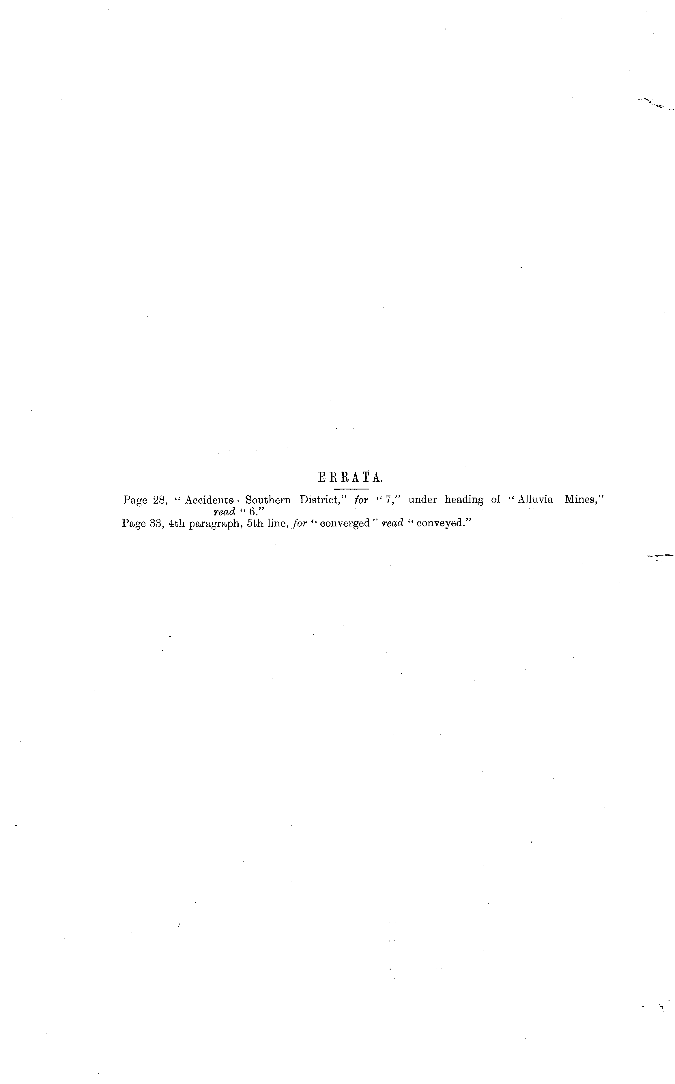 Page 28, " Accidents—Southern District," for " 7," under heading of " Alluvia Mines," read " 6." Page 33, 4th paragraph, sth line, for " converged " read " conveyed."