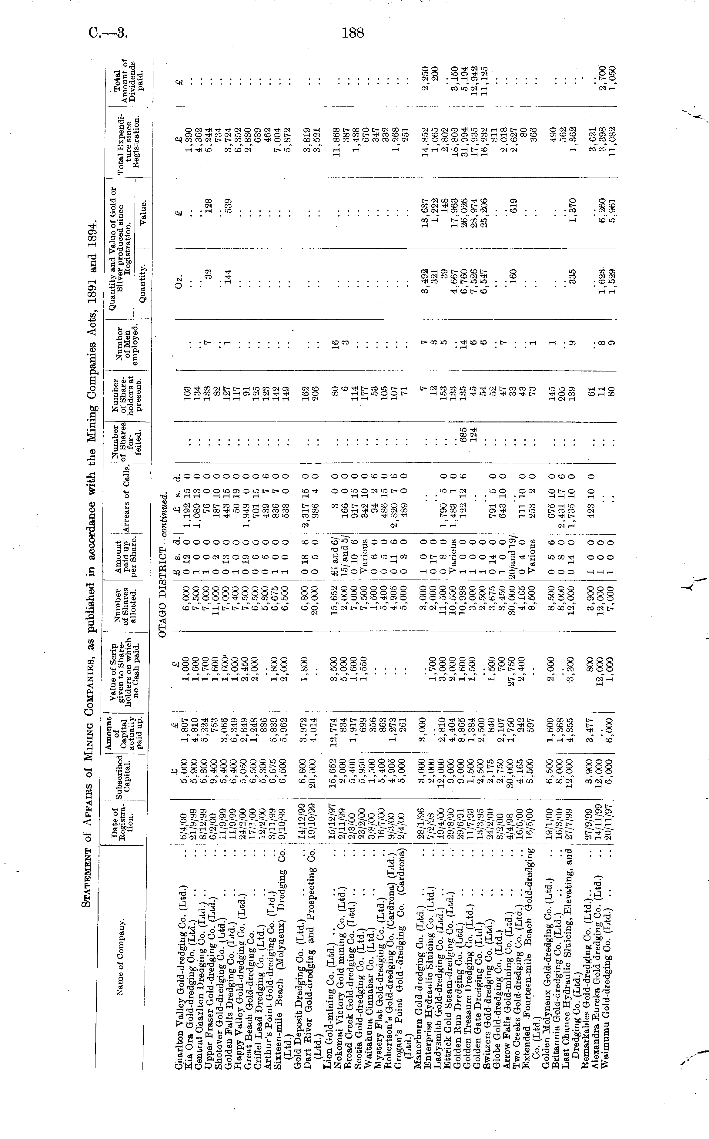 Name of Company. Date of - - .. J m^ f unt Value of Scrip „ . , t Number Number paid up. no oasn paia. « j feited. present. Number of Men Quantity and Value of Gold or Silver produced since Registration. T °\ a Sc n e di - Amount 1 of EeSfon. Dividend, Quantity. Value. iTAGO DII ITRICT-c •■ontinued. Charlton Valley Gold-dredging Co. (Ltd.) Kia Ora Gold-dredging Co. (Ltd.) Central Charlton Dredging Co. (Ltd ) Upper Fraser Gold-dredgina Co (Ltd ) Shotover Gold-dredging Co. (Ltd ) Golden Falls Dredging Co. (Ltd.) .! Happy Valley Gold-dredging Co. (Ltd.)' Great Beach Gold-dredgmg Co. .. Crifiel Lead Dredging Co. (Ltd.) Arthur's Point Gold-dredging Co. (Ltd.)" Sixteen-mile Beach (Molyneux) Dredging Co. (Ltd.) Gold Deposit Dredging Co. (Ltd.) Dart River Gold-dredging and Prospecting Co. (Ltd.) Lion Gold-mining Co. (Ltd.) .. Nokomai Victory Gold mining Co. (Ltd.) '! Broad Creek Gold-dredging- Co. (Ltd.) Scotia Gold-dredging Co. (Ltd.)' Waitahuna Cinnabar Co. (Ltd.) Mystery Flat Gold-dredging Co. (Ltd.) '.. Robertson's Gold-dredging Co. (Cardrona) (Ltd.) Grogan's Point Gold-dredging Co. (Cardrona) (Ltd.) Manorburn Gold-dredging Co. (Ltd.) Enterprise Hydraulic Sluicing Co. (Ltd.) .. Ladysmith Gold-dredging Co. (Ltd.) .. Ettrick Gold Steam-dredging Co. (Ltd.) Golden Run Dredging Co. (Ltd.) Golden Treasure Dredging Co. (Ltd.) '.'. ,. Golden Gate Dredging Co. (Ltd.) .. .. Switzers Gold-dredging Co. (Ltd.) .. " Globe Gold-dredging Co. (Ltd.) .. .", Arrow Falls Gold-mining Co. (Ltd.) '.'. .. Two Creeks Gold-dredging Co. (Ltd.) .. .. Extended Fourteen-mile Beach Goid-dredgine Co. (Ltd.) S B Golden Molyneux Gold-dredging Co. (Ltd.) Britannia Gold-dredging Co. (Ltd.) .: Last Chance Hydraulic Sluicing, Elevating, and Dredging Co. (Ltd.) Remarkabies Gold-dredging Co. (Ltd.) Alexandra Eureka Gold-dredging Co. (Ltd.) Waimumu Gold-dredging Co. (Ltd.) .. 6/4/00 21/9/99 8/12/99 6/2/00 11/9/99 11/9/99 24/2/00 17/1/00 12/2/00 3/11/99 9/10/99 5,000 5,900 5,300 9,400 5,400 6,400 5,050 6,500 5,300 6,675 6,500 £ 1,807 4,810 5,224 753 3,066 6,349 2,849 1,248 886 5,839 5,962 £ 1,000 1,600 1,700 1,600 1,600' 1,000 2,450 2,000 6,000 7,500 7,000 11,000 7,000 7,400 7,500 6,500 5,300 6,675 6,500 £ s. d. 0 12 0 10 0 10 0 0 2 0 0 13 0 I 10 0 0 19 0 0 6 0 0 5 0 10 0 10 0 £ s. d. 1,192 15 0 1,089 13 0 76 0 0 187 10 0 443 15 0 50 19 0 1,949 0 0 701 15 0 439 7 6 836 7 0 538 0 0 103 134 138 82 127 117 91 125 123 142 149 7 1 Oz. 32 144 £ 128 539 £ 1,390 4,362 5,244 734 3,724 6,352 2,830 639 462 7,004 5,872 £ 1,800 2,000 14/12/99 19/10/99 6,800 20,000 3,972 4,014 1,800 6,800 20,000 0 18 6 0 5 0 2,317 15 0 986 4 0 162 206 3,819 3,521 15/12/97 2/11/99 2/3/00 23/2/00 3/8/00 16/7/00 9/3/00 2/4/00 15,652 2,000 5,400 5,950 1,500 5,400 4,905 5,000 12,774 834 1,917 699 356 863 1,273 261 3,500 5,000 1,600 1,550 15,652 2,000 7,000 7,500 1,500 5,400 4,905 5,000 £1 and 6/ 1 15/ and 5/ 0 10 6 I Various 0 6 0 0 5 0 0 11 6 ! 0 3 0 3 0 0 166 0 0 917 15 0 342 10 0 94 2 6 486 15 0 2,820 7 6 489 0 0 80 6 114 177 53 105 107 71 16 3 11,868 387 1,438 670 347 332 1,268 251 28/1/96 7/2/98 19/4/00 29/8/90 29/6/91 11/7/93 13/3/95 24/2/00 3/2/00 4/4/98 16/6/00 16/5/00 3,000 2,000 12,000 9,000 9,000 1,500 2,500 2,175 2,750 30,000 4,165 8,500 3,000 2,810 4,404 8,865 1,384 2,500 840 2,107 1,750 242 597 1,700 3,000 2,000 1,600 1,500 3,000 2,000 11,500 10,500 10,9S8 3,000 2,500 3,675 3,450 30,000 4,165 8,500 10 0 0 17 0 0 8 0 Various 10 0 10 0 10 0 0 14 0 10 0 20/andl9/ 0 4 0 Various 1,790 5 0 1,483 1 0 122 12 6 685 124 7 12 153 133 135 45 54 52 47 33 43 73 7 3 5 14 6 6 3,492 321 39 4,667 6,760 7,526 6,547 13,637 1,222 148 17,963 26,026 28,974 25,206 14,852 1,065 2,802 18,803 31,994 17,935 16,232 811 2,018 2,627 80 366 2,250 200 3,150 5,194 12,942 11,125 1,500 700 27,750 2,400 791 5 0 643 10 0 7 160 619 111 10 0 253 2 0 1 19/1/00 16/3/00 27/7/99 6,500 8,000 12,000 1,600 1,368 4,355 2,000 8,500 8,000 12,000 0 5 6 0 8 0 0 14 0 675 10 0 2,431 17 6 1,735 10 0 145 205 139 1 490 562 1,362 3,300 9 335 1,370 27/9/99 14/11/99 20/11/97 3,900 12,000 6,000 3,477 800 12,000 1,000 3,900 12,000 7,000 10 0 10 0 10 0 423 10 0 61 11 80 8 9 1,623 1,529 6,260 3,621 3,398 2,700 6,000