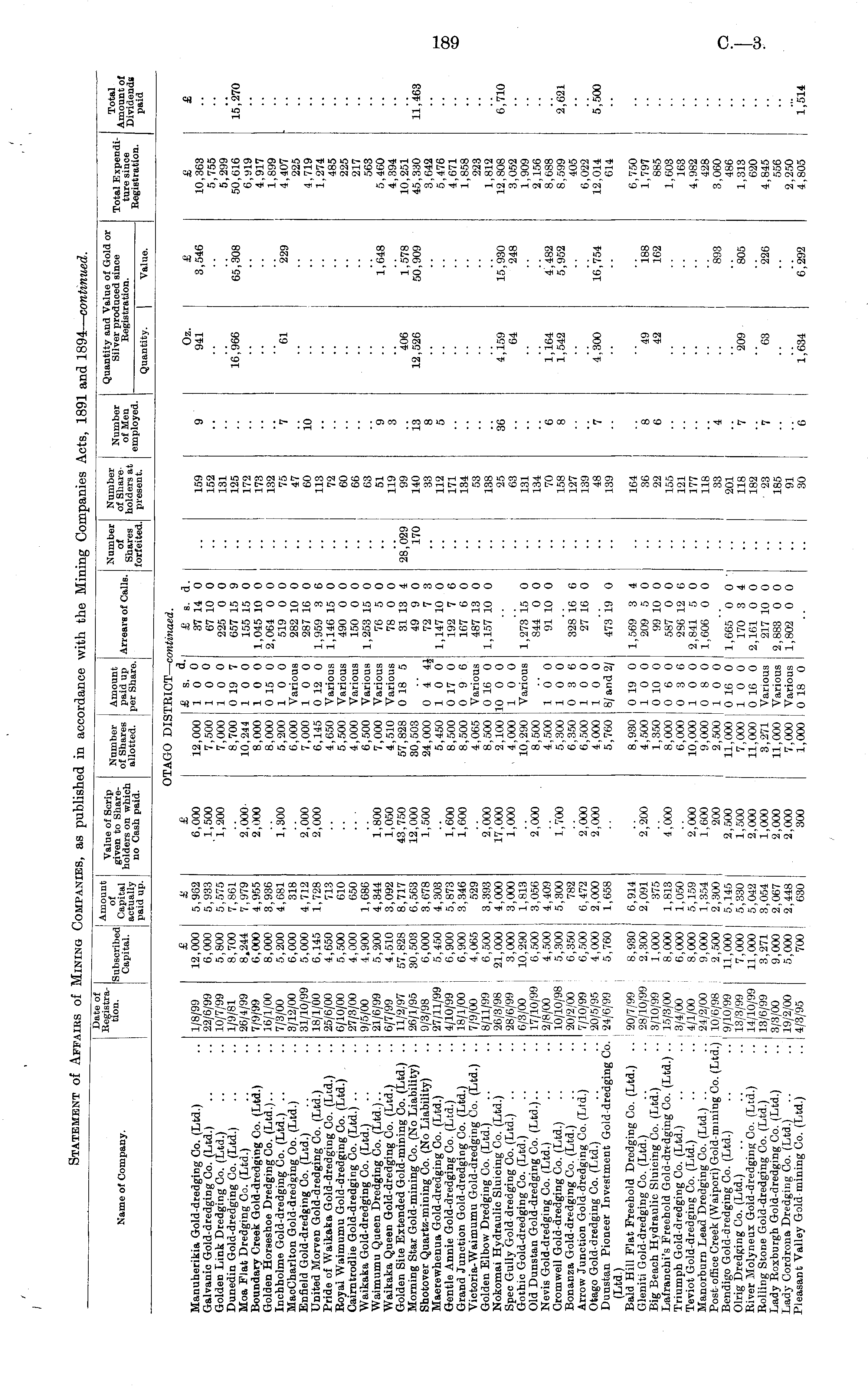 Name of Company. Date of 7 I " Begistra- Amount value of Scrip „ . . Number Number Quantity and Value of Gold or tion. Subscribed „ °' . given to Share- dumber Amount iNumoer «u™°er Number Silver produced since Total Expenditure since Total Amount of Dividends Quantity. Value. O , 'AGO DIS' TRICT— c< 1 0 0 1 0 0 10 0 0 19 7 10 0 10 0 0 15 0 10 0 Various 10 0 0 12 0 Various Various Various Various Various Various 0 18 5 ntinaed. Manuherikia Gold-dredging Co. (Ltd.) Galvanic Gold-dredging Co. (Ltd.) Golden Link Dredging Co. (Ltd.) Dunedin Gold-dredging Co. (Ltd.) Moa Plat Dredging Co. (Ltd.) Boundary Creek Gold-dredging Co. (Ltd.) Golden Horseshoe Dredging Co. (Ltd.).. Inohholme Gold-dredging Co. (Ltd.) MaeCharlton Gold-dredging Oo. (Ltd.) Enfield Gold-dredging Co. (Ltd.) United Morven Gold-dredging Co. (Ltd.) Pride of Waikaka Gold-dredging Co. (Ltd.) Royal Waimumu Gold-dredging Co. (Ltd.) Cairntrodlie Gold-dredging Co. (Ltd.) Waikaka Gold-dredging Co. (Ltd.) Waimumu Queen Dredging Co. (Ltd.) Waikaka Queen Gold-dredging Co. (Ltd.) Golden Site Extended Gold-mining Co. (Ltd.) .. Morning Star Gold-mining Co. (No Liability) .. Shotover Quartz-mining Co. (No Liability) Maerewhenua Gold-dredging Co. (Ltd.) Gentle Annie Gold-dredging Co. (Ltd.) Grand Junction Gold-dredging Co. (Ltd.) Victoria-Waimumu Gold-dredging Co. (Ltd.) .. Golden Elbow Dredging Co. (Ltd.) Nokomai Hydraulic Sluicing Co. (Ltd.) Spec Gully Gold dredging Co. (Ltd.) .. Gothic Gold-dredging Co. (Ltd.) Old Dunstan Gold-dredging Co. (Ltd.) Nevis Gold-dredging Co. (Ltd.) Cromwell Gold-dredging Co. (Ltd.) Bonanza Gold-dredging Co. (Ltd.) Arrow Junction Gold-dredging Co. (Ltd.) Otago Gold-dredging Co. (Ltd.) Duustan Pioneer Investment Gold-dredging Co. (Ltd.) Bald Hill Plat Freehold Dredging Co. (Ltd.) .. Gleniti Gold-dredging Co. (Ltd.) Big Beach Hydraulic Sluicing Co. (Ltd.) Lafranchi's Freehold Gold-dredging Co. (Ltd.) .. Triumph Gold-dredging Co. (Ltd.) Teviot Gold-dredging Co. (Ltd.) Manorburn Lead Dredging Co. (Ltd.) Post office Creek (Waipori) Gold-mining Co. (Ltd.) Bendigo Gold-dredging Co. (Ltd.) Olrig Dredging Co. (Ltd.) River Molyneux Gold-dredging Co. (Ltd.) Rolling Stone Gold-dredging Co. (Ltd.) Lady Roxburgh Gold-dredging Co. (Ltd.) Lady Cordrona Dredging Co. (Ltd.) Pleasant Valley Gold mining Co. (Ltd.) 1/8/99 12,000 22/6/99 6,000 10/7/99 5,800 1/9/81 8,700 26/4/99 8.244 7/9/99 6,000 16/1/00 8,000 7/3/00 5,200 3/12/00 6,000 31/10/99 5,000 18/1/00 6,145 25/6/00 4,650 6/10/00 5,500 27/3/00 4,000 9/5/00 4,900 21/6/99 5,200 6/7/99 4,510 11/2/97 57,828 26/1/95 30,503 9/3/98 6,000 27/11/99 5.450 4/10/99 6,900 18/1/00 6,900 7/9/00 4,065 8/11/99 6,500 26/3/98 , 21,000 28/6/99 3,000 6/3/00 ' 10,290 17/10/99 6,500 2/8/00 4,500 10/10/98 5,300 20/2/00 6,350 7/10/99 6,500 20/5/95 4,000 24/6/99 5,760 £ 5,982 5,933 5,575 7,861 7,979 4,955 3,936 4,681 318 4,712 1,728 713 610 650 1,686 4,344 3,092 8,717 6,563 3,678 4,303 5,873 3,346 529 3,393 4,000 3,000 1,813 3,056 4,409 5,300 782 6,472 2,000 1,658 £ 6,000 1,500 1,200 12,000 7,500 7,000 8,700 I 10,244 i 8,000 8,000 5,200 6,000 7,000 6,145 4,650 • 5,500 4,000 6,500 7,000 4,510 57,828 30,503 24,000 5,450 8,500 I 8,500 ! 4,065 I 8,500 ! 2,100 < 4,000 10,290 8,500 4,500 5,300 6,350 6,500 I 4,000 I 5,760 £ s. d. 37 14 0 67 10 0 225 0 0 657 15 9 155 15 0 1,045 10 0 2,064 0 0 519 0 0 282 10 0 287 16 0 1,959 3 6 1.146 15 0 490 0 0 150 0 0 1,253 15 0 76 5 0 78 0 0 31 13 4 49 9 0 72 7 3 1.147 10 0 192 7 6 167 6 0 487 13 0 1,157 10 0 159 152 131 125 172 173 132 75 47 60 113 72 60 66 63 51 119 99 140 33 112 171 134 53 138 25 63 131 134 70 158 127 139 48 139 9 Oz. 941 £ 3,546 £ 10,363 5,755 5,299 50,616 6,yl9 4,917 1,899 4,407 225 4,719 1,274 485 225 217 563 5,460 4,394 10,251 45,330 3,642 5,476 4,671 1,858 223 1,812 12,808 3,052 1,909 2,156 8,688 8,599 405 6,022 12,014 614 £ 2,000 2,000 16,966 65,308 15,270 1J300 7 "61 229 2,000 2,000 10 1,800 1,050 43,750 12,000 1,500 28,029 170 3 406 12,526 1,648 1,578 50,909 0 4 4J 10 0 0 17 0 0 96 Various 0 16 0 10 0 0 10 0 Various 13 8 5 11 i463 1,600 1,600 2,000 17,000 1,000 36 4,159 64 15,930 248 6^710 2,000 10 0 10 0 : o 3 6 I 1 0 0 10 0 ] 8/ and 2/ 1,273 15 0 844 0 0 91 10 0 1,700 6 8 1,164 1,542 4,482 5,952 2,621 2,000 2,000 328 16 6 27 16 0 473 19 0 7 4^300 16,754 5^500 20/7/99 8,930 28/10/99 2,300 3/10/99 1,000 15/3/00 I 8,000 3/4/00 6,000 4/1/00 8,000 24/2/00 9,000 10/6/98 2,500 9/10/99 11,000 13/3/99 7,000 14/10/99 11,000 13/6/99 3,271 3/3/00 9,000 19/2/00 5,000 4/3/95 700 6,914 2,091 375 1,813 1,050 5,159 1,354 2,300 5,145 5,330 5,042 3,054 2,067 2,448 630 2,200 4,000 2,000 1,600 200 2,500 1,500 2,000 1,000 2,000 2,000 300 8,930 4,500 1,350 8,000 6,000 10,000 9,000 j 2,500 11,000 7,000 11,000 3,271 11,000 7,000 1,000 0 19 0 10 0 0 10 0 0 6 0 0 3 6 10 0 0 8 0 10 0 0 16 0 10 0 0 16 0 Various Various Various 0 18 Oi 1,569 3 4 209 5 0 99 10 0 587 0 0 2S6 12 6 2,841 5 0 1,606 0 0 164 36 22 155 121 177 118 33 201 118 182 23 185 91 30 8 6 4 49 42 188 162 893 6,750 1,797 885 1,603 163 4,982 428 3,060 486 1,313 620 4,845 556 2,250 4,805 1,665 0 0 ' 170 3 4 2,161 0 0 217 10 0 2,883 0 0 1,802 0 0 7 7 209 "63 805 226 6 1,634 6,292 1,514