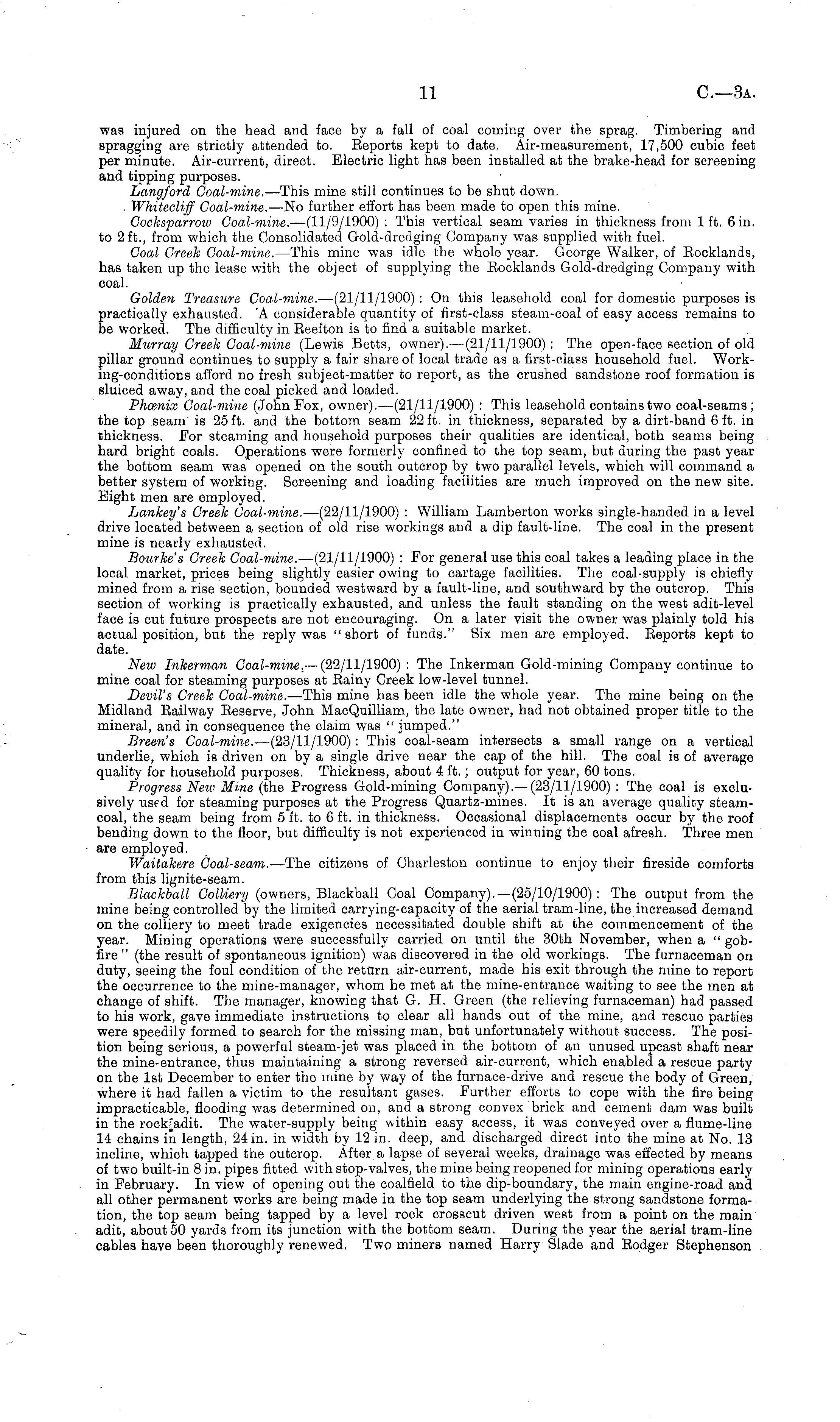 was injured on the head and face by a fall of coal coming over the sprag. Timbering and spragging are strictly attended to. Beports kept to date. Air-measurement, 17,500 cubic feet per minute. Air-current, direct. Electric light has been installed at the brake-head for screening and tipping purposes. Langford Goal-mine. —This mine still continues to be shut down. Whitecliff Goal-mine. —No further effort has been made to open this mine. Cocksparroiv Coal-mine. —(11/9/1900) : This vertical seam varies in thickness from lft. 6 in. to 2ft., from which the Consolidated Gold-dredging Company was supplied with fuel. Coal Greek Coal-mine. —This mine was idle the whole year. George Walker, of Bocklands, has taken up the lease with the object of supplying the Bocklands Gold-dredging Company with coal. Golden Treasure Coal-mine. —(21/11/1900): On this leasehold coal for domestic purposes is practically exhausted. "A considerable quantity of first-class steam-coal of easy access remains to be worked. The difficulty in Beefton is to find a suitable market. Murray Creek Coal-mine (Lewis Betts, owner). —(21/11/1900): The open-face section of old pillar ground continues to supply a fair share of local trade as a first-class household fuel. Work-ing-conditions afford no fresh subject-matter to report, as the crushed sandstone roof formation is sluiced away, and the coal picked and loaded. Phoenix Goal-mine (John Fox, owner). —(21/11/1900) : This leasehold contains two coal-seams; the top seam is 25 ft. and the bottom seam 22 ft. in thickness, separated by a dirt-band 6 ft. in thickness. For steaming and household purposes their qualities are identical, both seams being hard bright coals. Operations were formerly confined to the top seam, but during the past year the bottom seam was opened on the south outcrop by two parallel levels, which will command a better system of working. Screening and loading facilities are much improved on the new site. Eight men are employed. Lankey's Creek Coal-mine. —(22/11/1900) : William Lamberton works single-handed in a level drive located between a section of old rise workings and a dip fault-line. The coal in the present mine is nearly exhausted. Bourke's Greek Coal-mine. —(2l/11/1900) : For general use this coal takes a leading place in the local market, prices being slightly easier owing to cartage facilities. The coal-supply is chiefly mined from a rise section, bounded westward by a fault-line, and southward by the outcrop. This section of working is practically exhausted, and unless the fault standing on the west adit-level face is cut future prospects are not encouraging. On a later visit the owner was plainly told his actual position, but the reply was "short of funds." Six men are employed. Beports kept to date. New Inkerman Coal-mine,-— (22/11/1900) : The Inkerman Gold-mining Company continue to mine coal for steaming purposes at Bainy Creek low-level tunnel. Devil's Creek Coal-mine. —This mine has been idle the whole year. The mine being on the Midland Bailway Beserve, John MacQuilliam, the late owner, had not obtained proper title to the mineral, and in consequence the claim was " jumped." Breen's Coal-mine. —(23/11/1900): This coal-seam intersects a small range on a vertical underlie, which is driven on by a single drive near the cap of the hill. The coal is of average quality for household purposes. Thickness, about 4 ft.; output for year, 60 tons. Progress New Mine (the Progress Gold-mining Company).— (23/11/1900) : The coal is exclusively used for steaming purposes at the Progress Quartz-mines. It is an average quality steamcoal, the seam being from 5 ft. to 6 ft. in thickness. Occasional displacements occur by the roof bending down to the floor, but difficulty is not experienced in winning the coal afresh. Three men are employed. Waitakere Coal-seam. —The citizens of Charleston continue to enjoy their fireside comforts from this lignite-seam. Blackball Colliery (owners, Blackball Coal Company).—(2s/10/1900): The output from the mine being controlled by the limited carrying-capacity of the aerial tram-line, the increased demand on the colliery to meet trade exigencies necessitated double shift at the commencement of the year. Mining operations were successfully carried on until the 30th November, when a " gobfire " (the result of spontaneous ignition) was discovered in the old workings. The furnaceman on duty, seeing the foul condition of the return air-current, made his exit through the mine to report the occurrence to the mine-manager, whom he met at the mine-entrance waiting to see the men at change of shift. The manager, knowing that G. H. Green (the relieving furnaceman) had passed to his work, gave immediate instructions to clear all hands out of the mine, and rescue parties were speedily formed to search for the missing man, but unfortunately without success. The position being serious, a powerful steam-jet was placed in the bottom of an unused upcast shaft near the mine-entrance, thus maintaining a strong reversed air-current, which enabled a rescue party on the Ist December to enter the mine by way of the furnace-drive and rescue the body of Green, where it had fallen a victim to the resultant gases. Further efforts to cope with the fire being impracticable, flooding was determined on, and a strong convex brick and cement dam was built in the The water-supply being within easy access, it was conveyed over a flume-line 14 chains in length, 24 in. in width by 12 in. deep, and discharged direct into the mine at No. 13 incline, which tapped the outcrop. After a lapse of several weeks, drainage was effected by means of two built-in 8 in. pipes fitted with stop-valves, the mine being reopened for mining operations early in February. In view of opening out the coalfield to the dip-boundary, the main engine-road and all other permanent works are being made in the top seam underlying the strong sandstone formation, the top se