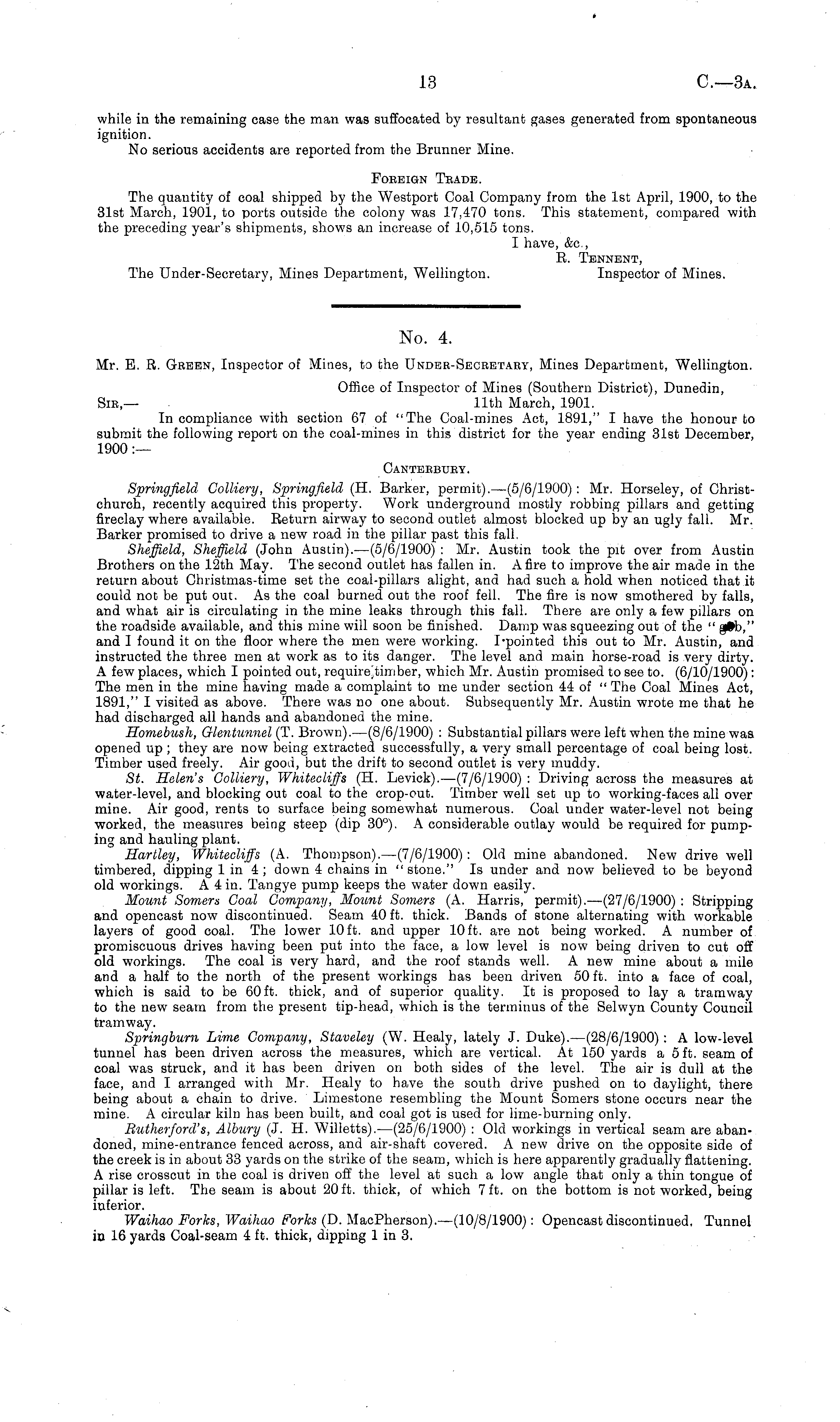No. 4. Mr. E. R. Green, Inspector of Mines, to the Under-Secretary, Mines Department, Wellington. Office of Inspector of Mines (Southern District), Dunedin, Sir,— 11th March, 1901. In compliance with section 67 of "The Coal-mines Act, 1891," I have the honour to submit the following report on the coal-mines in this district for the year ending 31st December, 1900 :— Cantebbury. Springfield Colliery, Springfield (H. Barker, permit).—(s/6/1900) : Mr. Horseley, of Christchurch, recently acquired this property. Work underground mostly robbing pillars and getting fireclay where available. Return airway to second outlet almost blocked up by an ugly fall. Mr. Barker promised to drive a new road in the pillar past this fall. Sheffield, Sheffield (John Austin). —(5/6/1900) : Mr. Austin took the pit over from Austin Brothers on the 12th May. I'he second outlet has fallen in. Afire to improve the air made in the return about Christmas-time set the coal-pillars alight, and had such a hold when noticed that it could not be put out. As the coal burned out the roof fell. The fire is now smothered by falls, and what air is circulating in the mine leaks through this fall. There are only a few pillars on the roadside available, and this mine will soon be finished. Damp was squeezing out of the " §#b," and I found it on the floor where the men were working. I-pointed this out to Mr. Austin, and instructed the three men at work as to its danger. The level and main horse-road is very dirty. A few places, which I pointed out, require'timber, which Mr. Austin promised to see to. (6/10/1900): The men in the mine having made a complaint to me under section 44 of " The Coal Mines Act, 1891," I visited as above. There was no one about. Subsequently Mr. Austin wrote me that he had discharged all hands and abandoned the mine. Homebush, Glentunnel (T. Brown). —(8/6/1900) : Substantial pillars were left when the mine was opened up ; they are now being extracted successfully, a very small percentage of coal being lost. Timber used freely. Air good, but the drift to second outlet is very muddy. St. Helen's Colliery, Whitecliffs (H. Levick). —(7/6/1900) : Driving across the measures at water-level, and blocking out coal to the crop-out. Timber well set up to working-faces all over mine. Air good, rents to surface being somewhat numerous. Coal under water-level not being worked, the measures being steep (dip 30°). A considerable outlay would be required for pumping and hauling plant. Hartley, Whitecliffs (A. Thompson).—(7/6/1900) : Old mine abandoned. New drive well timbered, dipping lin 4 ; down 4 chains in " stone." Is under and now believed to be beyond old workings. A 4 in. Tangye pump keeps the water down easily. Mount Somers Coal Company, Mount Somers (A. Harris, permit).—(27/6/1900) : Stripping and opencast now discontinued. Seam 40 ft. thick. Bands of stone alternating with workable layers of good coal. The lower 10 ft. and upper 10 ft. are not being worked. A number of promiscuous drives having been put into the face, a low level is now being driven to cut off old workings. The coal is very hard, and the roof stands well. A new mine about a mile and a half to the north of the present workings has been driven 50 ft. into a face of coal, which is said to be 60ft. thick, and of superior quality. It is proposed to lay a tramway to the new seam from the present tip-head, which is the terminus of the Selwyn County Council tramway. Springburn Lime Company, Staveley (W. Healy, lately J. Duke). —(28/6/1900): A low-level tunnel has been driven across the measures, which are vertical. At 150 yards a 5 ft. seam of coal was struck, and it has been driven on both sides of the level. The air is dull at the face, and I arranged with Mr. Healy to have the south drive pushed on to daylight, there being about a chain to drive. Limestone resembling the Mount Somers stone occurs near the mine. A circular kiln has been built, and coal got is used for lime-burning only. Rutherford's, Albury (J. H. Willetts). —(25/6/1900) : Old workings in vertical seam are abandoned, mine-entrance fenced across, and air-shaft covered. A new drive on the opposite side of the creek is in about 33 yards on the strike of the seam, which is here apparently gradually flattening. A rise crosscut in the coal is driven off the level at such a low angle that only a thin tongue of pillar is left. The seam is about 20 ft. thick, of which 7 ft. on the bottom is not worked, being inferior. Waihao Forks, Waihao Forks (D. MacPherson). —(10/8/1900): Opencast discontinued. Tunnel in 16 yards Coal-seam 4 ft. thick, dipping 1 in 3.