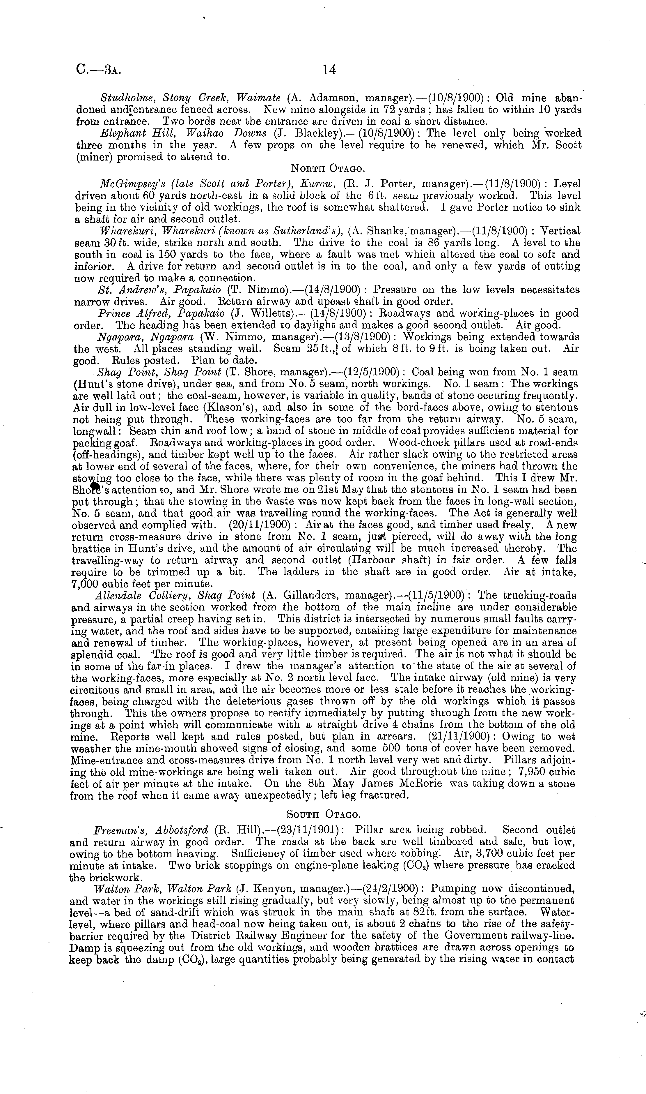 Studholme, Stony Creek, Waimate (A. Adamson, manager).—(lo/8/1900): Old mine abandoned fenced across. New mine alongside in 72 yards ; has fallen to within 10 yards from entrance. Two bords near the entrance are driven in coal a short distance. Elephant Hill, Waihao Downs (J. Blackley).—(lo/8/1900): The level only being worked three months in the year. A few props on the level require to be renewed, which Mr. Scott (miner) promised to attend to. North Otago. McGimpsey's (late Scott and Porter), Kurow, (R. J. Porter, manager).—(ll/8/1900) : Level driven about 60 yards north-east in a solid block of the 6 ft. seaiu previously worked. This level being in the vicinity of old workings, the roof is somewhat shattered. I gave Porter notice to sink a shaft for air and second outlet. Wharekuri, Wharekuri (known as Sutherland's), (A. Shanks, manager).—(ll/8/1900) : Vertical seam 30 ft. wide, strike north and south. The drive to the coal is 86 yards long. A level to the south in coal is 150 yards to the face, where a fault was met which altered the coal to soft and inferior. A drive for return and second outlet is in to the coal, and only a few yards of cutting now required to make a connection. St. Andrew's, Papakaio (T. Nimmo). —(14/8/1900) : Pressure on the low levels necessitates narrow drives. Air good. Return airway and upcast shaft in good order. Prince Alfred, Papakaio (J. Willetts). —(14/8/1900) : Roadways and working-places in good order. The heading has been extended to daylight and makes a good second outlet. Air good. Ngapara, Ngapara (W. Nimmo, manager).—(l 3/8/1900) : Workings being extended towards the west. All places standing well. Seam 25 ft.,| of which Bft. to 9 ft. is being taken out. Air good. Rules posted. Plan to date. Shag Point, Shag Point (T. Shore, manager). —(12/5/1900): Coal being won from No. 1 seam (Hunt's stone drive), under sea, and from No. 5 seam, north workings. No. 1 seam : The workings are well laid out; the coal-seam, however, is variable in quality, bands of stone occuring frequently. Air dull in low-level face (Klason's), and also in some of the bord-faces above, owing to stentons not being put through. These working-faces are too far from the return airway. No. 5 seam, longwall: Seam thin and roof low; a baud of stone in middle of coal provides sufficient material for packing goaf. Roadways and working-places in good order. Wood-chock pillars used at road-ends (off-headings), and timber kept well up to the faces. Air rather slack owing to the restricted areas at lower end of several of the faces, where, for their own convenience, the miners had thrown the stowing too close to the face, while there was plenty of room in the goaf behind. This I drew Mr. Shore's attention to, and Mr. Shore wrote me on 21st May that the stentons in No. 1 seam had been put through; that the stowing in the waste was now kept back from the faces in long-wall section, No. 5 seam, and that good air was travelling round the working-faces. The Act is generally well observed and complied with. (20/11/1900) : Air at the faces good, and timber used freely. Anew return cross-measure drive in stone from No. 1 seam, jus* pierced, will do away with the long brattice in Hunt's drive, and the amount of air circulating will be much increased thereby. The travelling-way to return airway and second outlet (Harbour shaft) in fair order. A few falls require to be trimmed up a bit. The ladders in the shaft are in good order. Air at intake, 7,000 cubic feet per minute. Allendale Colliery, Shag Point (A. Gillanders, manager). —(11/5/1900): The trucking-roads and airways in the section worked from the bottom of the main incline are under considerable pressure, a partial creep having set in. This district is intersected by numerous small faults carrying water, and the roof and sides have to be supported, entailing large expenditure for maintenance and renewal of timber. The working-places, however, at present being opened are in an area of splendid coal. The roof is good and very little timber is required. The air is not what it should be in some of the far-in places. I drew the manager's attention to'the state of the air at several of the working-faces, more especially at No. 2 north level face. The intake airway (old mine) is very circuitous and small in area, and the air becomes more or less stale before it reaches the workingfaces, being charged with the deleterious gases thrown off by the old workings which it passes through. This the owners propose to rectify immediately by putting through from the new workings at a point which will communicate with a straight drive 4 chains from the bottom of the old mine. Reports well kept and rules posted, but plan in arrears. (21/11/1900) : Owing to wet weather the mine-mouth showed signs of closing, and some 500 tons of cover have been removed. Mine-entrance and cross-measures drive from No. 1 north level very wet and dirty. Pillars adjoining the old mine-workings are being well taken out. Air good throughout the mine; 7,950 cubic feet of air per minute at the intake. On the Bth May James Mcßorie was taking down a stone from the roof when it came away unexpectedly; left leg fractured. South Otago. Freeman's, Abbotsford (R. Hill). —(23/11/1901): Pillar area being robbed. Second outlet and return airway in good order. The roads at the back are well timbered and safe, but low, owing to the bottom heaving. Sufficiency of timber used where robbing. Air, 3,700 cubic feet per minute at intake. Two brick stoppings on engine-plane leaking (CO 2 ) where pressure has cracked the brickwork. Walton Park, Walton Park (J. Kenyon, manager.) —(24/2/1900): Pumping now discontinued, and water in the workings still rising gradually, but very slowly, being almost up to the permanent l eve l— a bed of sand-drift which was struck in the main shaft at 82 ft. from the surface. Waterlevel, where pillars and head-coal now being taken out, is about 2 chains to 