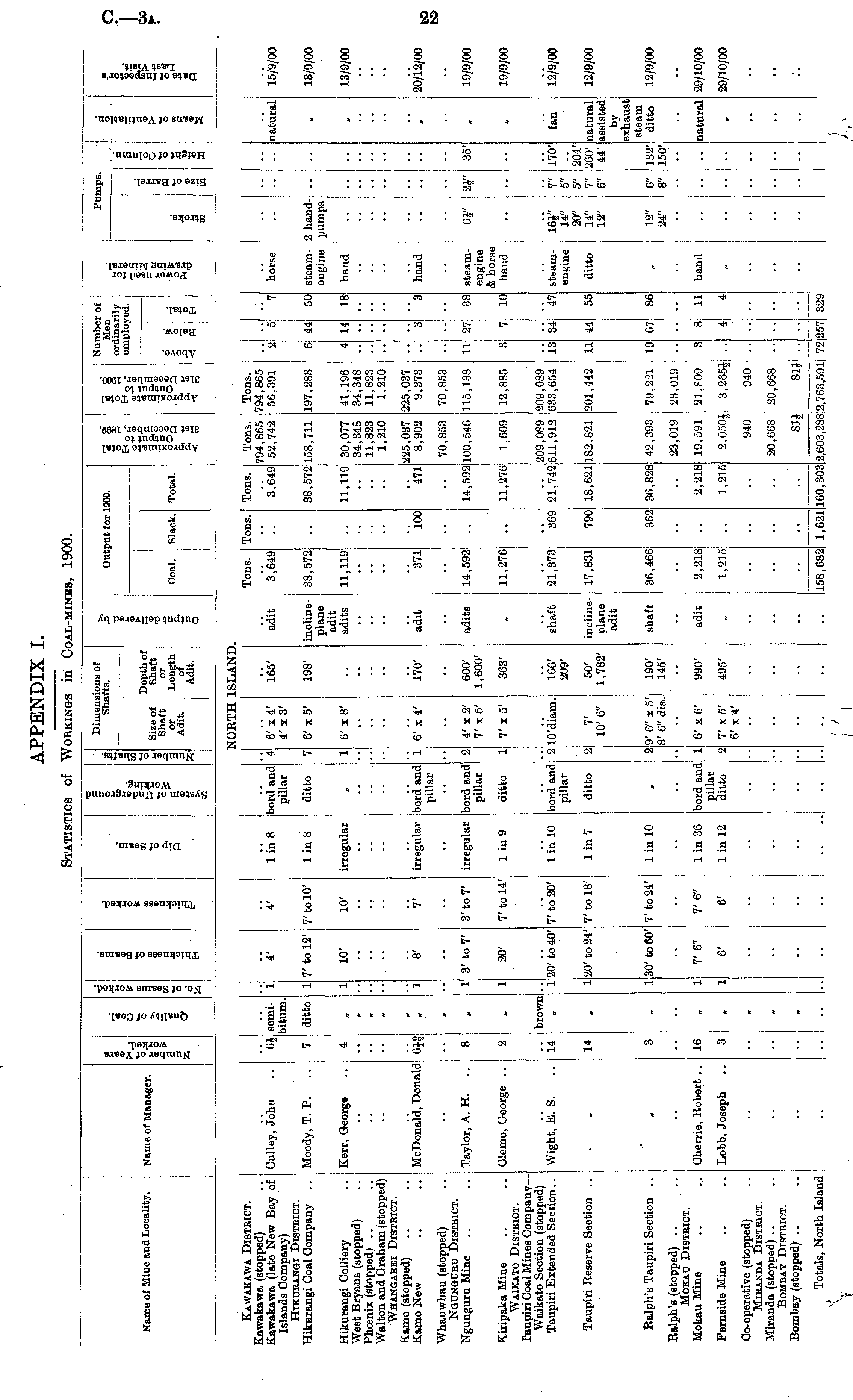 Name of Mine ana Locality. Name of Manager. as 1 o 1 c a 1 S O a 3 s a a> •s 5 Depth of Size of Shaft Shaft or or Length Adit. I of Adit. Dimensions of Shafts. > ■a 5 Output for 1900. <1 TO a»g Number of Men ordinarily i employed. i ii S3 a Pumps. pq 'Si O f s a o a n 8 I Coal. Slack. Total. DO NOBTH : SLANI I Kawakawa District. Kawakawa (stopped) Kawakawa (late New Bay of Islands Company) HiKUEANGi District. Hikurangi Coal Company .. 1 6' x 4' 4' x3' 165' adit Tons. Tons. Tons. Tons. 794,865 52,742 Tons. 794,865 56,391 Culley, John k semibitum. i k' . 4' 1 iii 8 1 bord and pillar I 3,649 3^649 •u 5; 7 horse | natural 15/9/00 Moody, T. P. .. ditto V to 12' 7'to 10' 1 in 8 ditto ' 6' x 5' 198' inclineplane adit adits 38,572 38,572 158,711 197,283 44 50! steam- 2 handengine pumps 13/9/00 Hikurangi Colliery West Bryans (stopped) Phcenix (stopped) Walton and Graham (stopped) Whangarei District. Kamo (stopped) Kamo New .. .. j Kerr, George 4 10' 10' irregular . 6' x 8' 11,119 11,119 30,077 34,348 11,823 1,210 41,196 34,348 11,823 1,210 hand 13/9/00 m 4 14 18i •• " .. •• • McDonald, Donald ek ! j . 1 8' r irregular bord and pillar i i 6' I 4' 170' adit - 37l! "ioo 471 225,037 8,902 225,037 9,373 '3 3j hand . •• "■ I 20/12/00 n Whauwhau (stopped) Ngunguru District. Ngunguru Mine i 70,853 70,853 I Taylor, A. H. 8 • 3' to 7' 3'to 7' irregular bord and pillar i 4' x 2' 7' x 5' 600' 1,600' adits 14,592 14,592 100,546 Ill5,138 11 27 38 2J" 35' 19/9/00 firipaka Mine Waikato District. PaupiriCoal Mines Company — Waikato Section (stopped) Taupiri Extended Section.. Clemo, George .. 20' 7'to 14' 1 in 9 11,276 11,276 1,609 12,885 steam- j 6J" engine : & horse hand ' 19/9/00 - i ditto L 7'x5' 363' 7 10; Wight, e'. S. I brown 20' to 40' 7' to 20' 1 in 10 bord and pillar 210'diam. 166' 209' shaft 21 I373 21,742 209,089 611,912 209,089 633,654 steam- 16J" engine ! 14" 20" ditto : 14" 12" fan 12/9/00 11 ! . 1 'a *369 i3 34 47 7" 5" 7" 6" 170' Taupiri Reserve Section .. 20' to 24' 7' to 18' 1 in 7 ditto 2 7' 10' 6" 50' 1,782' inclineplane adit 17,831 790 18,621 182,821 201,442 204' 260' 44' natural assisted by exhaust steam ditto 12/9/00 14 11 44 55 : Ralph's Taupiri Section .. 30' to 60' 7'to 24' 1 in 10 2 9' 6" x 5' j8' 6" dia. 190' 145' shaft 12" 24" 12/9/00 w « 36,466 362 36,828i 42,393 79,221 ! 19 07' S6 8" 132'! 150' Ralph's (stopped) Mokau District. Mokau Mine 23,019 23,019 i •• Cheirie, Robert ., 16 7' 6" 7'6" 1 in 36 bord and pillar ditto l! 6' x6' 990' adit 2,218 2,218 19,591 21,609 i 3 11 band : .. band natural 29/10/00 Fernside Mine Lobb, Joseph 3 * 6' 6' 1 in 12 2j 7' x 5' 6' x 4' 495' '■ 1,215 1,215 2,050J| j 3,2651; 4 4 29/10/00 Co-operative (stopped) Miranda District. Miranda (stopped) .. Bombay District. Bombay (stopped) 940 940 1 " 20,668 20,668 m • 158,682 1,621 160,303 Bit 2,603,288 81J 2,703,591 •■ 72 ■• 257 329! Totals, North Island I