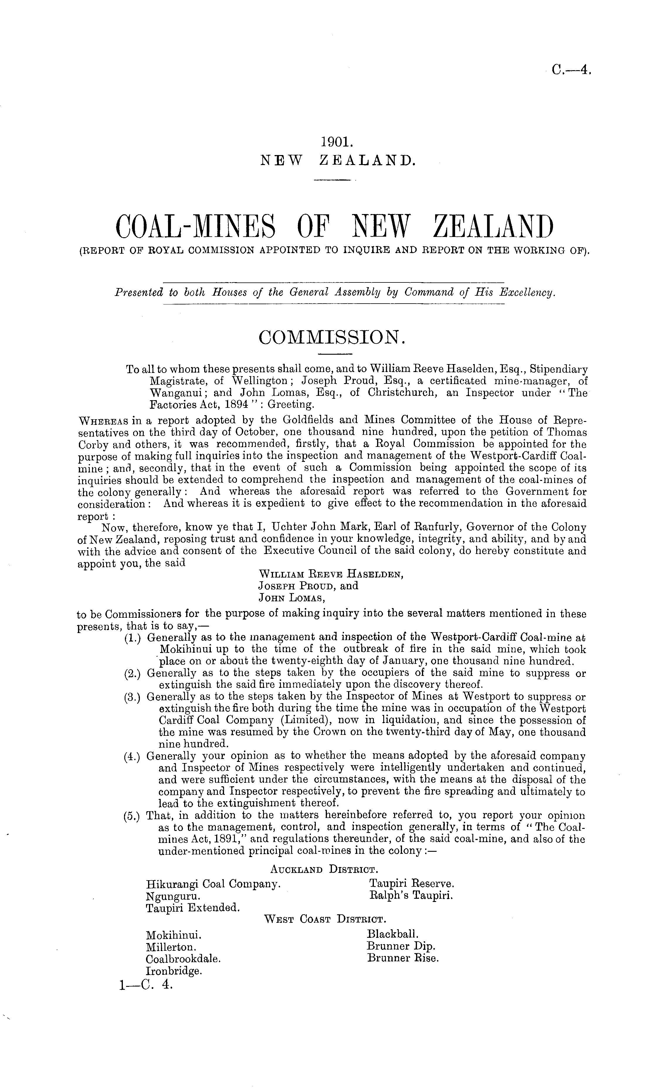 To all to whom these presents shall come, and to William Reeve Haselden, Esq., Stipendiary Magistrate, of Wellington; Joseph Proud, Esq., a certificated mine-manager, of Wanganui; and John Lomas, Esq., of Christchurch, an Inspector under "The Factories Act, 1894 " : Greeting. Whereas in a report adopted by the Goldfields and Mines Committee of the House of Representatives on the third day of October, one thousand nine hundred, upon the petition of Thomas Corby and others, it was recommended, firstly, that a Royal Commission be appointed for the purpose of making full inquiries into the inspection and management of the Westport-Cardiff Coalmine ; and, secondly, that in the event of such a Commission being appointed the scope of its inquiries should be extended to comprehend the inspection and management of the coal-mines of the colony generally : And whereas the aforesaid report was referred to the Government for consideration : And whereas it is expedient to give effect to the recommendation in the aforesaid report : Now, therefore, know ye that I, Uchter John Mark, Earl of Ranfurly, Governor of the Colony of New Zealand, reposing trust and confidence in your knowledge, integrity, and ability, and by and with the advice and consent of the Executive Council of the said colony, do hereby constitute and appoint you, the said William Reeve Haselden, Joseph Proud, and John Lomas, to be Commissioners for the purpose of making inquiry into the several matters mentioned in these presents, that is to say, — (1.) Generally as to the management and inspection of the Westport-Cardiff Coal-mine at Mokihinui up to the time of the outbreak of fire in the said mine, which took place on or about the twenty-eighth day of January, one thousand nine hundred. (2.) Generally as to the steps taken by the occupiers of the said mine to suppress or extinguish the said fire immediately upon the discovery thereof. (3.) Generally as to the steps taken by the Inspector of Mines at Westport to suppress or extinguish the fire both during the time the mine was in occupation of the Westport Cardiff Coal Company (Limited), now in liquidation, and since the possession of the mine was resumed by the Crown on the twenty-third day of May, one thousand nine hundred. (4.) Generally your opinion as to whether the means adopted by the aforesaid company and Inspector of Mines respectively were intelligently undertaken and continued, and were sufficient under the circumstances, with the means at the disposal of the company and Inspector respectively, to prevent the fire spreading and ultimately to lead to the extinguishment thereof. (5.) That, in addition to the matters hereinbefore referred to, you report your opinion as to the management, control, and inspection generally, in terms of " The Coalmines Act, 1891," and regulations thereunder, of the said coal-mine, and also of the under-mentioned principal coal-mines in the colony :— Auckland District. Hikurangi Coal Company. Taupiri Reserve. Ngunguru. Ralph's Taupiri. Taupiri Extended. West Coast District. Mokihinui. Blackball. Millerton. Brunner Dip. Coalbrookdale. Brunner Rise. Ironbridge. I—C. 4.