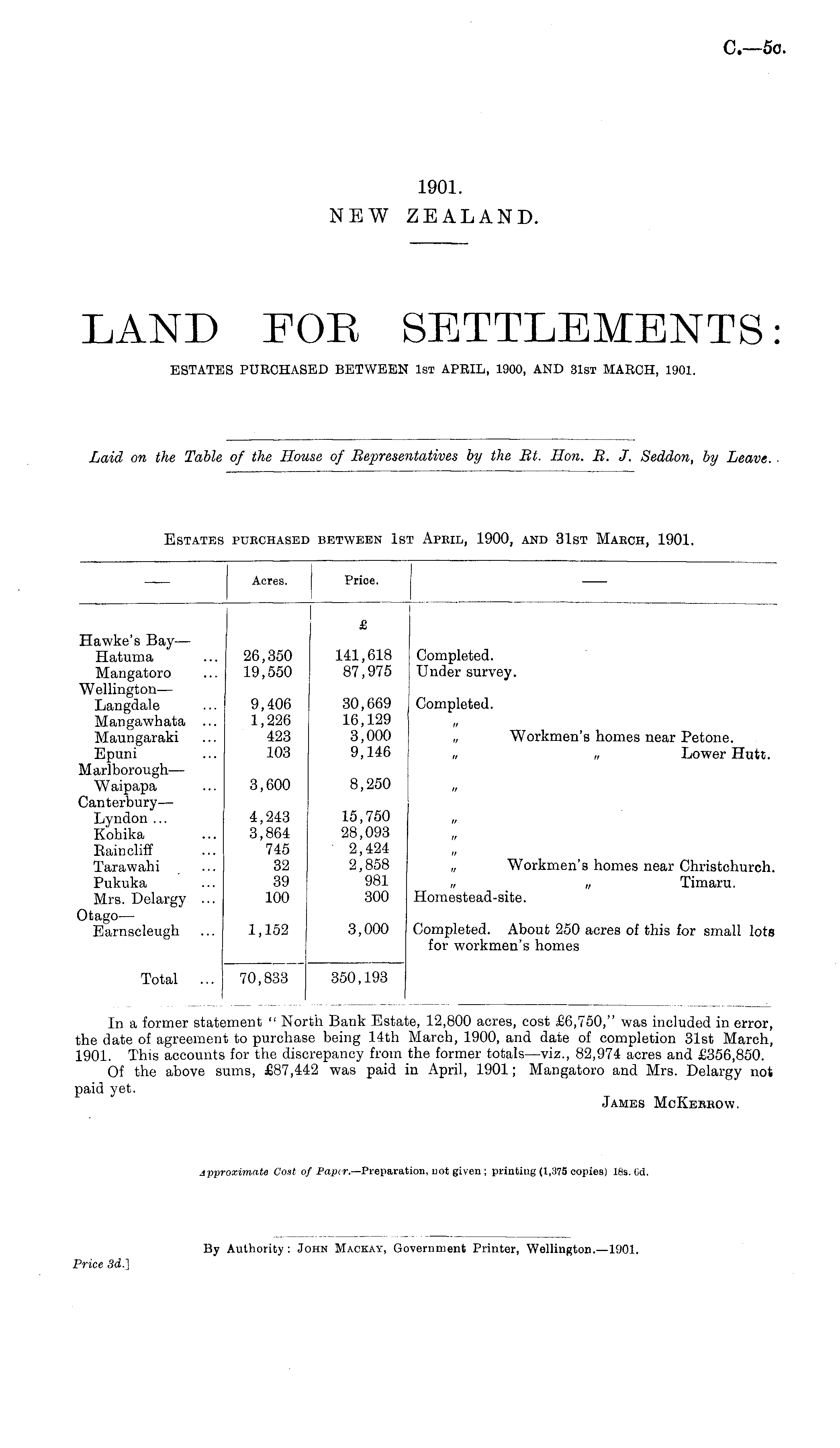 In a former statement " North Bank Estate, 12,800 acres, cost £6,750," was included in error, the date of agreement to purchase being 14th March, 1900, and date of completion 31st March, 1901. This accounts for the discrepancy from the former totals—viz., 82,974 acres and £356,850. Of the above sums, £87,442 was paid in April, 1901; Mangatoro and Mrs. Delargy not paid yet. James McKebeow. Approximate Coat of Paptr.— Preparation, not given; printing (1,375 copies) 18s. Cd.