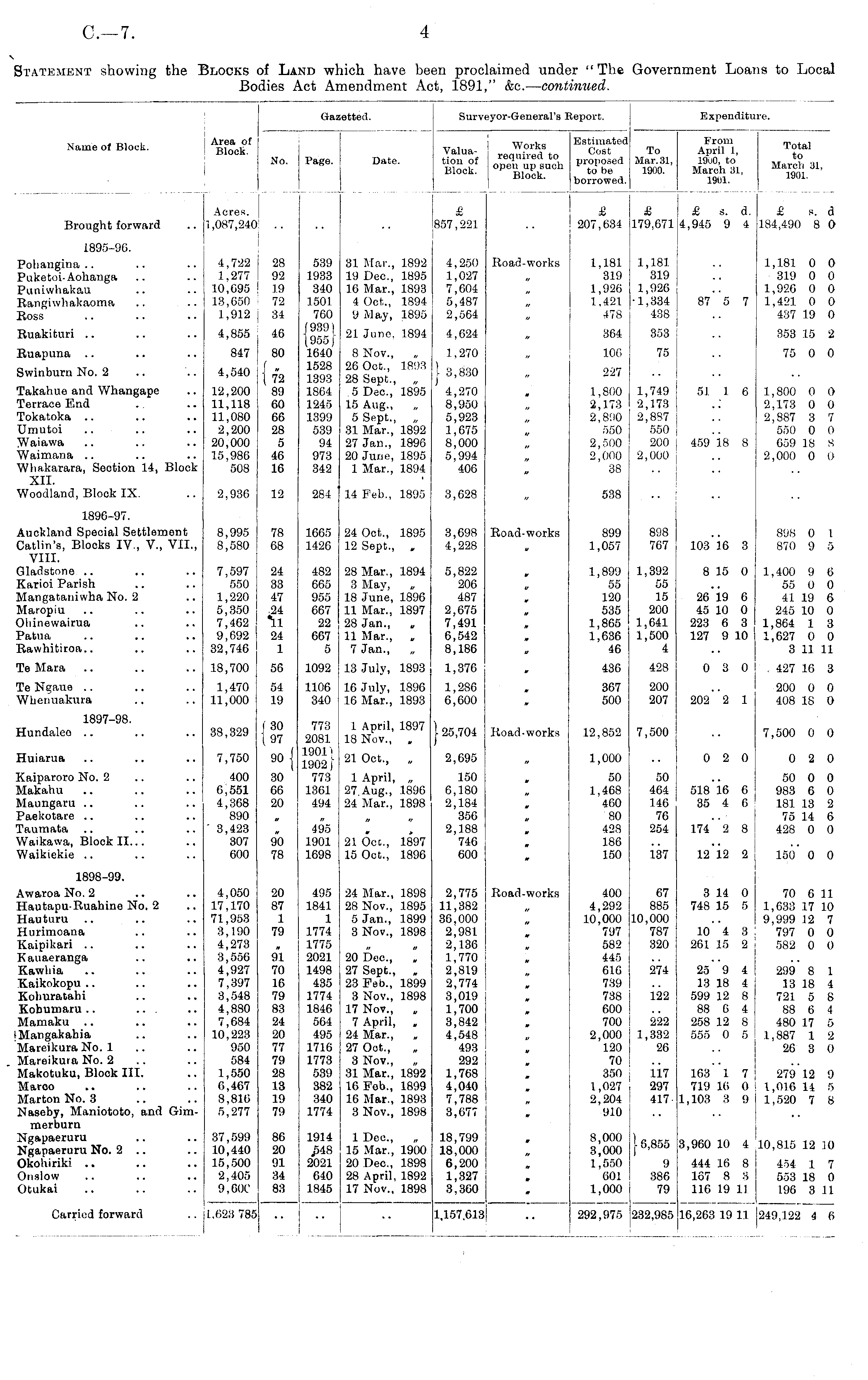 Ga Name of Block. | f No. Page. i ___ Gazetted. ELI Valnn. ' Works vaiua re q,,i re d to Mo'ek open up each B1OCK. Block. Surveyor-General's Report. Estimated Cost proposed to be borrowed. To Mar.31, 1900. From April 1, 1900, to March 81, 1901. Expenditure. Total to I March 31, 1901. Date. " Acres. Brought forward .. 1,087,240 .. £ 857,221 £ 207,634 £ 179,671 £ s. d. 4,945 9 4 £ s. d 184,490 8 0 1895-90. 28 92 19 72 34 539 1933 340 1501 760 (9391 1955 j 1640 1528 1393 1864 1245 1399 539 94 973 342 31 Mar., 1892 19 Dec, 1895 16 Mar., 1893 4 Oct., 1894 9 May, 1895 4,250 1,027 7,604 5,487 2,564 Road-works 1,181 319 1,926 1,421 -178 1,181 319 1,926 1,334 438 1,181 0 0 319 0 0 1,920 0 0 1,421 0 0 437 19 O Poliangiua.. .. .. 4,722 28 539 Puketoi-Aohanga .. ..! 1,277 92 1933 Puniwhakau .. .. 10,695 I 19 340 Rangiwhakaoma .. ..I 13,650 72 1501 Ross .. .. .. 1,912 i 34 760 87 5 7 ' Ruakifcuri .. .. .. 4,855 46 jJSfl 46 I 1 21 Juno. 1894 4,624 364 858 353 15 2 Ruapuna .. .. -. 847 80 1640 ( 1 KOO 80 8 Nov., 26 Oct., 1893 28 Sept., „ 5 Dec, 1895 15 Aug., 5 Sept., „ 31 Mar., 1892 27 Jan., 1896 20 June, 1895 1 Mar., 1894 1,270 10G 75 75 0 0 SwinburuNo. 2 .. .. 4,540 I fa \ I ti J-Od-J Takahue and Whangape .. 12,200 '89 1864 Terrace End . .. 11,118 60 1245 Tokatoka .. .. .. 11,080 j 66 1399 Umutoi .. .. .. 2,200 28 539 Waiawa .. .. .. 20,000 I 5 94 Waimana .. .. .. 15,986 46 973 Whakarara, Section 14, Block 508 16 342 XII. Woodland, Block IX. .. 2,936 12 284 I 72 ' 89 60 66 28 5 46 16 I 3,830 4,270 8,950 5,923 1,675 8,000 5,994 400 227 1,800 2,173 2,890 r>f>o 2,500 2,0(10 38 i 1,749 2,173 2,897 550 200 ! 2,000 51 \ 6 1,800 0 0 2,173 0 0 2,887 3 7 550 0 0 659 18 8 2,000 0 0 459 18 8 . 12 284 14 Feb., 1895 3,628 538 1896-97. Auckland Special Settlement 8,995 78 1665 Catlin's, Blocks IV., V., VII., 8,580 i 68 1426 VIII. Gladstone .. .. .. 7,597 24 482 Karioi Parish .. .. 550 33 605 MangataniwhaNo. 2 .. 1,220 47 955 Maropiu .. .. .. 5,350 24 667 Ohinewairua .. .. 7,462 11 22 Patua .. .. .. 9,692 24 667 Rawhitiroa.. .. .. 32,746 1 5 78 68 24 33 47 « 24 1 1665 1426 482 665 955 667 22 667 5 24 Oct., 1895 12 Sept., , 28 Mar., 1894 3 May, 18 June, 1896 11 Mar., 1897 28 Jan., 11 Mar., . 7 Jan., 3,698 4,228 5,822 206 487 2,675 7,491 6,542 8,186 Road-works 899 1,057 1,899 55 120 535 1,865 1,636 46 898 767 1,392 55 15 200 1,641 1,500 i 103 16 3 8 15 0 26 19 6 45 10 0 223 6 3 127 9 10 898 0 1 870 9 5 1,400 9 6 55 0 0 41 19 6 245 10 0 1,864 1 3 1,627 0 0 8 11 11 Te Mara .. .. ..18,700 56 1092 56 1092 13 July, 1893 1,376 436 428 I 0 3 0 427 10 3 Te Naaue .. .. .. 1,470 54 1106 Wuenuakura .. .. 11,000 19 340 54 19 1106 340 16 July, 1896 16 Mar., 1893 1,280 6,600 367 500 200 207 202 2 1 200 0 0 408 18 0 1897-98. , „ _. I 30 197 773 2081 19011 1902 i 773 1361 494 1 April, 1897 18 Nov., , I 25,704 Road-works 12,852 7,500 7,500 0 0 Hundalee 38,329 | ™ gj™ v • — Huiarua .. .. .. 7,750 90 { 1902" 90 J 21 Oct., , 1 April, „ 27 Aug., 1896 24 Mar., 1898 2,695 1,000 0 2 0 0 2 0 Kaiparoro No. 2 .. .. 400 30 773 Makahu .. .. .. 6,551 66 1361 Maungaru .. .. .. 4,368 20 494 Paekotare .. .. .. 890 Taumata .. .. ..' 3,423 , 495 Waikawa, Block II... .. 307 90 1901 Waikiekie .. .. .. 600 78 1698 30 66 20 150 6,180 2,184 356 2,188 746 600 » 50 1,468 460 80 428 186 150 50 464 146 76 254 518 16 6 35 4 6 50 0 0 983 6 0 181 13 2 75 14 6 428 0 0 90 78 495 1901 1698 21 Occ, 1897 15 Oct., 1896 137 174 2 8 12 12 2 15o' 0 0 1898-99. 20 87 1 79 495 1841 1 1774 1775 2021 1498 435 1774 1846 564 495 1716 1773 539 382 340 1774 24 Mar., 1898 28 Nov., 1895 5 Jan., 1899 3 Nov., 1898 2,775 11,382 36,000 2,981 2,136 1,770 2,819 2,774 3,019 1,700 3,842 4,548 493 292 1,768 4,040 7,788 3,677 Koad-works 400 4,292 10,000 797 582 445 616 739 738 600 700 2,000 120 70 350 1,027 2,204 910 67 885 10,000 787 320 3 14 0 748 15 5 70 6 11 1,633 17 10 9,999 12 7 797 0 0 r>82 0 0 Awaroa No. 2 .. .. 4,050 20 495 HautapuRuahine No. 2 .. 17,170 87 1841 Hauturu .. .. .. 71,953 1 1 Hnrimoana .. .. 3,190 79 1774 Kaipikari .. .. .. 4,273 , j 1775 Kanaeranga .. .. 3,556 91 ! 2021 Kawliia .. .. .. 4,927 70 1498 Kaikokopu.. .. .. 7,397 16 435 Kohuratahi .. .. 3,548 79 1774 Kobumaru.. 4,880 83 1846 Mamaku .. .. .. 7,684 24 564 [Mangakabia .. .. 10,223 20 495 Mareikura No. 1 .. .. 950 77 1716 Mareikura No. 2 .. .. 584 79 1773 Makotuku, Block III. .. 1,550 28 539 Marco .. .. .. 6,467 13 382 MartonNo. 3 .. .. 8,810 19 340 Naseby, Maniototo, and Gim- | 5,277 79 1774 merburn Ngapaeruru .. .. 37,599 86 1914 Ngapaertiru No. 2 .. .. 10,440 20 ,548 Okohiriki .. .. ..15,500 91 2021 Onslow .. .. .. 2,405 34 640 Otukai .. .. .. 9,60C 83 i 1845 91 70 16 79 83 24 20 77 79 28 13 19 79 20 Dec, 27 Sept., , 23 Feb., 1899 8 Nov., 1898 17 Nov., , 7 April, „ 24 Mar., 27 Oct., 3 Nov., „ 31 Mar., 1892 16 Feb., 1899 16 Mar., 1893 8 Nov., 1898 tr H 274 122 222 ; 1,332 26 10 4 3 261 15 2 25 9 4 13 18 4 599 12 8 88 0 4 258 12 8 555 0 5 299 8 1 13 18 4 721 5 8 88 6 I 480 17 5 1,887 1 2 26 3 0 117 i 297 417 163 1 7 719 L6 0 1,108 8 9 279 12 9 1,016 14 5 1,520 7 8 86 20 91 34 83 1914 ,548 2021 640 1845 1 Dec, 15 Mar., 1900 20 Dec, 1898 28 April, 1892 17 Nov., 1898 18,799 18,000 6,200 1,327 3,360 8,000 3,000 1,550 601 1,000 i I 6,855 3,960 10 4 10,815 12 10 9 386 79 444 16 8 167 8 8 116 19 11 454 1 7 553 18 0 196 3 11 i 1 Carried forward ..1.628 786 .. I 249,122 4 6 1.628 785 1.157.6131 292,975 232,985 16,263 19 11