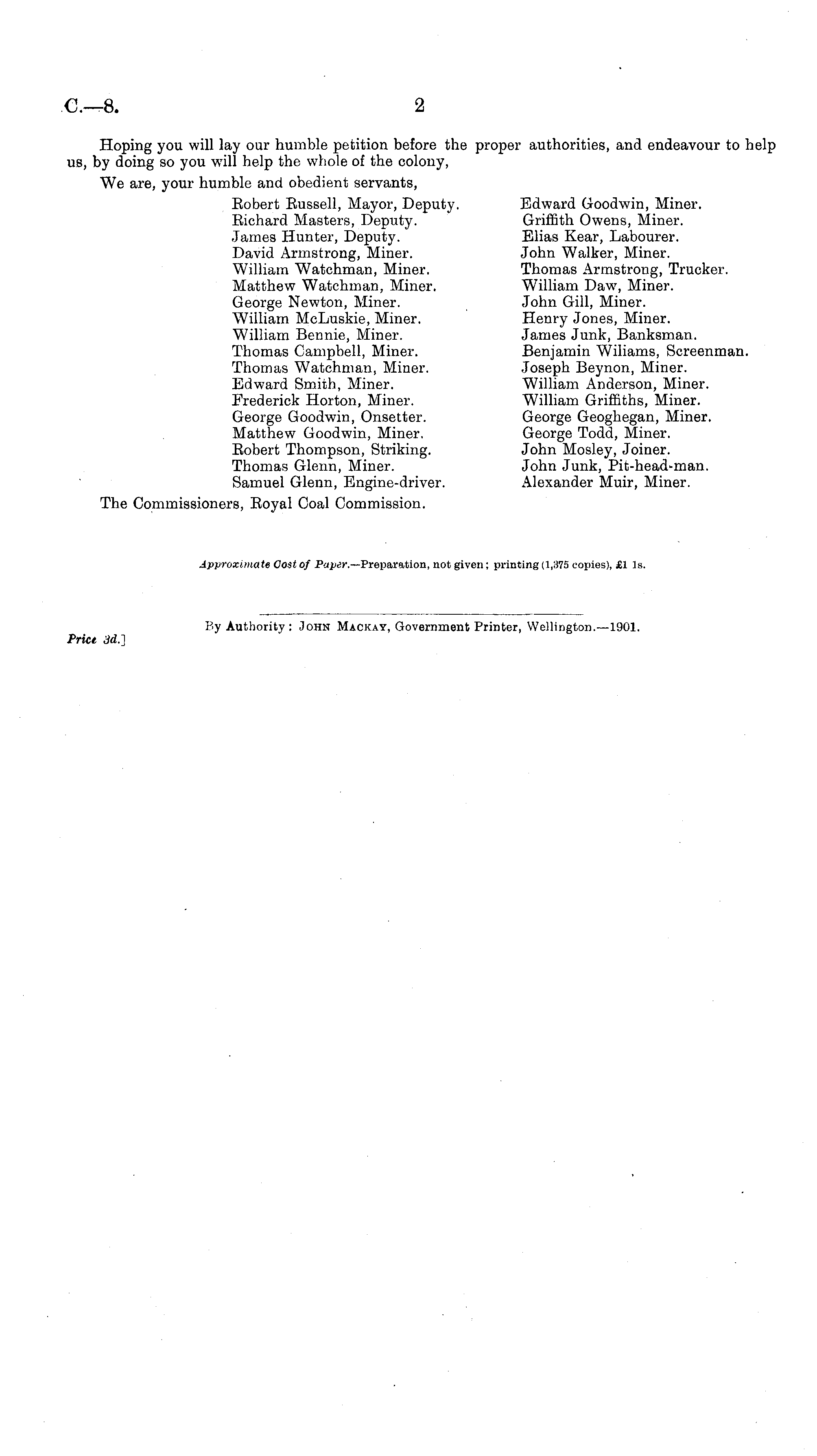 Hoping you will lay our humble petition before the proper authorities, and endeavour to help us, by doing so you will help the whole of the colony, We are, your humble and obedient servants, Eobert Eussell, Mayor, Deputy. Edward Goodwin, Miner. Eichard Masters, Deputy. Griffith Owens, Miner. James Hunter, Deputy. Elias Kear, Labourer. David Armstrong, Miner. John Walker, Miner. William Watchman, Miner. Thomas Armstrong, Trucker. Matthew Watchman, Miner. William Daw, Miner. George Newton, Miner. John Gill, Miner. William McLuskie, Miner. Henry Jones, Miner. William Bennie, Miner. James Junk, Banksman. Thomas Campbell, Miner. Benjamin Wiliams, Screenman. Thomas Watchman, Miner. Joseph Beynon, Miner. Edward Smith, Miner. William Anderson, Miner. Frederick Horton, Miner. William Griffiths, Miner. George Goodwin, Onsetter. George Geoghegan, Miner. Matthew Goodwin, Miner. George Todd, Miner. Eobert Thompson, Striking. John Mosley, Joiner. Thomas Glenn, Miner. John Junk, Pit-head-man. Samuel Glenn, Engine-driver. Alexander Muir, Miner. The Commissioners, Eoyal Coal Commission. Approximate Cost of Paper.— Preparation, not given; printing (1,375 copies), £1 Is.