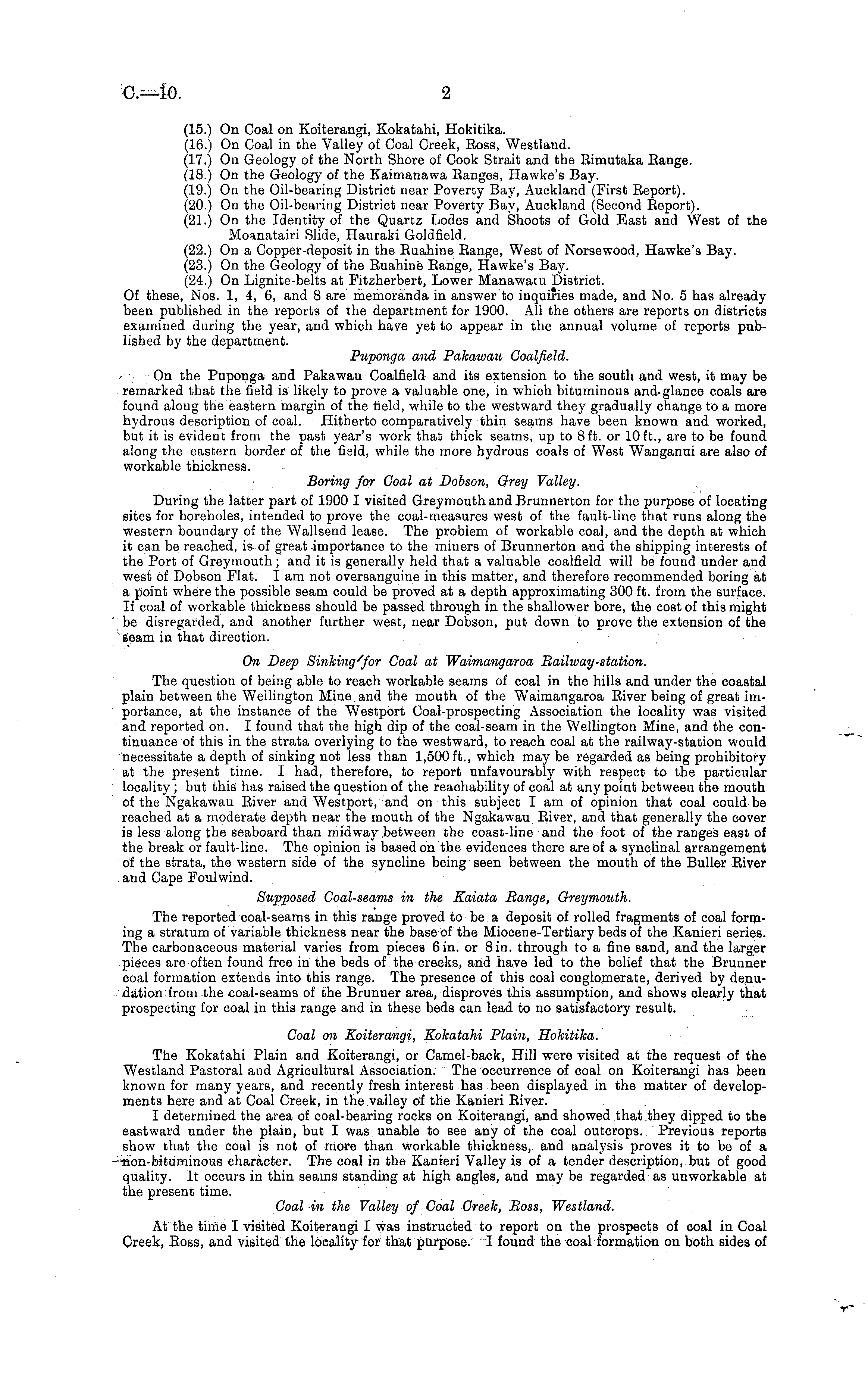 (15.) On Coal on Koiterangi, Kokatahi, Hokitika. (16.) On Coal in the Valley of Coal Creek, Ross, Westland. (17.) On Geology of the North Shore of Cook Strait and the Rimutaka Range. (18.) On the Geology of the Kaimanawa Ranges, Hawke's Bay. (19.) On the Oil-bearing District near Poverty Bay, Auckland (First Report). (20.) On the Oil-bearing District near Poverty Bay, Auckland (Second Report). (21.) On the Identity of the Quartz Lodes and Shoots of Gold East and West of the Moanatairi Slide, Hauraki Goldfield. (22.) On a Copper-deposit in the Ruahine Range, West of Norsewood, Hawke's Bay. (23.) On the Geology of the Ruahine Range, Hawke's Bay. (24.) On Lignite-belts at Fitzherbert, Lower Manawatu District. Of these, Nos. 1, 4, 6, and 8 are memoranda in answer to inquiries made, and No. 5 has already been published in the reports of the department for 1900. All the others are reports on districts examined during the year, and which have yet to appear in the annual volume of reports published by the department. Puponga and Pakawau Coalfield. On the Puponga and Pakawau Coalfield and its extension to the south and west, it may be remarked that the field is likely to prove a valuable one, in which bituminous and-glance coals are found along the eastern margin of the field, while to the westward they gradually change to a more hydrous description of coal. Hitherto comparatively thin seams have been known and worked, but it is evident from the past year's work that thick seams, up to Bft. or 10ft., are to be found along the eastern border of the field, while the more hydrous coals of West Wanganui are also of workable thickness. Boring for Coal at Dobson, Grey Valley. During the latter part of 1900 I visited Greymouth and Brunnerton for the purpose of locating sites for boreholes, intended to prove the coal-measures west of the fault-line that runs along the western boundary of the Wallsend lease. The problem of workable coal, and the depth at which it can be reached, is of great importance to the miners of Brunnerton and the shipping interests of the Port of Greymouth; and it is generally held that a valuable coalfield will be found under and west of Dobson Flat. lam not oversanguine in this matter, and therefore recommended boring at a point where the possible seam could be proved at a depth approximating 300 ft. from the surface. If coal of workable thickness should be passed through in the shallower bore, the cost of this might be disregarded, and another further west, near Dobson, put down to prove the extension of the seam in that direction. On Deep Sinking'for Coal at Waimangaroa Railway-station. The question of being able to reach workable seams of coal in the hills and under the coastal plain between the Wellington Mine and the mouth of the Waimangaroa River being of great importance, at the instance of the Westport Coal-prospecting Association the locality was visited and reported on. I found that the high dip of the coal-seam in the Wellington Mine, and the continuance of this in the strata overlying to the westward, to reach coal at the railway-station would necessitate a depth of sinking not less than 1,500 ft., which may be regarded as being prohibitory at the present time. I had, therefore, to report unfavourably with respect to the particular locality ; but this has raised the question of the reachability of coal at any point between the mouth of the Ngakawau River and Westport, and on this subject I am of opinion that coal could be reached at a moderate depth near the mouth of the Ngakawau River, and that generally the cover is less along the seaboard than midway between the coast-line and the foot of the ranges east of the break or fault-line. The opinion is based on the evidences there are of a synclinal arrangement of the strata, the western side of the syncline being seen between the mouth of the Buller River and Cape Foulwind. Supposed Coal-seams in the Kaiata Range, Greymouth. The reported coal-seams in this range proved to be a deposit of rolled fragments of coal forming a stratum of variable thickness near the base of the Miocene-Tertiary beds of the Kanieri series. The carbonaceous material varies from pieces 6 in. or 8 in. through to a fine sand, and the larger pieces are often found free in the beds of the creeks, and have led to the belief that the Brunner coal formation extends into this range. The presence of this coal conglomerate, derived by denudation from the coal-seams of the Brunner area, disproves this assumption, and shows clearly that prospecting for coal in this range and in these beds can lead to no satisfactory result. Coal on Koiterangi, Kokatahi Plain, Hokitika. The Kokatahi Plain and Koiterangi, or Camel-back, Hill were visited at the request of the Westland Pastoral and Agricultural Association. The occurrence of coal on Koiterangi has been known for many years, and recently fresh interest has been displayed in the matter of developments here and at Coal Creek, in the valley of the Kanieri River. I determined the area of coal-bearing rocks on Koiterangi, and showed that they dipped to the eastward under the plain, but I was unable to see any of the coal outcrops. Previous reports show that the coal is not of more than workable thickness, and analysis proves it to be of a •non-bituminous character. The coal in the Kanieri Valley is of a tender description, but of good quality. It occurs in thin seams standing at high angles, and may be regarded as unworkable at the present time. Coal in the Valley of Coal Creek, Ross, Westland. At the time I visited Koiterangi I was instructed to report on the prospects of coal in Coal Creek, Ross, and visited the locality for that purpose. I found the coal formation on both sides of