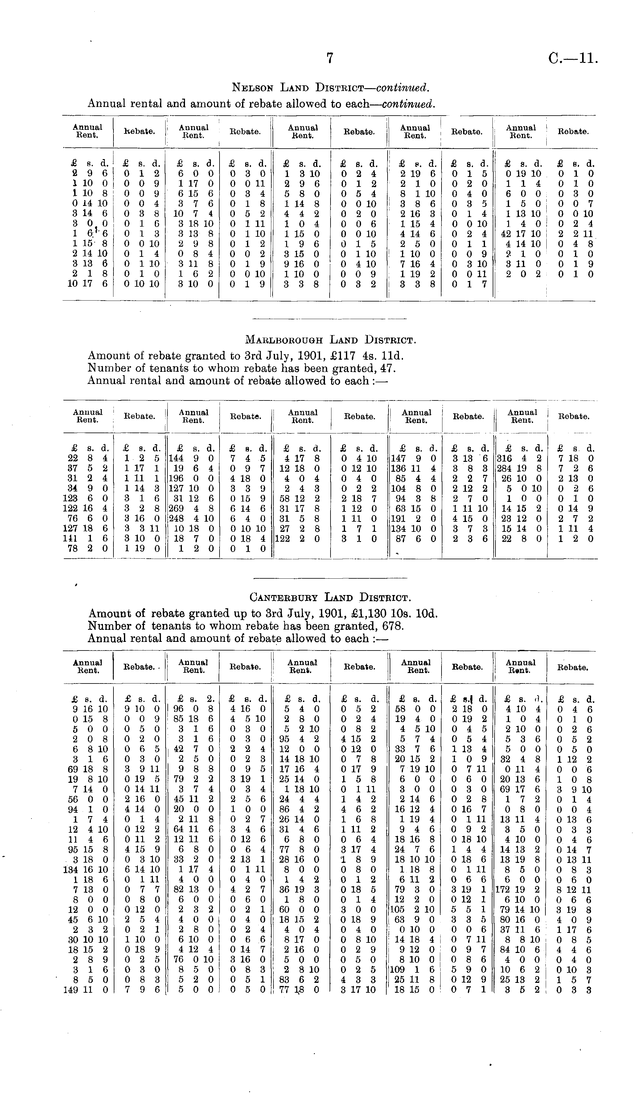 Canterbury Land District. Amount of rebate granted up to 3rd July, 1901, £1,130 10s. 10d. Number of tenants to whom rebate has been granted, 678. Annual rental and amount of rebate allowed to each:—