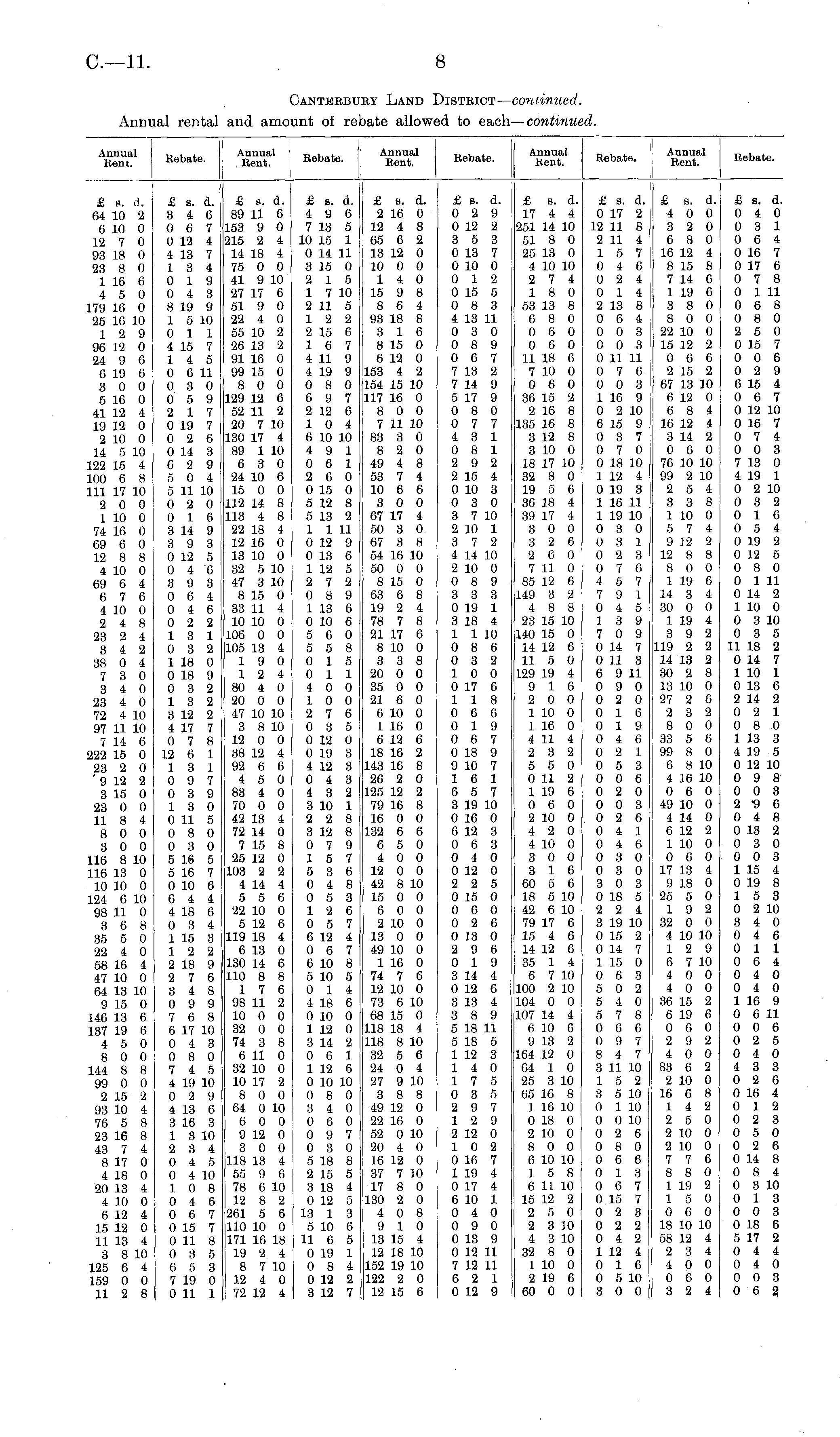 Annual Kent. Rebate. Annual Kent. Kebate. Annual Rent. Rebate. Vnnua] Kent. Rebate. Annual Kent. Rebate. £ s. d. 64 10 2 6 10 0 12 7 0 93 18 0 23 8 0 1 16 6 4 5 0 179 16 0 25 16 10 12 9 96 12 0 24 9 6 6 19 6 3 0 0 5 16 0 41 12 4 19 12 0 2 10 0 14 6 10 122 15 4 100 0 8 111 17 10 2 0 0 1 10 0 74 16 0 69 6 0 12 8 8 4 10 0 69 6 4 6 7 6 4 10 0 2 4 8 23 2 4 3 4 2 38 0 4 7 3 0 3 4 0 23 4 0 72 4 10 97 11 10 7 14 6 222 15 0 23 2 0 '9 12 2 3 15 0 23 0 0 11 8 4 8 0 0 3 0 0 116 8 10 116 13 0 10 10 0 124 6 10 98 11 0 3 6 8 35 5 0 22 4 0 58 16 4 47 10 0 64 13 10 9 15 0 146 13 6 137 19 6 4 5 0 8 0 0 144 8 8 99 0 0 2 15 2 93 10 4 76 5 8 23 16 8 43 7 4 8 17 0 4 18 0 20 13 4 4 10 0 6 12 4 15 12 0 11 13 4 3 8 10 125 6 4 159 0 0 £ b. d. 3 4 6 0 6 7 0 12 4 4 13 7 1 3 4 0 19 0 4 3 8 19 9 1 5 10 Oil 4 15 7 14 5 0 6 11 0 3 0 0 5 9 2 17 0 19 7 0 2 6 0 14 3 6 2 9 5 0 4 5 11 10 0 2 0 0 16 3 14 9 3 9 3 0 12 5 0 4 0 3 9 3 0 6 4 0 4 6 0 2 2 13 1 0 3 2 1 18 0 0 18 9 0 3 2 13 2 3 12 2 4 17 7 0 7 8 12 6 1 13 1 0 9 7 0 3 9 13 0 0 11 5 0 8 0 0 3 0 5 16 5 5 16 7 0 10 6 6 4 4 4 18 6 0 3 4 1 15 3 12 2 2 18 9 2 7 6 3 4 8 0 9 9 7 6 8 6 17 10 0 4 3 0 8 0 7 4 5 4 19 10 0 2 9 4 13 6 3 16 3 1 3 10 2 3 4 0 4 5 0 4 10 10 8 0 4 6 0 6 7 0 15 7 0 11 8 0 3 5 6 5 3 7 19 0 £ s. d. 89 11 6 153 9 0 215 2 4 14 18 4 75 0 0 41 9 10 27 17 6 51 9 0 22 4 0 55 10 2 26 13 2 91 16 0 99 15 0 8 0 0 129 12 6 52 11 2 20 7 10 130 17 4 89 1 10 6 3 0 24 10 6 15 0 0 112 14 8 113 4 8 22 18 4 12 16 0 13 10 0 32 5 10 47 3 10 8 15 0 33 11 4 10 10 0 106 0 0 105 13 4 19 0 12 4 80 4 0 20 0 0 47 10 10 3 8 10 12 0 0 38 12 4 92 6 6 4 5 0 83 4 0 70 0 0 42 13 4 72 14 0 7 15 8 25 12 0 103 2 2 4 14 4 5 5 6 22 10 0 5 12 6 119 18 4 6 13 0 130 14 6 110 8 8 17 6 98 11 2 10 0 0 32 0 0 74 3 8 6 11 0 32 10 0 10 17 2 8 0 0 64 0 10 6 0 0 9 12 0 3 0 0 118 13 4 55 9 6 78 6 10 12 8 2 261 5 6 110 10 0 171 16 18 19 2 4 8 7 10 12 4 0 72 12 4 £ s. d. 4 9 6 7 13 5 10 15 1 0 14 11 3 15 0 2 15 1 7 10 2 11 5 12 2 2 15 6 16 7 4 11 9 4 19 9 0 8 0 6 9 7 2 12 6 10 4 6 10 10 4 9 1 0 6 1 2 6 0 0 15 0 5 12 8 5 13 2 1 1 11 0 12 9 0 13 6 1 12 5 2 7 2 0 8 9 1 13 6 0 10 6 5 6 0 5 5 8 0 15 Oil 4 0 0 10 0 2 7 6 0 3 5 0 12 0 0 19 3 4 12 3 0 4 3 4 3 2 3 10 1 2 2 8 3 12 8 0 7 9 15 7 5 3 6 0 4 8 0 5 3 12 6 0 5 7 6 12 4 0 6 7 6 10 8 5 10 5 0 14 4 18 6 0 10 0 1 12 0 3 14 2 0 6 1 1 12 6 0 10 10 0 8 0 3 4 0 0 6 0 0 9 7 0 3 0 5 18 8 2 15 5 3 18 4 0 12 5 13 1 3 5 10 6 11 6 5 0 19 1 0 8 4 0 12 2 3 12 7 £ s. d. 2 Iβ 0 12 4 8 65 G 2 13 12 0 10 0 0 14 0 15 «J 8 8 6 4 93 18 8 3 16 8 15 0 6 12 0 153 4 2 154 15 10 117 16 0 8 0 0 7 11 10 83 3 0 8 2 0 49 4 8 53 7 4 10 6 6 3 0 0 67 17 4 50 3 0 67 3 8 54 16 10 50 0 0 8 15 0 63 6 8 19 2 4 78 7 8 21 17 6 8 10 0 3 3 8 20 0 0 35 0 0 21 6 0 6 10 0 1 16 0 6 12 6 18 16 2 143 16 8 26 2 0 125 12 2 79 16 8 16 0 0 132 6 6 6 5 0 4 0 0 12 0 0 42 8 10 15 0 0 6 0 0 2 10 0 13 0 0 49 10 0 1 16 0 74 7 6 12 10 0 73 6 10 68 15 0 118 18 4 118 8 10 32 5 6 24 0 4 27 9 10 3 8 8 49 12 0 22 16 0 52 0 10 20 4 0 16 12 0 37 7 10 17 8 0 130 2 0 4 0 8 9 10 13 15 4 12 18 10 152 19 10 122 2 0 12 15 6 £ s. d. 0 2 9 0 12 2 3 5 3 0 13 7 0 10 0 0 12 0 15 5 0 8 3 4 13 11 0 3 0 0 8 9 0 6 7 7 13 2 7 14 9 5 17 9 0 8 0 0 7 7 4 3 1 0 8 1 2 9 2 2 15 4 0 10 3 0 3 0 3 7 10 2 10 1 3 7 2 4 14 10 2 10 0 0 8 9 3 3 3 0 19 1 3 18 4 1 1 10 0 8 6 0 3 2 10 0 0 17 6 118 0 6 6 0 19 0 6 7 0 18 9 9 10 7 16 1 6 5 7 3 19 10 0 16 0 6 12 3 0 6 3 0 4 0 0 12 0 2 2 5 0 15 0 0 6 0 0 2 6 0 13 0 2 9 6 0 19 3 14 4 0 12 6 3 13 4 3 8 9 5 18 11 5 18 5 1 12 3 14 0 17 5 0 3 5 2 9 7 12 9 2 12 0 10 2 0 16 7 1 19 4 0 17 4 6 10 1 0 4 0 0 9 0 0 13 9 0 12 11 7 12 11 6 2 1 0 12 9 £ a. d. 17 4 4 251 14 10 51 8 0 25 18 0 4 10 10 2 7 4 18 0 53 13 8 6 8 0 0 6 0 0 6 0 11 18 6 7 10 0 0 6 0 36 15 2 2 16 8 135 16 8 3 12 8 3 10 0 18 17 10 32 8 0 19 5 6 36 18 4 39 17 4 3 0 0 3 2 6 2 6 0 7 11 0 85 12 6 149 3 2 4 8 8 23 15 10 140 15 0 14 12 6 11 5 0 129 19 4 9 16 2 0 0 1 10 0 1 16 0 4 11 4 2 3 2 5 5 0 0 11 2 1 19 6 0 6 0 2 10 0 4 2 0 4 10 0 3 0 0 3 16 60 5 6 18 5 10 42 6 10 79 17 6 15 4 6 14 12 6 35 1 4 6 7 10 100 2 10 104 0 0 107 14 4 6 10 6 9 13 2 164 12 0 64 1 0 25 3 10 65 16 8 1 16 10 0 18 0 2 10 0 8 0 0 6 10 10 15 8 6 H 10 15 12 2 2 5 0 2 3 10 4 3 10 32 8 0 1 10 0 2 19 6 60 0 0 £ s. d. 0 17 2 12 11 8 2 11 4 15 7 0 4 6 0 2 4 0 14 2 13 8 0 6 4 0 0 3 0 0 3 0 11 11 0 7 6 0 0 3 1 16 9 0 2 10 6 15 9 0 3 7 0 7 0 0 18 10 1 12 4 0 19 3 1 16 11 1 19 10 0 3 0 0 3 1 0 2 8 0 7 6 4 5 7 7 9 1 0 4 5 1 3 9 7 0 9 0 14 7 0 11 3 0 9 11 0 9 0 0 2 0 0 16 0 19 0 4 6 0 2 1 0 5 3 0 0 6 0 2 0 0 0 3 0 2 6 0 4 1 0 4 6 0 3 0 0 3 0 3 0 3 0 18 5 2 2 4 3 19 10 0 15 2 0 14 7 1 15 0 0 6 3 5 0 2 5 4 0 5 7 8 0 6 0 0 9 7 8 4 7 8 11 10 15 2 3 5 10 0 1 10 0 0 10 0 2 6 0 8 0 0 6 6 0 13 0 6 7 0 15 7 0 2 3 0 2 2 0 4 2 1 12 4 0 16 0 5 10 3 0 0 £ s. d. 4 0 0 3 2 0 6 8 0 16 12 4 8 15 8 7 14 6 1 19 6 3 8 0 8 0 0 22 10 0 15 12 2 0 6 6 2 15 2 67 13 10 6 12 0 6 8 4 16 12 4 3 14 2 0 6 0 76 10 10 99 2 10 2 5 4 3 3 8 1 10 0 5 7 4 9 12 2 12 8 8 8 0 0 1 19 6 14 3 4 30 0 0 1 19 4 3 9 2 119 2 2 14 13 2 30 2 8 13 10 0 27 2 6 2 3 2 8 0 0 33 5 6 99 8 0 6 8 10 4 16 10 0 6 0 49 10 0 4 14 0 6 12 2 1 10 0 0 6 0 17 13 4 9 18 0 25 5 0 19 2 32 0 0 4 10 10 12 9 6 7 10 4 0 0 4 0 0 36 15 2 6 19 6 0 6 0 2 9 2 4 0 0 83 6 2 2 10 0 16 6 8 1 4 2 2 5 0 2 10 0 2 10 0 7 7 6 8 8 0 3 19 2 1 5 0 0 6 0 18 10 10 58 12 4 2 3 4 4 0 0 0 6 0 3 2 4 £ s. d. 0 4 0 0 3 1 0 6 4 0 16 7 0 17 6 0 7 8 0 1 11 0 6 8 0 8 0 2 5 0 0 15 7 0 0 6 0 2 9 6 15 4 0 6 7 0 12 10 0 16 7 0 7 4 0 0 3 7 13 0 4 19 1 0 2 10 0 3 2 0 16 0 5 4 0 19 2 0 12 5 0 8 0 0 1 11 0 14 2 1 10 0 0 3 10 0 3 5 11 18 2 0 14 7 1 10 1 0 13 6 2 14 2 0 2 1 0 8 0 1 13 3 4 19 5 0 12 10 0 9 8 0 0 3 2-9 6 0 4 8 0 13 2 0 3 0 0 0 3 1 15 4 0 19 8 1 6 3 0 2 10 3 4 0 0 4 6 Oil 0 6 4 0 4 0 0 4 0 1 16 9 0 6 11 0 0 6 0 2 5 0 4 0 4 3 3 0 2 6 0 16 4 0 12 0 2 3 0 5 0 0 2 6 0 14 8 0 8 4 0 3 10 0 13 0 0 3 0 18 6 5 17 2 0 4 4 0 4 0 0 0 3 0 6 2
