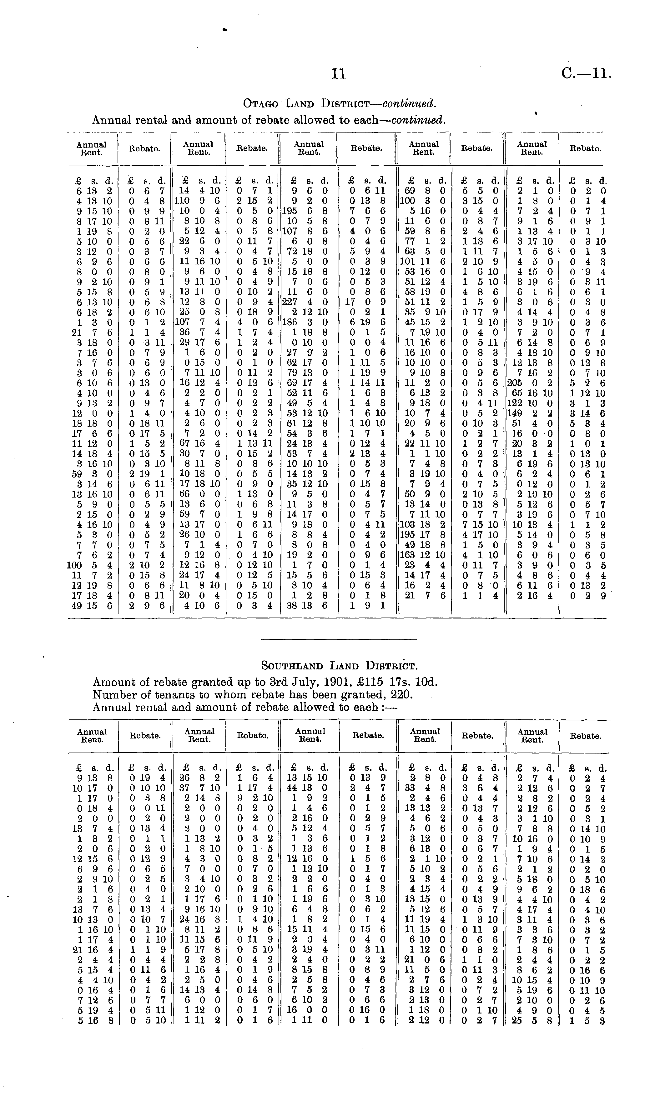 Southland Land District. Amount of rebate granted up to 3rd July, 1901, £115 17s. 10d. Number of tenants to whom rebate has been granted, 220. Annual rental and amount of rebate allowed to each:—