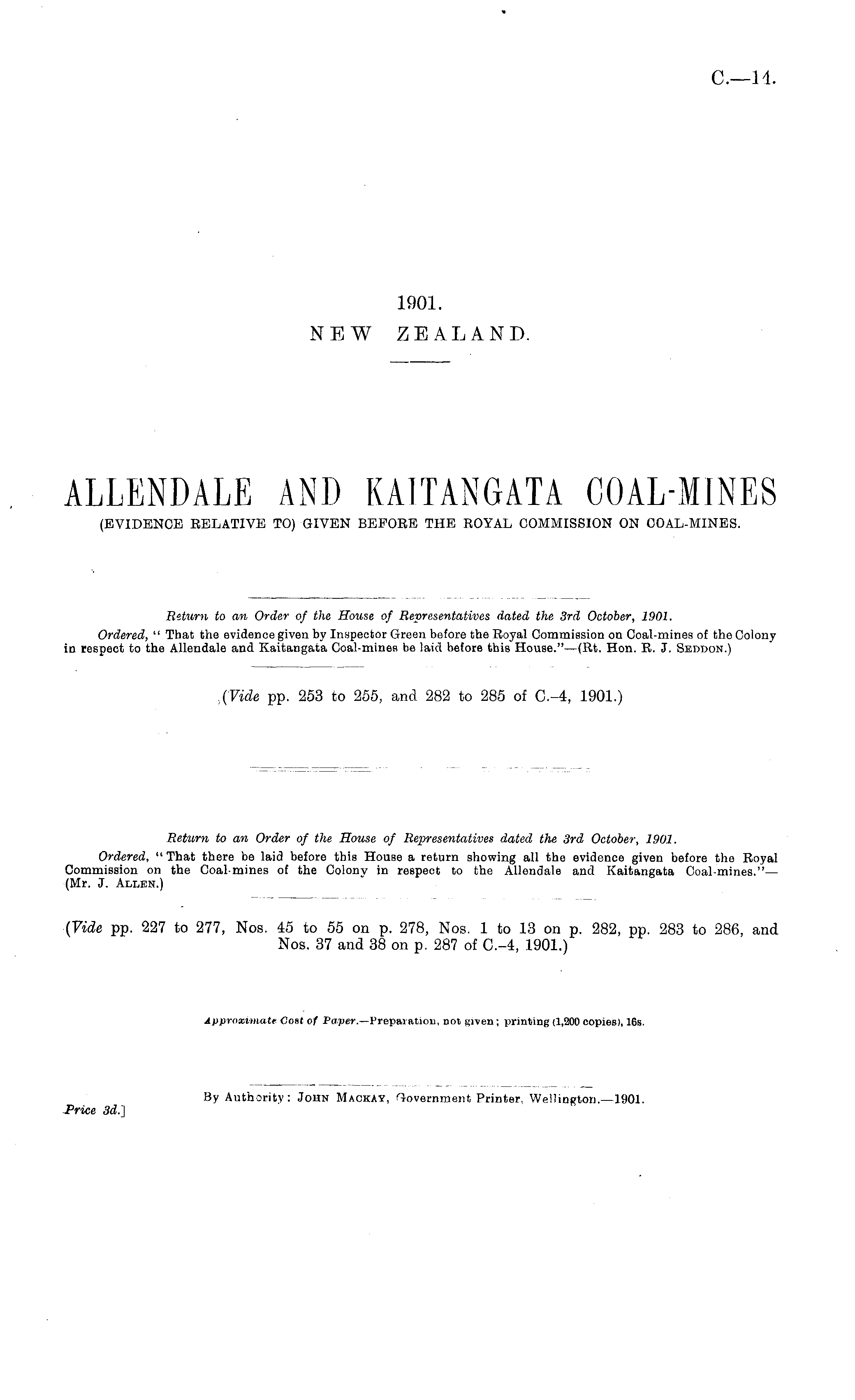 Return to an Order of the House of Representatives dated the 3rd October, 1901. Ordered, " That there be laid before this House a return showing all the evidence given before the Royal Commission on the Coalmines of the Colony in respect to the Allendale and Kaitangata Coal-mines."— (Mr. J. Allen.)