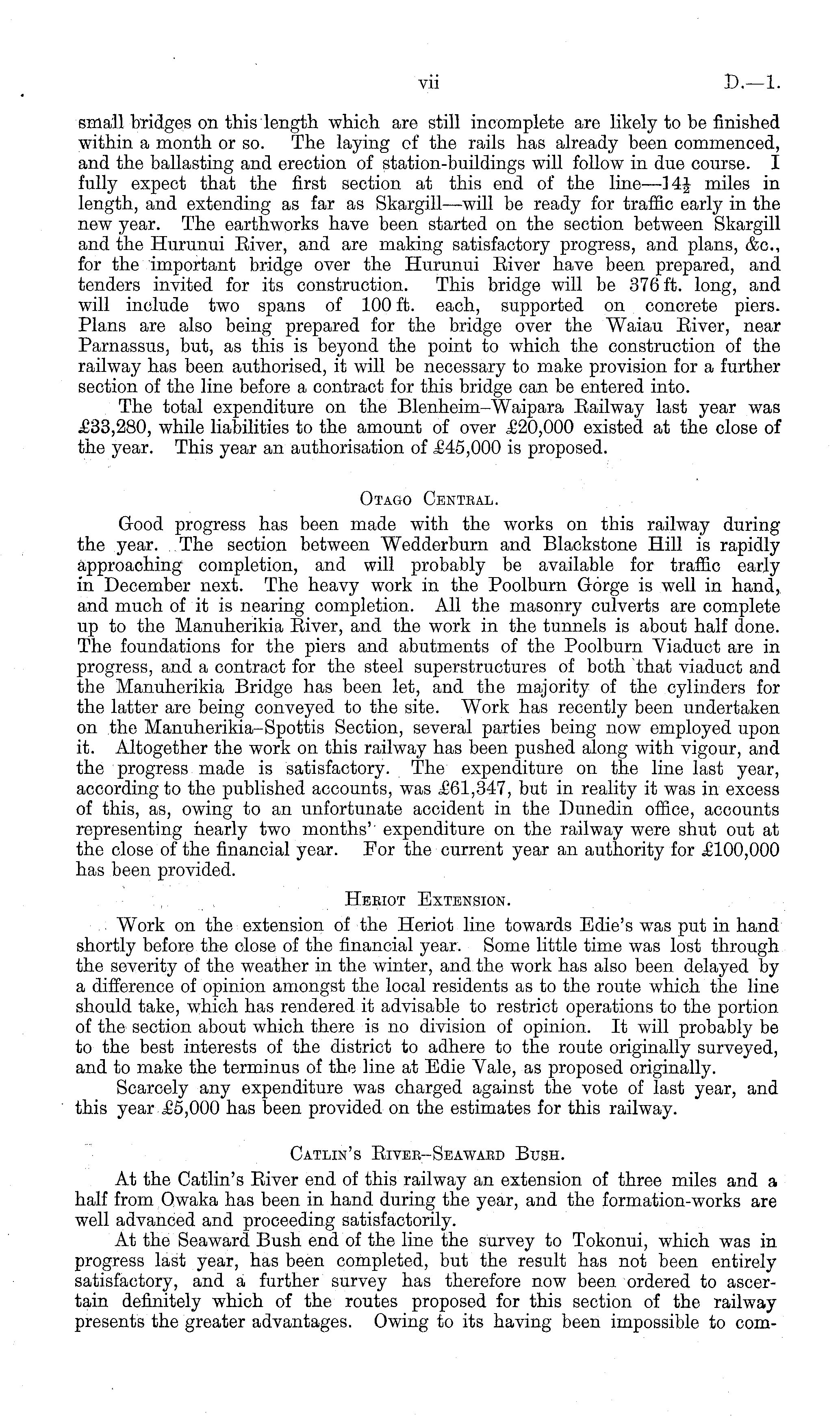 small bridges on this length which are still incomplete are likely to be finished within a month or so. The laying of the rails has already been commenced, and the ballasting and erection of station-buildings will follow in due course. I fully expect that the first section at this end of the line—l4J miles in length, and extending as far as Skargill—will be ready for traffic early in the new year. The earthworks have been started on the section between Skargill and the Hurunui Biver, and are making satisfactory progress, and plans, &c, for the important bridge over the Hurunui Biver have been prepared, and tenders invited for its construction. This bridge will be 376 ft. long, and will include two spans of 100 ft. each, supported on concrete piers. Plans are also being prepared for the bridge over the Waiau Biver, near Parnassus, but, as this is beyond the point to which the construction of the railway has been authorised, it will be necessary to make provision for a further section of the line before a contract for this bridge can be entered into. The total expenditure on the Blenheim-Waipara Bailway last year was £33,280, while liabilities to the amount of over £20,000 existed, at the close of the year. This year an authorisation of £45,000 is proposed. Otago Central. Good progress has been made with the works on this railway during the year. The section between Wedderburn and Blackstone Hill is rapidly approaching completion, and will probably be available for traffic early in December next. The heavy work in the Poolburn Gorge is well in hand, and much of it is nearing completion. All the masonry culverts are complete up to the Manuherikia Biver, and the work in the tunnels is about half done. The foundations for the piers and abutments of the Poolburn Viaduct are in progress, and a contract for the steel superstructures of both that viaduct and the Manuherikia Bridge has been let, and the majority of the cylinders for the latter are being conveyed to the site. Work has recently been undertaken on the Manuherikia-Spottis Section, several parties being now employed upon it. Altogether the work on this railway has been pushed along with vigour, and the progress made is satisfactory. The expenditure on the line last year, according to the published accounts, was £61,347, but in reality it was in excess of this, as, owing to an unfortunate accident in the Dunedin office, accounts representing nearly two months' expenditure on the railway were shut out at the close of the financial year. For the current year an authority for £100,000 has been provided. Heriot Extension. Work on the extension of the Heriot line towards Edie's was put in hand shortly before the close of the financial year. Some little time was lost through the severity of the weather in the winter, and the work has also been delayed by a difference of opinion amongst the local residents as to the route which the line should take, which has rendered it advisable to restrict operations to the portion of the section about which there is no division of opinion. It will probably be to the best interests of the district to adhere to the route originally surveyed, and to make the terminus of the line at Edie Vale, as proposed originally. Scarcely any expenditure was charged against the vote of last year, and this year £5,000 has been provided on the estimates for this railway. Catlin's Biver-Seaward Bush. At the Catlin's Biver end of this railway an extension of three miles and a half from Owaka has been in hand during the year, and the formation-works are well advanced and proceeding satisfactorily. At the Seaward Bush end of the line the survey to Tokonui, which was in progress last year, has been completed, but the result has not been entirely satisfactory, and a further survey has therefore now been ordered to ascertain definitely which of the routes proposed for this section of the railway presents the greater advantages. Owing to its having been impossible to com-