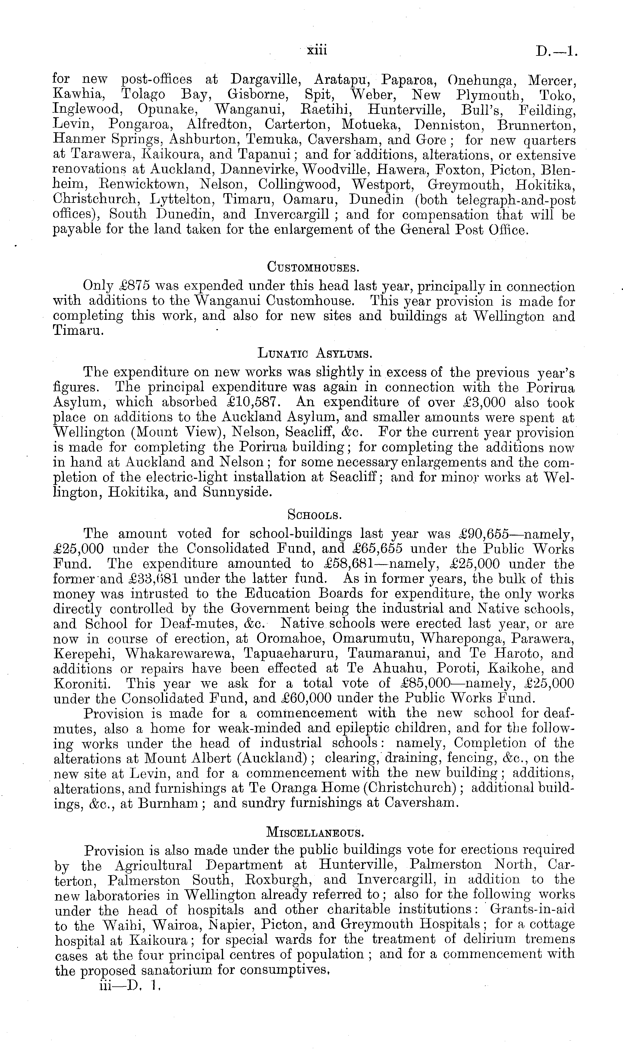for new post-offices at Dargaville, Aratapu, Paparoa, Onehunga, Mercer, Kawhia, Tolago Bay, Gisborne, Spit, Weber, New Plymouth, Toko, Inglewood, Opunake, Wanganui, Baetihi, Hunterville, Bull's, Feilding, Levin, Pongaroa, Alfredton, Carterton, Motueka, Denniston, Brunnerton, Hanmer Springs, Ashburton, Temuka, Caversham, and Gore; for new quarters at Tarawera, Kaikoura, and Tapanui; and for additions, alterations, or extensive renovations at Auckland, Dannevirke, Woodville, Hawera, Foxton, Picton, Blenheim, Benwicktown, Nelson, Collingwood, Westport, Greymouth, Hokitika, Christchurch, Lyttelton, Timaru, Oamaru, Dunedin (both telegraph-and-post offices), South Dunedin, and Invercargill ; and for compensation that will be payable for the land taken for the enlargement of the General Post Office. Customhouses. Only £875 was expended under this head last year, principally in connection with additions to the Wanganui Customhouse. This year provision is made for completing this work, and also for new sites and buildings at Wellington and Timaru. Lunatic Asylums. The expenditure on new works was slightly in excess of the previous year's figures. The principal expenditure was again in connection with the Porirua Asylum, which absorbed £10,587. An expenditure of over £3,000 also took place on additions to the Auckland Asylum, and smaller amounts were spent at Wellington (Mount View), Nelson, Seacliff, &c. For the current year provision is made for completing the Porirua building; for completing the additions now in hand at Auckland and Nelson ; for some necessary enlargements and the completion of the electric-light installation at Seacliff; and for minor works at Wellington, Hokitika, and Sunnyside. Schools. The amount voted for school-buildings last year was £90,655 —namely, £25,000 under the Consolidated Fund, and £65,655 under the Public Works Fund. The expenditure amounted to £58,681 —namely, £25,000 under the former and £33,(581 under the latter fund. As in former years, the bulk of this money was intrusted to the Education Boards for expenditure, the only works directly controlled by the Government being the industrial and Native schools, and School for Deaf-mutes, &c. Native schools were erected last year, or are now in course of erection, at Oromahoe, Omarumutu, Whareponga, Parawera, Kerepehi, Whakarewarewa, Tapuaeharuru, Taumaranui, and Te Haroto, and additions or repairs have been effected at Te Ahuahu, Poroti, Kaikohe, and Koroniti. This year we ask for a total vote of £85,000 —namely, £25,000 under the Consolidated Fund, and £60,000 under the Public Works Fund. Provision is made for a commencement with the new school for deafmutes, also a home for weak-minded and epileptic children, and for the following works under the head of industrial schools: namely, Completion of the alterations at Mount Albert (Auckland); clearing, draining, fencing, &c, on the new site at Levin, and for a commencement with the new building; additions, alterations, and furnishings at Te Oranga Home (Christchurch); additional buildings, &c, at Burnham ; and sundry furnishings at Caversham. Miscellaneous. Provision is also made under the public buildings vote for erections required by the Agricultural Department at Hunterville, Palmerston North, Carterton, Palmerston South, Boxburgh, and Invercargill, in addition to the new laboratories in Wellington already referred to; also for the following works under the head of hospitals and other charitable institutions: Grants-in-aid to the Waihi, Wairoa, Napier, Picton, and Greymouth Hospitals; for a cottage hospital at Kaikoura; for special wards for the treatment of delirium tremens cases at the four principal centres of population ; and for a commencement with the proposed sanatorium for consumptives,