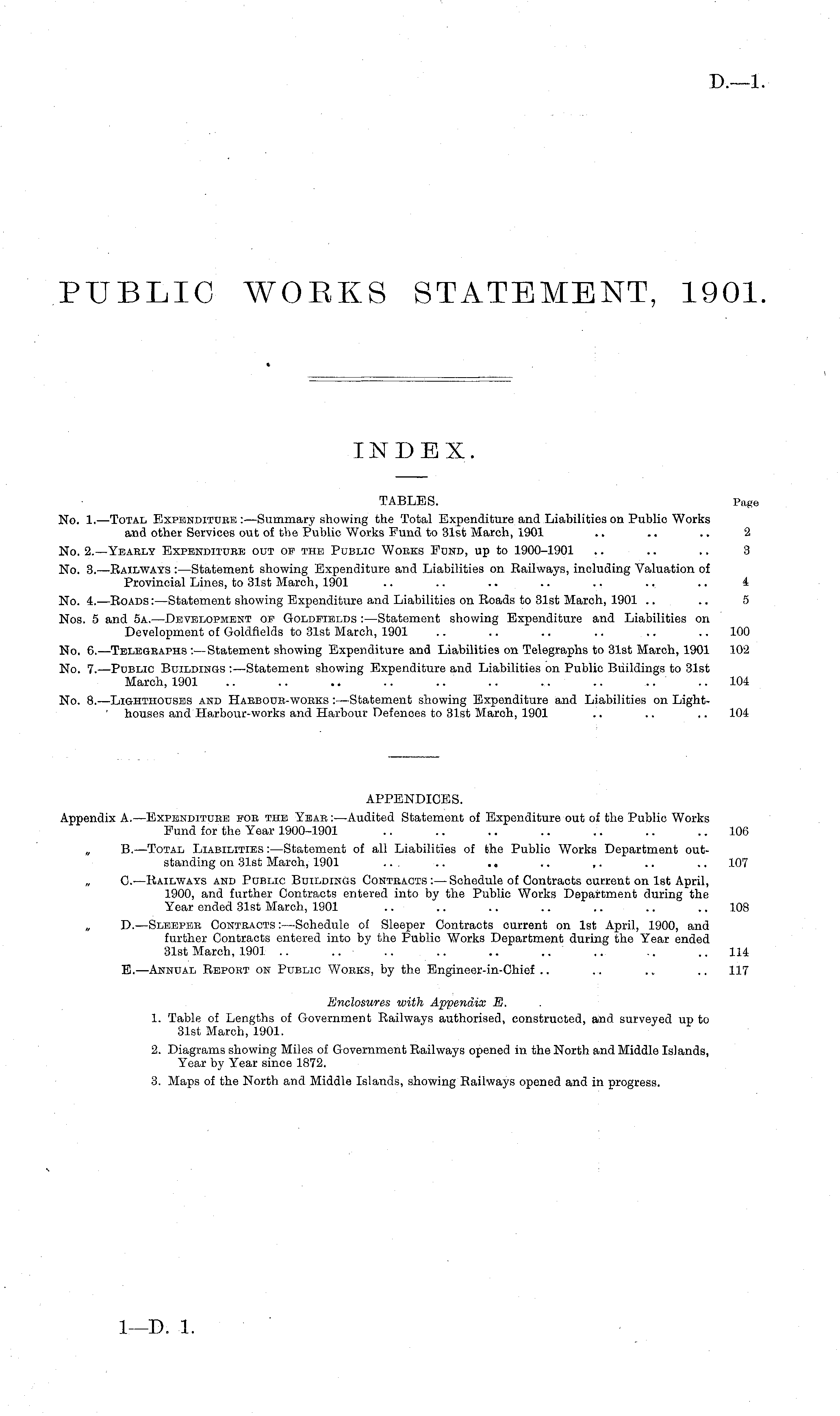 APPENDICES. Appendix A.—Expenditure for the Year : —Audited Statement of Expenditure out of the Public Works Fund for the Year 1900-1901 .. .. .. .. .. .. 106 „ B.—Total Liabilities : —Statement of all Liabilities of fehe Public Works Department outstanding on 31st March, 1901 ... .. .. .. ~ .. ..107 „ C—Railways and Public Buildings Contracts : —Schedule of Contracts current on Ist April, 1900, and further Contracts entered into by the Public Works Department during the Year ended 31st March, 1901 .. .. .. .. .. .. 108 D.—Sleeper Contracts : —Schedule of Sleeper Contracts current on Ist April, 1900, and further Contracts entered into by the Public Works Department during the Year ended 31st March, 1901 .. .. .. .. .. .. .. .. ..114 E. —Annual Report on Public Works, by the Engineer-in-Chief .. .. ~ .. 117 Enclosures with Appendix E. 1. Table of Lengths of Government Railways authorised, constructed, and surveyed up to 31st March, 1901. 2. Diagrams showing Miles of Government Railways opened in the North and Middle Islands, Year by Year since 1872. 3. Maps of the North and Middle Islands, showing Railways opened and in progress.