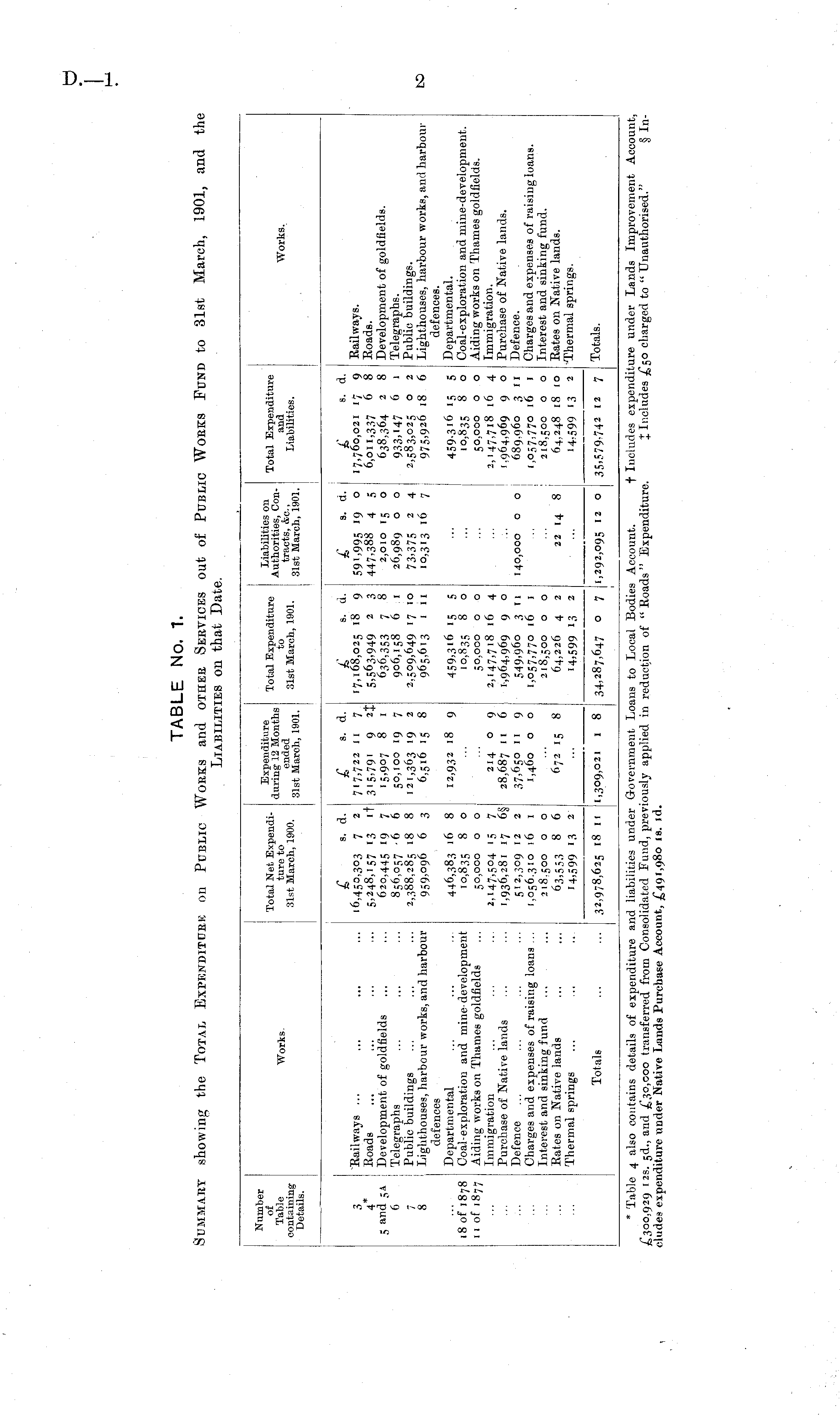 Number of Table containing Details. Works. Total Net Expenditure to 31st March, 1900. Expenditure Tntol 17tv.ot,/h+t, m Liabilities on during 12 Months Iotal Expenditure j AuthoritieSj Con . ended <rut March 1901 tracts, &c, 31st March, 1901. JLSt raarcn > lauJ - ; 3i s t March, 1901. Total Expenditure and Liabilities. Works. 3 4* 5 and 6 ' 'Railways ... Roads Development of goldflelds Telegraphs Public buildings Lighthouses, harbour works, and harbour defences Departmental Coal-exploration and mine-development Aiding works on Thames goldflelds Immigration Purchase of Native lands Defence Charges and expenses of raising loans ... Interest and sinking fund Kates on Native lands Thermal springs i6,45°.3°3 7 2 5,248,157 13 it 620,445 '9 7 856,057 -6 6 2,388,285 18 8 959>° Q 6 6 3 £ s - d. 717,722 n 7 315.79' 9 2J 15,907 8 1 50,100 19 7 121,363 19 2 6,516 15 8 £ s. d. 17,168,025 18 9 5.563.949 2 3 636,353 7 8 906,158 6 1 2,509,649 17 10 965,613 1 11 £ «. d. 591,995 19 o 447.388 4 5 2,010 15 o 26,989 o o 73.375 2 4 10,313 16 7 £ 8. d. 17,760,021 17 9 6,011,337 6 8 638,364 2 8 933. '47 6 > 2,583,025 o 2 975,926 18 6 Railways. Roads. Development of goldflelds. Telegraphs. Public buildings. Lighthouses, harbour works, and harbour defences. Departmental. Coal-exploration and mine-development. Aiding works on Thames goldflelds. Immigration. Purchase of Native lands. Defence. Charges and expenses of raising loans. Interest and sinking fund. Rates on Native lands. Thermal springs. 7 8 18 of 1878 1 1 of 1877 446,383 16 8 10,835 & ° 50,000 o o M47.5°4 15 7 1,936,281 17 6§ 512,309 12 2 1,056.310 16 1 218.500 o o 63,553 8 6 14.599 13 2 12,932 18 9 214 o 9 28,687 " 6 I 37,650 11 9 1,460 o o 459.3 '6 15 5 10,835 8 o 50,000 o o 2,147,718 16 4 1,964,969 9 o 549,960 3 n 1.057.77° ' 6 1 218,500 o o 64,226 4 2 '4.599 13 2 ... 459-3 '6 15 5 10,835 8 o 50,000 o o 2,147,718 16 4 1,964,969 9 o 689,960 3 11 1,057,770 16 1 218,500 o o 64,248 18 10 H,599 '3 2 140,000 O O 672 15 8 22 14 8 ; ... ' Totals. Totals 32,978,625 18 n 1,309,021 1 8 34,287,647 o 7 1,292,095 12 o 35.579.742 12 7 * Table 4 also contains details of expenditure and liabilities under G-overnment Loi £300,929 12s. 5d., and £30,000 transferred from Consolidated Fund, previously applied in eludes expenditure under Native Lands Purchase Account, £491,980 is. id. ras to Local Bodies Account. t Includes expenditure under Lands Improvement Account, reduction of " Roads " Expenditure. X Includes £50 charged to " Unauthorised." § In-