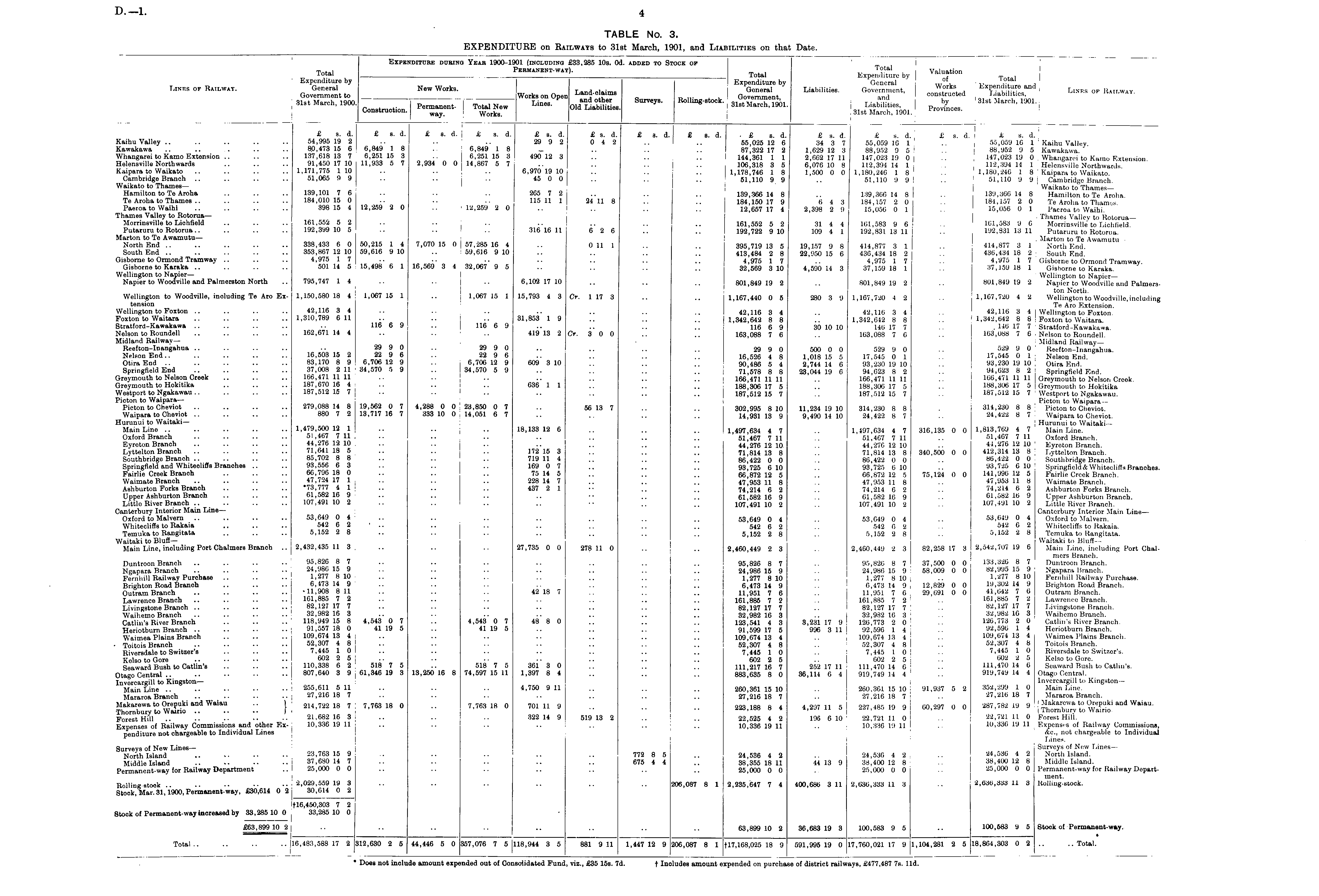 TABLE No. 3. EXPBNDITUEB on Railways to 31st March, 1901, and Liabilities on thai Date. Total Expenditure by Lines of Bailway. General Government to 31st March, 1900. Expe Construction. New Works. Construction. Perm^ ent " Expenditure dueing Year 1900-1901 (including £33,285 10s. 0d. added to Stock of Permanent-way). New Works. WorksonOpen Total New L,lnes - Old Liabilities. Works. Surveys. Expenditure by General D lv _ , T Government, Rollmg-stock. slstMarchil901 . Total Liabilities. Total Expenditure by General Government, and Liabilities, 31st March, 1901. Valuation of Works constructed by Provinces. Total Expenditure and Liabilities, 31st March, 1901. Lines op Railway. £ s. d. Kaihu Valley .. .. .. .. .. 54,995 19 2 Kawakawa .. .. .. .. .. 80,473 15 6 Whangarei to Kamo Extension .. .. .. 137,618 13 7 Helensville Northwards .. .. .. 91,450 17 10 Kaipara to Waikato .. .. .. .. 1,171,775 1 10 I Cambridge Branch .. .. .. .. 51,065 9 9 Waikato to Thames— Hamilton to Te Aroha .. .. .. 139,101 7 6 Te Aroha to Thames .. .. .. .. 184,010 15 0 Paeroa to Waihi .. .. .. .. 398 15 4 Thames Valley to Botorua— Morrinsville to Lichfield .. .. .. 161,552 5 2 Putaruru to Rotorua.. .. .. .. 192,399 10 5 Marton to Te Awamutu— North End .. .. .. .. .. 338,433 6 0 South End .. .. .. .. .. 353,867 12 10 Gisborne to Ormond Tramway .. .. .. 4,975 1 7 Gisborne to Karaka .. .. .. .. 501 14 5 Wellington to Napier— Napier to Woodville and Palmerston North .. 795,747 1 4 £ s. d. 6,849' 1 8 6,251 15 3 11,933 5 7 12,259 2 0 50,215 1 4 59,616 9 10 15,498 6 1 £ s. a. £ s. d. £ s. d. 29 9 2 £ s. d. 0 4 2 £ 3. d. £ s. d. • £ s. d. 55,025 12 6 87,322 17 2 144,361 1 1 106,318 3 5 1,178,746 1 8 51,110 9 9 £ s. d. 34 3 7 1,629 12 3 2,662 17 11 6,076 10 8 1,500 0 0 £ s. d. 55,059 16 1 88,952 9 5 147,023 19 0 112,394 14 1 1,180,246 1 8 51,110 9 9 £ s. d. „ £ s. d. 55,059 16 1 Kaihu Valley. 88,952 9 5 Kawakawa. 147,023 19 0 Whangarei to Kamo Extension. 112,394 14 1 Helensville Northwards. 1,180,246 1 8 Kaipara to Waikato. 51,110 9 9 Cambridge Branch. Waikato to Thames— 139,366 14 8, Hamilton to Te Aroha. 184,157 2 0 Te Aroha to Thames. 15,056 0 1 Paeroa to Waihi. Thames Valley to Botorua— 161,583 9 6 Morrinsville to Liohfield. 192,831 13 11 Putaruru to Botorua. ! Marton to Te Awamutu— 414,877 3 1 ! North End. 436,434 18 2 South End. 4,975 1 7 Gisborne to Ormond Tramway. 37,159 18 1 Gisborne to Karaka. ! Wellington to Napier— 801,849 19 2; Napier to Woodville and Palmerston North. 1,167,720 4 2 Wellington to Woodville,including Te Aro Extension. 42,116 3 4 Wellington to Foxton. 1,342,642 8 8 Poxton to Waitara. . 146 17 7 Stratford-Kawakawa. 163,088 7 6 I Nelson to Eoundell. Midland Bailway— 529 9 0 Beefton-Inangahua. 17,545 0 1 Nelson End. 93,230 19 10 OtiraEnd. 94,623 8 2 Springfield End. 166,471 11 11 Greymouth to Nelson Creek. 188,306 17 5 Greymouth to Hokitika. 187,512 15 7 Westport to Ngakawau. Picton to Waipara— 314,230 8 8 Pioton to Cheviot. 24,422 8 7 Waipara to Cheviot. Hurunui to Waitaki— 1,813,769 4 7 Main Line. 51,467 7 11 Oxford Branch. 44,276 12 10 1 Eyreton Branch. 412,314 13 8} Lyttelton Branch. 86,422 0 0 Southbridge Branch. 93,725 6 10 Springfield & Whitecliffs Branohes. 141,996 12 5 Fairlie Creek Branch. 47,953 11 8 Waimate Branch. 74,214 6 2 Ashburton Forks Branch. 61,582 16 9 Upper Ashburton Branoh. 107,49110 2 Little Biver Branch. Canterbury Interior Main Line— 53,649 0 4 Oxford to Mai vera. 542 6 2 Whitecliffs to Bakaia. 5,152 2 8 Temuka to Bangitata. Waitaki to Bluff— 2,542,707 19 6 Main Line, including Port Chalmers Branch. 133,326 8 7 Duntroon Branch. 82,995 15 9 Ngapara Branch. 1,'277 8 10 Fernhill Bailway Purchase. 19,302 14 9 Brighton Boad Branch. 41,642 7 6 Outram Branch. 161,885 7 2 Lawrence Branch. 82,127 17 7 Livingstone Branch. 32,982 16 3 Waihemo Branch. 126,773 2 0 Catlin's Biver Branch. 92,596 1 4 Heriotbum Branch. 109,674 13 4 Waimea Plains Branch. 52,307 4 8 Toitois Branch. 7,445 1 0 Biversdale to Switzer's. 602 2 5 Kelso to Gore. 111,470 14 6 Seaward Bush to Catliu's. 919,749 14 4 Otago Central. Invercargill to Kingston— 352,299 1 0 Main Line. 27,216 18 7 Mararoa Branch. 287 782 19 9 I Makarewa to Orepuki and Waiau. j Thornbury to Wairio, 22,721 11 0 Forest Hill. 10,336 19 11 Expenses of Bailway Commissions, &c, not chargeable to Individual Lines. Surveys of New Lines— 24,536 4 2 North Island. 38,400 12 8 Middle Island. 25,000 0 0 Permanent-way for Railway Department. 2,636,333 11 3 Kolling-stock. 2,934 0 0 6,849 1 8 6,251 15 3 14,867 5 7 490 12 3 6,970 19 10 45 0 0 265 7 2 115 11 1 24'll 8 139,366 14 8 184,150 17 9 12,657 17 4 6 4 3 2,398 2 9 139,366 14 8 184,157 2 0 15,056 0 1 12,259 2 0 316 16 11 6 2 6 161,552 5 2 192,722 9 10 31 4 4 109 4 1 161,583 9 6 192,831 13 11 7,070 15 0 57,285 16 4 59,616 9 10 0 11 1 395,719 13 5 413,484 2 8 4,975 1 7 32,569 3 10 19,157 9 8 22,950 15 6 414,877 3 1 436,434 18 2 4,975 1 7 37,159 18 1 16,569 3 4 32,067 9 5 4,590 14 3 6,102 17 10 801,849 19 2 801,849 19 2 Wellington to Woodville, including Te Aro Ex- 1,150,580 18 4 tension Wellington to Foxton .. .. .. .. 42,116 3 4 Foxton to Waitara .. .. .. .. 1,310,789 6 11 Stratford-Kawakawa Nelson to Boundell .. .. .. .. 162,671 14 4 Midland Bailway— Beefton-Inangahua .. Nelson End.. .. .. .. .. 16,503 15 2 OtiraEnd .. .. .. .. .. 83,170 8 9 Springfield End .. .. .. .. 37,008 2 11 Greymouth to Nelson Creek .. .. .. 166,4711111 Greymouth to Hokitika .. .. .. 187,670 16 4 Westport to Ngakawau.. .. .. .. 187,512 15 7 Picton to Waipara — Picton to Cheviot .. .. .. .. 279,088 14 8 Waipara to Cheviot .. .. .. .. 880 7 2 Hurunui to Waitaki— MainLine .. .. .. .. .. 1,479,500 12 1 OxfordBranch .. .. .. .. 51,467 7 11 Eyreton Branch .. .. .. .. 44,276 12 10 Lyttelton Branch .. .. .. .. 71,641 18 5 Southbridge Branch .. .. .. .. 85,702 8 8 Springfield and Whitecliffs Branches .. .. 93,556 6 3 Fairlie Creek Branch .. .. .. 66,796 18 0 Waimate Branch 47,724 17 1 j Ashb