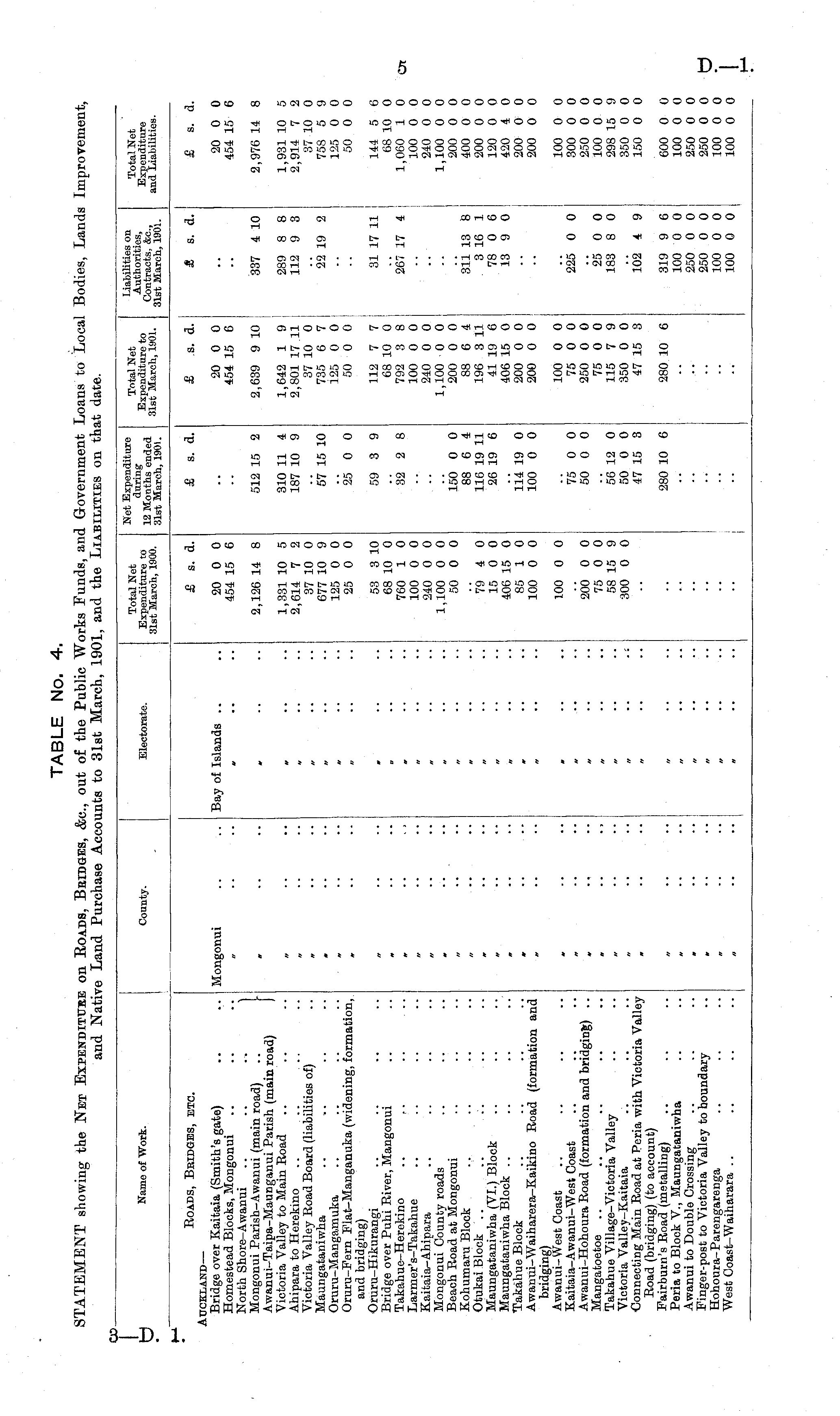 TABLE No. 4. STATEMENT showing the Net Expenditure on Roads, Bridges, &c., out of the Public Works Funds, and Government Loans to Local Bodies, Lands Improvement, and Native Land Purchase Accounts to 31st March, 1901, and the Liabilities on that date.