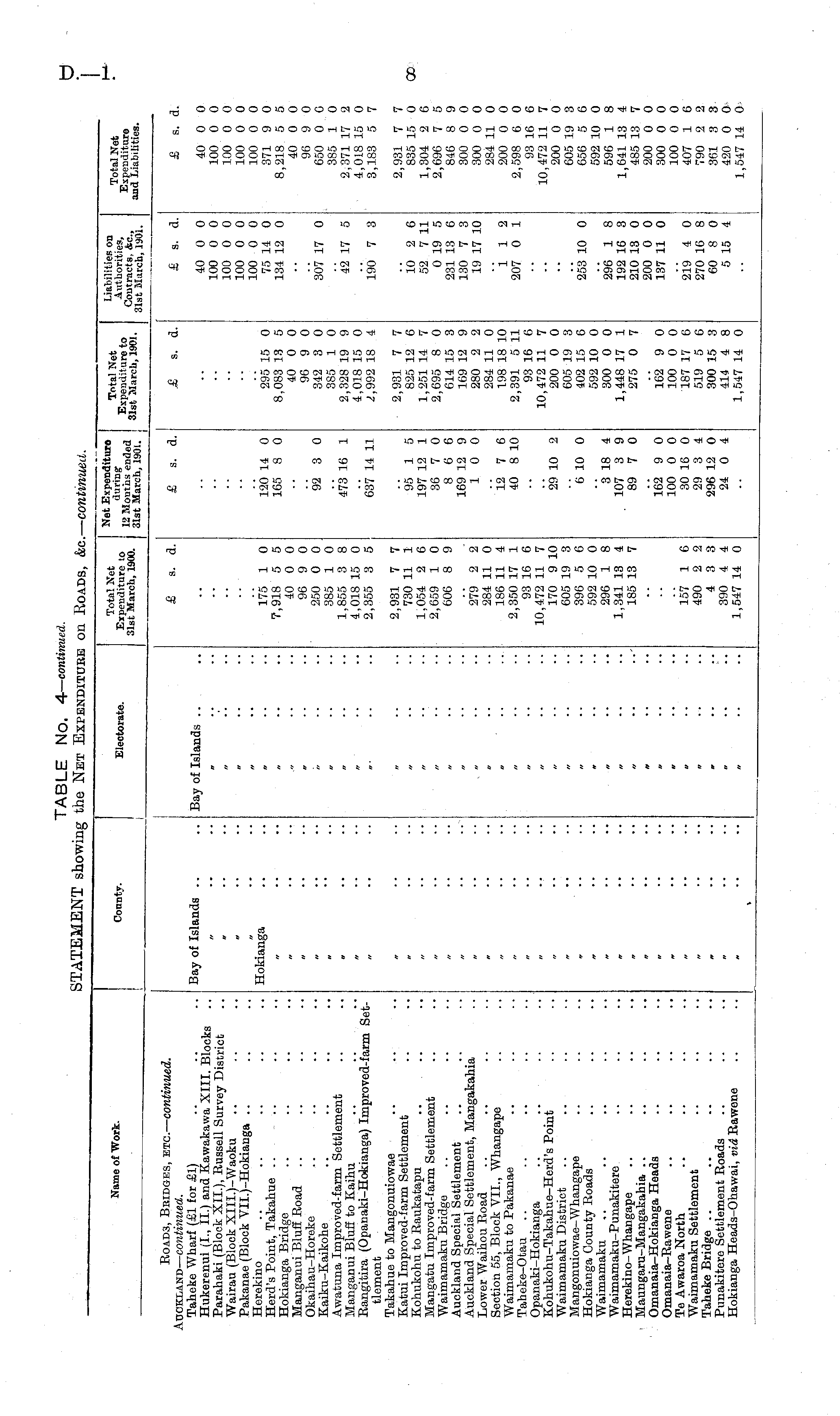 Name of Work. Connty. Electorate. Total Net Expenditure to Slst"Maroh, 1900. Net Expenditure | T t . „ t Liabilities on „ . , „ . 31st March, 1901. i «« March, 1901. 3i s t March, 1901. and Liabilities. Boad3, Bridges, etc. — continued. Auckland — continued. Taheke Wharf (£1 for £1) Hukerenui (I., II.) and Kawakawa XIII. Blocks Parahaki (Block XII.), Russell Survey District Wairau (Block XIII.)-Waoku Pakanae (Block VII.j-Hokianga Herekino Herd's Point, Takahue ...... Hokianga Bridge Manganui Blufi Road Okaihau-Horeke Kaiku-Kaikohe Awatuna Improved- farm Settlement Manganui Blufi to Kaihu Rangitira (Opanaki-Hokianga) Improved-farm Settlement Takahue to Mangonuiowae .. .. .. Katui Improved-farm Settlement Kohukohu to Raukatapu .. ... Mangatu Improved-farm Settlement Waimamaku Bridge Auckland Special Settlement Auckland Special Settlement, Mangakahia Lower Waihou Road Section 55, Block VII., Whangape Waimamaku to Pakanae Taheke-Otau Opanaki-Hokianga .. .. .. Kohukohu-Takahue-Herd's Point Waimamaku District Mangonuiowae-Whangape Hokianga County Roads Waimamaku Waimamaku-Punakitere Herekino- Whangape Maungaru-Mangakahia Omanaia— Hokianga Heads Omanaia-Rawene Te Awaroa North Waimamaku Settlement Taheke Bridge Punakitere Settlement Roads Hokianga Heads-Ohawai, via Rawene Bay of Islands .. if * • Hokianga Bay of Islands .. n • • £ s. d. 175 1 0 7,918 5 5 40 0 0 96 9 0 250 0 0 385 1 0 1,855 3 8 4,018 15 0 2,355 3 5 2,931 7 7 730 11 1 1,054 2 6 2,659 1 0 606 8 9 £ s. d. 120 14 0 165 8 0 92 3 0 473 16 1 637 14 11 95 1 5 197 12 1 36 7 0 8 6 6 169 12 9 10 0 £ s. d. 295 15 0 8,083 13 5 40 0 0 96 9 0 342 3 0 385 1 0 2,328 19 9 4,018 15 0 2,992 18 4 2,931 7 7 825 12 6 1,251 14 7 2,695 8 0 614 15 3 169 12 9 280 2 2 284 11 0 198 18 10 2,391 5 11 93 16 6 10,472 11 7 200 0 0 605 19 3 402 15 6 592 10 0 300 0 0 1,448 17 1 275 0 7 £ s. d. 40 0 0 100 0 0 100 0 0 100 0 0 100 0 0 75 14 0 134 12 0 307 17 0 42 17 5 190 7 3 10 2 6 52 7 11 0 19 5 231 13 6 130 7 3 19 17 10 £ s. d. 40 0 C 100 0 C 100 0 C 100 0 C 100 0 C 371 9 C 8,218 5 £ 40 0 C 96 9 C 650 0 C 385 1 C 2,371 17 2 4,018 15 C 3,183 5 7 2,931 7 7 835 15 C 1,304 2 e 2,696 7 £ 846 8 £ 300 0 C 300 0 C 284 11 C 200 0 C 2,598 6 C 93 16 6 10,472 11 7 200 0 C 605 19 3 656 5 6 592 10 C 596 1 S 1,641 13 4 485 13 7 200 0 C 300 0 C 100 0 C 407 1 6 790 2 2 361 3 3 420 0 C 1,547 14 C 279 2 2 284 11 0 186 11 4 2,350 17 1 93 16 6 10,472 11 7 170 9 10 605 19 3 396 5 6 592 10 0 296 1 8 1,341 13 4 185 13 7 12 7 6 40 8 10 29 10 2 112 207 0 1 6 10 0 253 10 0 3 18 4 107 3 9 89 7 0 296 1 8 192 16 3 210 13 0 200 0 0 137 11 0 157 1 6 490 2 2 4 3 3 390 4 4 1,547 14 0 162 9 0 100 0 0 30 16 0 29 3 4 296 12 0 24 0 4 162 9 0 100 0 0 187 17 6 519 5 6 300 15 3 414 4 8 1,547 14 0 219 4 0 270 16 8 60 8 0 5 15 4 •■