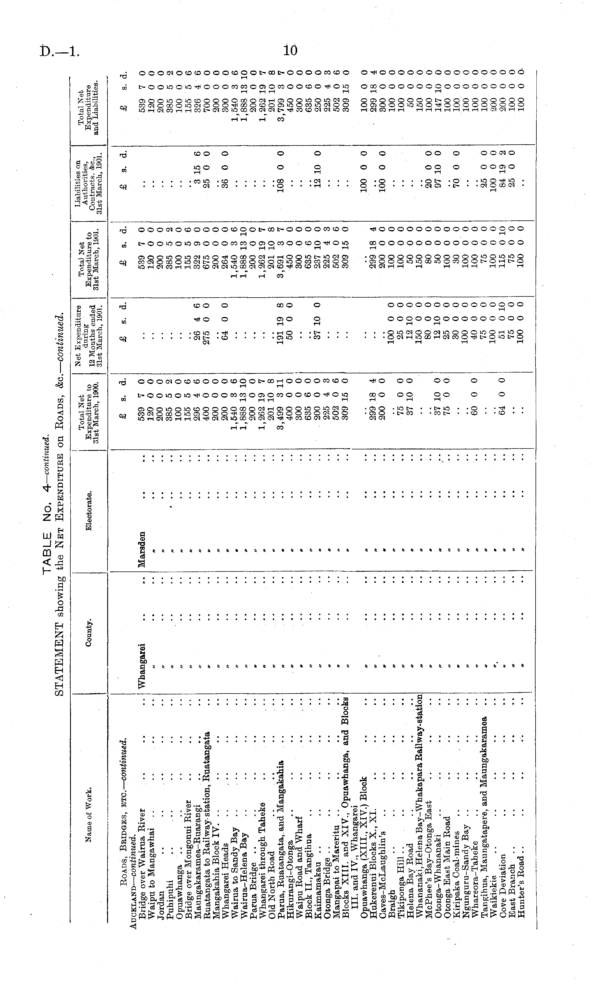 Name of Work. County. Electorate. Total Net Expenditure to Slst March, 1900. Met Expenditure during 12 Months ended 31st March, 1901. Total Net Expenditure to 31st March, 1901. Liabilities on Tnt-il w_tAuthorities, jgSata, a»&fel. and Cities. Roads, Bbidges, etc.— continued. Auckland — continued. Bridge over Wairua River Waipu to Mangawhai Jordan Puhipuhi Opuawhanga Bridge over Mongonui River Maungakaramea-Ruarangi Ruatangata to Railway-station, Ruatangata Mangakahia Block IV. Whangarei Heads .. ... Wairua to Sandy Bay .. Wairua-Helena Bay Parua Bridge Whangarei through Taheke Old North Road Parua, Ruatangata,, and Mangakahia Hikurangi-Otonga Waipu Road and Wharf Block II., Tangihua Kaimamakau Otonga Bridge Mangapai to Mareritu Blocks XIII. and XIV., Opuawhanga, and Blocks III. and IV., Whangarei Opuawhanga (XIII., XIV.) Block Hukerenui Blocks X., XI. Caves-McLaughlin's Braigh Tikiponga Hill Helena Bay Road Whananaki, Helena Bay-Whakapara Railway-station McPhee's Bay-Otonga East Otonga-Whananaki Otonga East Main Road Kiripaka Coal-mines .. .. ... Ngunguru-Sandy Bay .. Whareora-Taheke Tangihua, Maungatapere, and Maungakaramea .. Waikiekie Cove Deviation East Branch Hunter's Road .. Whangarei Maraden 1/ m £ s. d. 539 7 0 120 0 0 200 0 0 385 5 2 100 0 0 155 5 6 296 4 6 400 0 0 200 0 0 200 0 0 1,540 3 6 1,888 13 10 200 0 0 1,262 19 7 201 10 8 3,499 3 11 400 0 0 300 0 0 635 6 0 200 0 0 225 4 3 502 0 6 309 15 0 £ s. d. 26 4 6 275 0 0 64 0 0 191 19 8 50 0 0 37 10 0 £ s. d. 539 7 0 120 0 0 200 0 0 385 5 2 100 0 0 155 5 6 322 9 0 675 0 0 200 0 0 264 0 0 1,540 3 6 1,888 13 10 200 0 0 1,262 19 7 201 10 8 3,691 3 7 450 0 0 300 0 0 635 6 0 237 10 0 225 4 3 502 0 6 309 15 0 £ s. d. 3 15 6 25 0 0 36 0 0 108 0 0 12 10 0 £ s. d. 539 7 0 120 0 0 200 0 0 385 5 2 100 0 0 155 5 6 326 4 6 700 0 0 200 0 0 300 0 0 1,540 3 6 1,888 13 10 200 0 0 1,262 19 7 201 10 8 3,799 3 7 450 0 0 300 0 0 635 6 0 250 0 0 225 4 3 502 0 6 309 15 0 it /* 299 18 4 200 0 0 299 18 i 200 0 0 100 0 0 100 0 0 50 0 0 150 0 0 80 0 0 50 0 0 100 0 0 30 0 0 100 0 0 100 0 0 75 0 0 100 0 0 115 0 10 75 0 0 100 0 0 100 0 0 100 0 0 299 18 4 300 0 0 100 0 0 100 0 0 50 0 0 150 0 0 100 0 0 147 10 0 100 0 0 100 0 0 100 0 0 100 0 0 100 0 0 200 0 0 200 0 0 100 0 0 100 0 0 100 0 0 25 0 0 12 10 0 150 0 0 80 0 0 12 10 0 25 0 0 30 0 0 100 0 0 40 0 0 75 0 0 100 0 0 51 0 10 75 0 0 100 0 0 100 0 0 it 75 0 0 37 10 0 a a 37 10 0 75 0 0 20 0 0 97 10 0 70 0 0 60 0 0 64 0 0 25 0 0 100 0 0 84 19 2 25 0 0 tt
