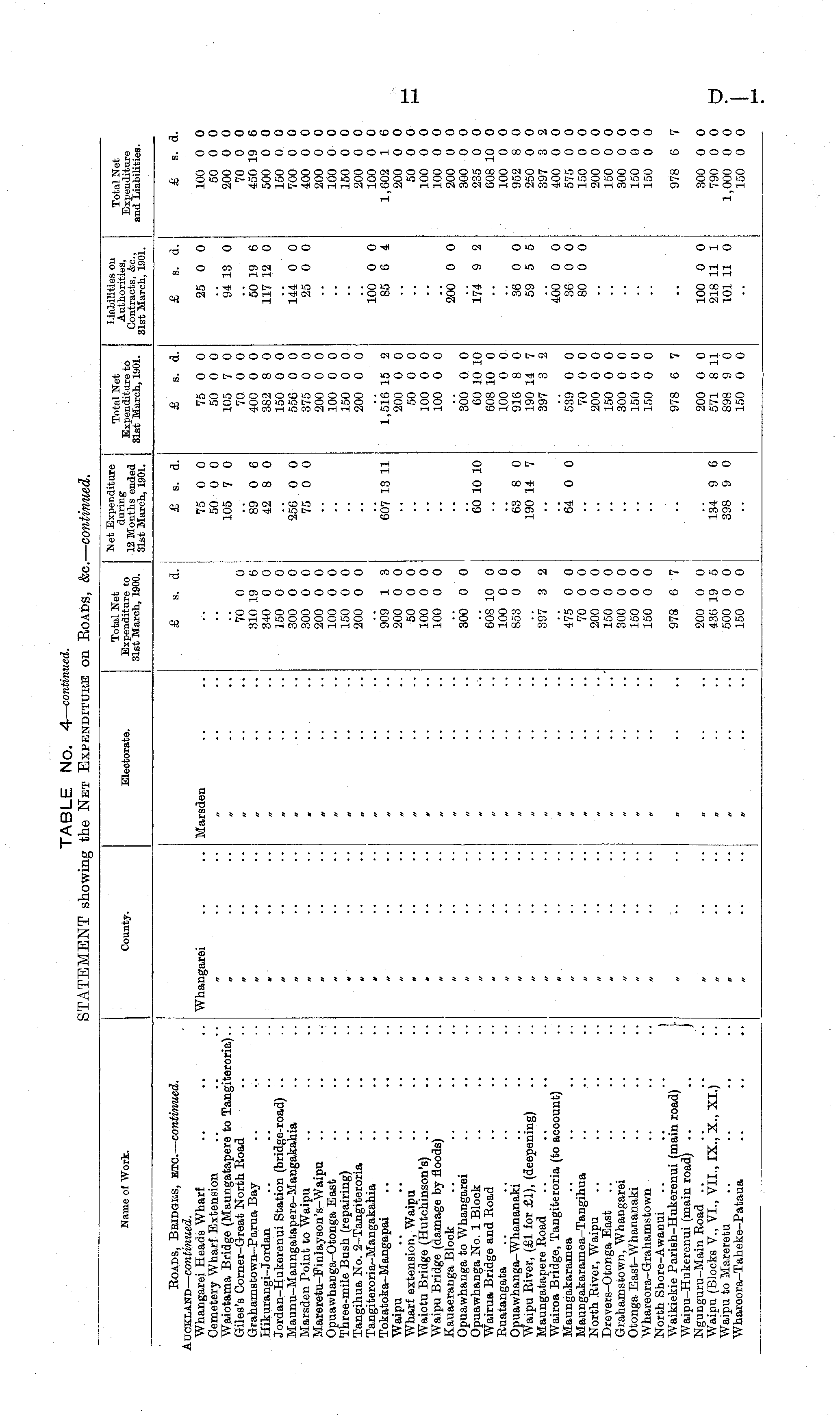 Name of Work. County. Electorate. Total Net Expenditure to 31st March, 1900. Met Expenditure during 12 Months ended 31st March, 1901. Total Net Expenditure to Slst March, 1901. Liabilities on Authorities, Contracts, &c, 31st March, 1901. Total Net Expenditure and Liabilities. Roads, Bridges, etc. — continued. Auckland — continued. Whangarei Heads Wharf Cemetery Wharf Extension Waiotama Bridge (Maungatapere to Tangiteroria).. Giles's Corner-Great North Road Grahamstown- Parua Bay .. .. .. Hikurangi-Jordan Jordan-Hukerenui Station (bridge-road) .. Maunu-Maungatapere-Mangakahia Marsden Point to Waipu Mareretu-Finlayson's-Waipu Opuawhanga-Otonga East Three-mile Bush (repairing) Tangihua No. 2-Tangiteroria Tangiteroria-Mangakahia Tokatoka-Mangapai Waipu Wharf extension, Waipu Waiotu Bridge (Hutchinson's) Waipu Bridge (damage by floods) Kauaeranga Block Opuawhanga to Whangarei Opuawhanga No. 1 Block Wairua Bridge and Road Ruatangata Opuawhanga-Whananaki Waipu River, (£1 for £1), (deepening) Maungatapere Road Wairoa Bridge, Tangiteroria (to account) Maungakaramea Maungakaramea-Tangihua North River, Waipu Drevers-Otonga East Grahamstown, Whangarei Otonga East-Whananaki Whareora-Grahamstown North Shore-Awanui .. .. .. | Waikiekie Parish-Hukerenui (main road) (• Waipu-Hukerenui (main road) .. .. j Ngunguru-Main Road .. Waipu (Blocks V., VI., VII., IX., X., XI.) Waipu to Mareretu Whareora-Taheke-Pataua Whangarei rt m ■ Marsden * i £ s. d. 70 0 0 310 19 6 340 0 0 150 0 0 300 0 0 300 0 0 200 0 0 100 0 0 150 0 0 200 0 0 909 1 3 200 0 0 50 0 0 100 0 0 100 0 0 300 0 0 £ s. d. 75 0 0 50 0 0 105 7 0 89 0 6 42 8 0 256 0 0 75 0 0 607 13 11 £ s. d. 75 0 0 50 0 0 105 7 0 70 0 0 400 0 0 382 8 0 150 0 0 556 0 0 375 0 0 200 0 0 100 0 0 150 0 0 200 0 0 1,516 15 2 200 0 0 50 0 0 100 0 0 100 0 0 300 0 0 60 10 10 608 10 0 100 0 0 916 8 0 190 14 7 397 3 2 £ s. d. 25 0 0 94 13 0 50 19 6 117 12 0 144 0 0 25 0 0 100 0 0 85 6 i 200 0 0 £ s. d. 100 0 0 50 0 0 200 0 0 70 0 0 450 19 6 500 0 0 150 0 0 700 0 0 400 0 0 200 0 0 100 0 0 150 0 0 200 0 0 100 0 0 1,602 1 6 200 0 0 50 0 0 100 0 0 100 0 0 200 0 0 300 0 0 235 0 0 608 10 0 100 0 0 952 8 0 250 0 0 397 3 2 400 0 0 575 0 0 150 0 0 200 0 0 150 0 0 300 0 0 150 0 0 150 0 0 it 60 10 10 174 9 2 __ i 608 10 0 100 0 0 853 0 0 63 8 0 190 14 7 36 0 0 59 5 5 397 3 2 i 400 0 0 36 0 0 80 0 0 475 0 0 70 0 0 200 0 0 150 0 0 300 0 0 150 0 0 150 0 0 64 0 0 539 0 0 70 0 0 200 0 0 150 0 0 300 0 0 150 0 0 150 0 0 978 6 7 978 6 7 978 6 7 200 0 0 436 19 5 500 0 0 150 0 0 134 9 6 398 9 0 200 0 0 571 8 11 898 9 0 150 0 0 100 0 0 218 11 1 101 11 0 300 0 0 790 0 0 1,000 0 0 150 0 0 • •