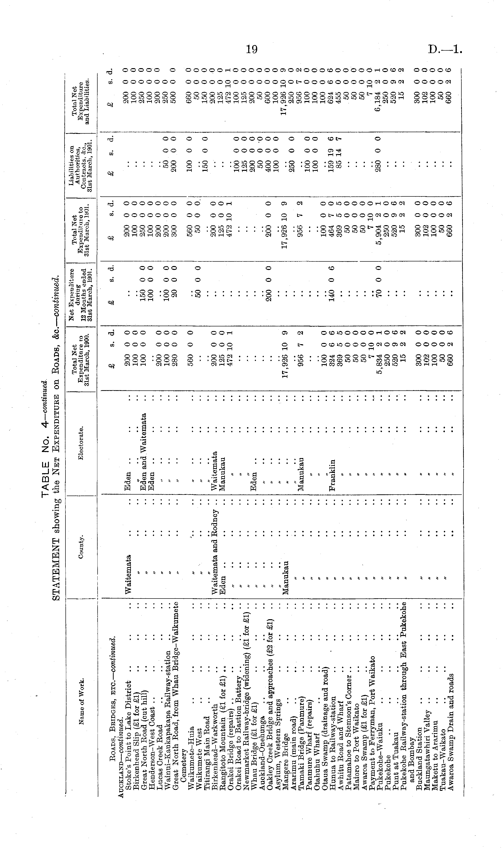 Name of Work. County. Electorate. Total Net Net Expenditure Total Net Liabilities on Total Net Expenditure to TO1 , In )h °° , , Expenditure to n™l™~Jti~ Expenditure 31st P March,1900. |LK*??90K «* M«oh, 1W1. and Liabilities. Roads, Bridges, etc. — continued. Auckland — continued. Stake's Point to Lake District Birkenhead Slip (£1 for £1) Great North Road (out hill) Henderson-West Coast Lucas Greek Road Wainui-Kaukapakapa Railway-station Great North Road, from Whau Bridge-Waikumete Cemetery Waikumete-Huia Waikumete West Titirangi Main Road Birkenhead-Warkworth Rangitoto Mountain (£1 for £1) Orakei Bridge (repairs) Orakei Road to Bastion Battery Newmarket Railway-bridge (widening) (£1 for £1) .. Whau Bridge (£1 for £1) Auckland-Onehunga Oakley Creek Bridge and approaches (£2 for £1) Asylum, Western Springs Mangere Bridge Ararimu (main road) .. .. .. Tamaki Bridge (Panmure) Panmure Wharf (repairs) Otahuhu Wharf Otaua Swamp (drainage and road) Hunua to Railway-station Awhitu Road and Wharf Patamahoe to Stemson's Corner Maioro to Port Waikato Awaroa Swamp (£1 for £1) Payment to Ferryman, Port Waikato Pukekohe-Waiuku Pukekohe Punt at Tuakau Pukekohe Railway-station through East Pukekohe and Bombay Buckland Station Maungatawhiri Valley .. Maketu to Ararimu Tuakau-Waikato Awaroa Swamp Drain and roads £ s. d. & s. d. £ s. d. £ s. d. £ s. d. Waitemata Eden Eden and Waitemata Eden 200 0 0 100 0 0 100 0 0 200 0 0 100 0 0 280 0 0 150 0 0 100 0 0 200 0 0 100 0 0 250 0 0 100 0 0 200 0 0 200 0 0 300 0 0 200 0 C 100 0 C 250 0 C 100 0 C 200 0 C 250 0 500 0 C 100 0 0 20 0 0 50 0 0 200 0 0 560 0 0 50 0 0 560 0 0 50 0 0. 100 0 0 660 0 C 50 0 C 150 0 C 200 0 C 125 0 C 472 10 1 100 0 C 125 0 C 200 0 C 50 0 C 600 0 C 100 0 C 17,926 10 S 250 0 C 956 7 2 100 0 C 100 0 C 100 0 0 624 6 6 455 0 C 50 0 0 50 0 C 50 0 C 7 10 C 6,184 2 1 250 0 C 520 9 6 15 2 2 150 0 0 Waitemata and Rodney .. Eden .. Waitemata Manukau 200 0 0 125 0 0 472 10 1 200 0 0 125 0 0 472 10 1 Eden 100 0 0 125 0 0 200 0 0 50 0 0 400 0 0 100 0 0 200 0 0 200 0 0 Manukau 17,926 10 9 17,926 10 9 250 0 0 Manukau 956 7 2 956 7 2 100 0 0 100 0 0 Franklin 100 0 0 324 6 6 369 5 5 50 0 0 50 0 0 50 0 0 7 10 0 5,834 2 1 250 0 0 520 9 6 15 2 2 140 0 6 100 0 0 464 7 0 369 5 5 50 0 0 50 0 0 50 0 0 7 10 0 5,904 2 1 250 0 0 520 9 6 15 2 2 159 19 6 85 14 7 TO 0 0 280 0 0 300 0 0 102 0 0 100 0 0 50 0 0 660 2 6 300 0 0 102 0 0 100 0 0 50 0 0 660 2 6 300 0 C 102 0 C 100 0 C 50 0 C 660 2 6