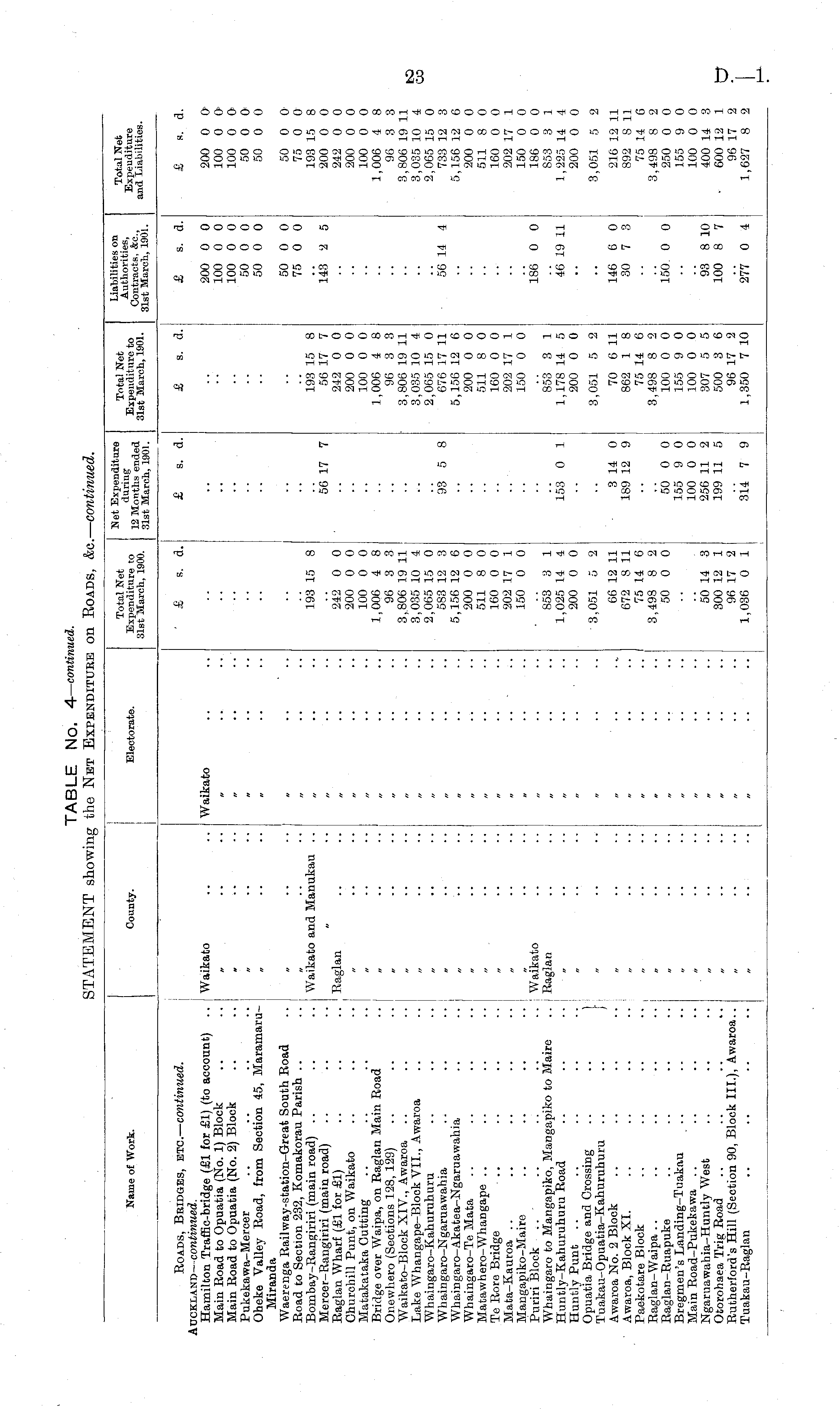 Name of Work. County. Electorate. Total Net Expenditure to 31st March, 1900. Net Expenditure during 12 Months ended 31st March, 1901. Total Net Expenditure to 31st March, 1901. Liabilities on Authorities, Contracts, ke., 31st March, 1901. Total Net Expenditure and Liabilities. Roads, Bridges, etc. — continued. Auckland — continued. Hamilton Traffic-bridge (£1 for £1) (to account) .. Waikato Main Road to Opuatia (No. 1) Block .. .. „ Main Road to Opuatia (No. 2) Block Pukekawa-Mercer .. .. .. .. „ Oheke Valley Road, from Section 45, MaramaruMiranda Waerenga Railway-station-Great South Road Road to Section 232, Komakorau Parish .. .. „ Bombay-Rangiriri (main road) .. .. .. Waikato and Manukau .. Mercer-Rangiriri (main road) .. .. .. „ Raglan Wharf (£1 for £1) .. .. .. Raglan Churchill Punt, on Waikato Matakataka Gutting Bridge over Waipa, on Raglan Main Road .. „ Onewhero (Sections 128, 129) Waikato-Block XIV., Awaroa Lake Whangape-Block VII., Awaroa Whaingaro-Kahuruhuru .. .. .. „ Whaingaro-Ngaruawahia .. .. .. „ Whaingaro-Akatea-Ngaruawahia .. .. „ Whaingaro-Te Mata .. .. .. .. „ Matawhero-Whangape .. .. .. .. „ Te Rore Bridge Mata-Kauroa .. .. .. .. .. „ Mangapiko-Maire Puriri Block .. .. .. .. .. Waikato Whaingaro to Mangapiko, Mangapiko to Maire .. i Raglan Huntly-Kahuruhuru Road Huntly Punt Opuatia Bridge and Crossing .. .. ) Tuakau-Opuatia-Kahuruhuru .. .. [ Awaroa No. 2 Block Awaroa, Block XI. Paekotare Block .. .. .. .. f Raglan- Waipa .. .. .. .. .. I „ Raglan-Ruapuke Bregmen's Landing-Tuakau Main Road-Pukekawa .. Ngaruawabia-Huntly West .. .. Otorohaea Trig Road Rutherford's Hill (Section 90, Block III.), Awaroa.. Tuakau-Raglan .. .. .. .. „ Waikato £ s. d. 193 15 8 242 0 0 200 0 0 100 0 0 1,006 4 8 96 3 3 3,806 19 11 3,035 10 4 2,065 15 0 583 12 3 5,156 12 6 200 0 0 511 8 0 160 0 0 202 17 1 150 0 0 £ s. d. 56 17 7 93 5 8 £ s. d. 193 15 8 56 17 7 242 0 0 200 0 0 100 0 0 1,006 4 8 96 3 3 3,806 19 11 3,035 10 4 2,065 15 0 676 17 11 5,156 12 6 200 0 0 511 8 0 160 0 0 202 17 1 150 0 0 £ s. d. 200 0 0 100 0 0 100 0 0 50 0 0 50 0 0 50 0 0 75 0 0 143 53 5 56 14 4 £ a. d. 200 0 0 100 0 O 100 0 0 50 0 0 50 0 0 50 0 0 75 0 0 193 15 8 200 0 0 242 0 0 200 0 0 100 0 0 1,006 4 8 96 3 3 3,806 19 11 3,035 10 4 2,065 15 0 733 12 3 5,156 12 6 200 0 0 511 8 0 160 0 0 202 17 1 150 0 0 186 0 0 853 3 1 1,225 14 4 200 0 0 853 3 1 1,025 14 4 200 0 0 186 0 0 153 0 1 853 3 1 1,178 14 5 200 0 0 46 19 11 3,051 5 2 3,051 5 2 3,051 5 2 66 12 11 672 8 11 75 14 6 3,498 8 2 50 0 0 3 14 0 189 12 9 50 0 0 155 9 0 100 0 0 256 11 2 199 11 5 70 6 11 862 1 8 75 14 6 3,498 8 2 100 0 0 155 9 0 100 0 0 307 5 5 500 3 6 96 17 2 1,350 7 10 146 6 0 30 7 3 150 0 0 216 12 11 892 8 11 75 14 6 3,498 8 2 250 0 0 155 9 0 100 0 0 400 14 3 600 12 1 96 17 2 1,627 8 2 50 14 3 300 12 1 96 17 2 1,036 0 1 93 8 10 100 8 7 314 7 9 277 0 4