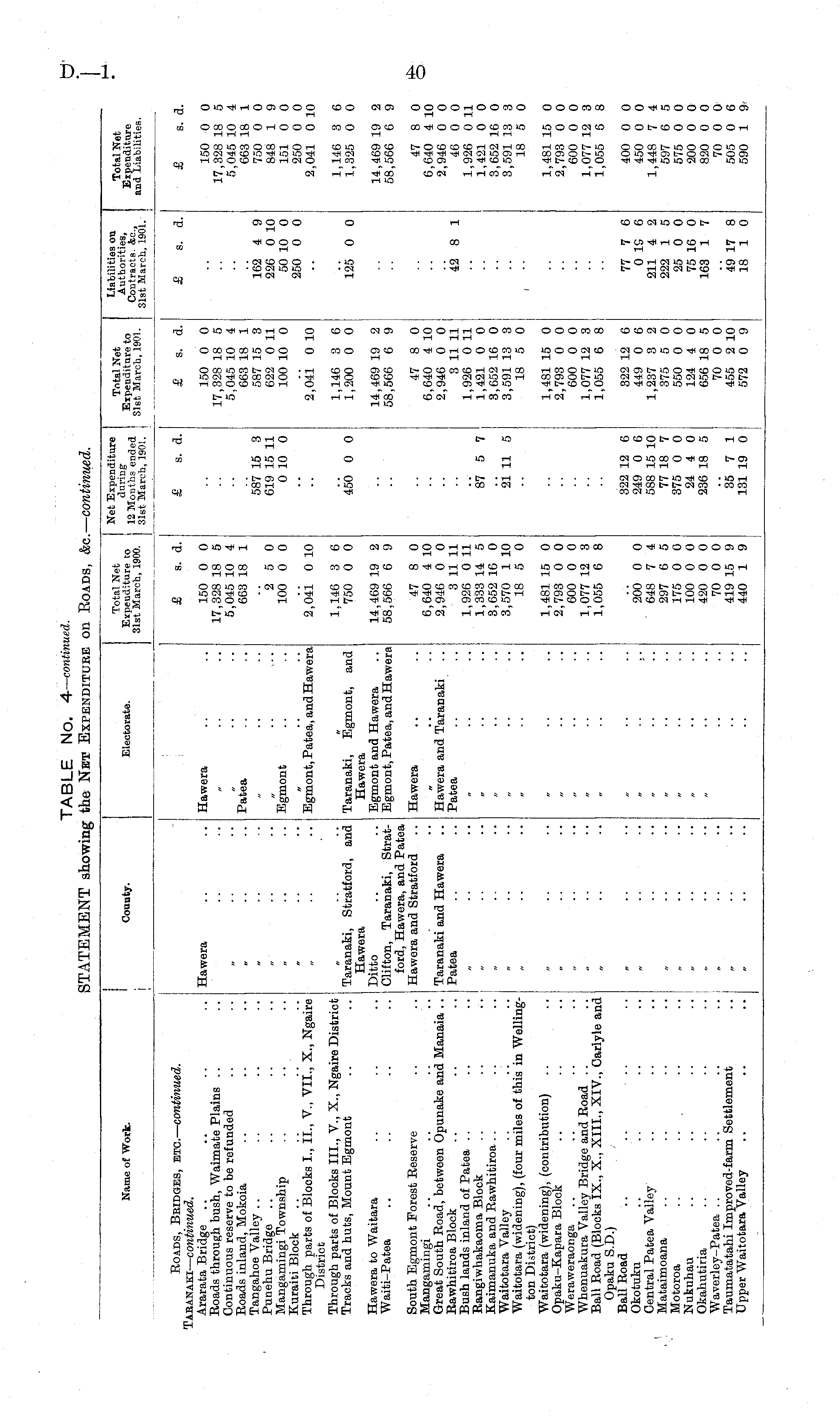 Name of Wort. County. Electorate. Total Net Expenditure to 31st March, 1900. Net Expenditure during , 12 Montlis ended 31st Maren, 1901. Tntnl -Not Liabilities on olst March, 1901. slst Marchi 190L Total Net Expenditure and Liabilities. i Roads, Bbidges, etc. — continued. Tabanaki — continued. Ararata Bridge Roads through bush, Waimate Plains Continuous reserve to be refunded Roads inland, Mokoia Tangahoe Valley Punehu Bridge Mangamingi Township Kuraiti Block Through parts of Blocks I., II., V., VII., X., Ngaire District Through parts of Blocks III., V., X., Ngaire District Tracks and huts, Mount Egmont Hawera Hawera Patea £ s. d. 150 0 0 17,328 18 5 5,045 10 4 663 18 1 2 5 0 100 0 0 £ s. d. 587 15 3 619 15 11 0 10 0 £ S. d. 150 0 0 17,328 18 5 5,045 10 4 663 18 1 587 15 3 622 0 11 100 10 0 £ s. d. 162 4 9 226 0 10 50 10 0 250 0 0 £ S. d. 150 0 0 17,328 18 5 5,045 10 4 663 18 1 750 0 0 848 1 9 151 0 0 250 0 0 2,041 0 10 Egmont Egmont, Patea, and Hawera 2,041 0 10 2,041 0 10 Taranaki, Stratford, and Hawera Ditto Clifton, Taranaki, Stratford, Hawera, and Patea Hawera and Stratford Taranaki, Egmont, and Hawera Egmont and Hawera Egmont, Patea, and Hawera 1.146 3 6 750 0 0 450 0 0 1,146 3 6 1,200 0 0 125 0 0 1,146 3 6 1,325 0 0 Hawera to Waitara Waiti-Patea 14,469 19 2 58,566 6 9 14,469 19 2 58,566 6 9 14,469 19 2 58,566 6 9 South Egmont Forest Eeserve Mangamingi Great South Road, between Opunake and Manaia .. Rawhitiroa Block Bush lands inland of Patea .. Rangiwhakaoma Block Kaimanuka and Rawhitiroa .. Waitotara Valley Waitotara (widening), (four miles of this in Wellington District) Waitotara (widening), (contribution) Opaku-Kapara Block Weraweraonga Whenuakura Valley Bridge and Road Ball Road (Blocks IX., X., XIII., XIV., Oarlyle and Opaku S.D.) Ball Roaa Okotuku Central Patea Valley Mataimoana Motoroa .. Nukuhau Okahutiria Waverley-Patea Taumatatahi Improved-farm Settlement Upper Waitotara Valley Taranaki and Hawera Patea Hawera Hawera and Taranaki Patea .. 47 8 0 6,640 4 10 2,946 0 0 3 11 11 1,926 0 11 1,333 14 5 3,652 16 0 3,570 1 10 18 5 0 1,481 15 0 2,793 0 0 600 0 0 1,077 12 3 1,055 6 8 87 5 7 21 11 5 47 8 0 6,640 4 10 2,946 0 0 3 11 11 1,926 0 11 1,421 0 0 3,652 16 0 3,591 13 3 18 5 0 1,481 15 0 2,793 0 0 600 0 0 1,077 12 3 1,055 6 8 I 42 8 1 47 8 0 6,640 4 10 2,946 0 0 46 0 0 1,926 0 11 1,421 0 0 3,652 16 0 3,591 13 3 18 5 0 1,481 15 0 2,793 0 0 600 0 0 1,077 12 3 1,055 6 8 200 0 0 648 7 4 297 6 5 175 0 0 100 0 0 420 0 0 70 0 0 419 15 9 440 1 9 322 12 6 249 0 6 588 15 10 77 18 7 375 0 0 24 4 0 236 18 5 322 12 6 449 0 6 1,237 3 2 375 5 0 550 0 0 124 4 0 656 18 5 70 0 0 455 2 10 572 0 9 77 7 6 0 IS 6 211 4 2 222 1 5 25 0 0 75 16 0 163 1 7 400 0 0 450 0 0 1,448 7 4 597 6 5 575 0 0 200 0 0 820 0 0 70 0 0 505 0 6 590 1 9> 35 7 1 131 19 0 49 17 8 18 1 0