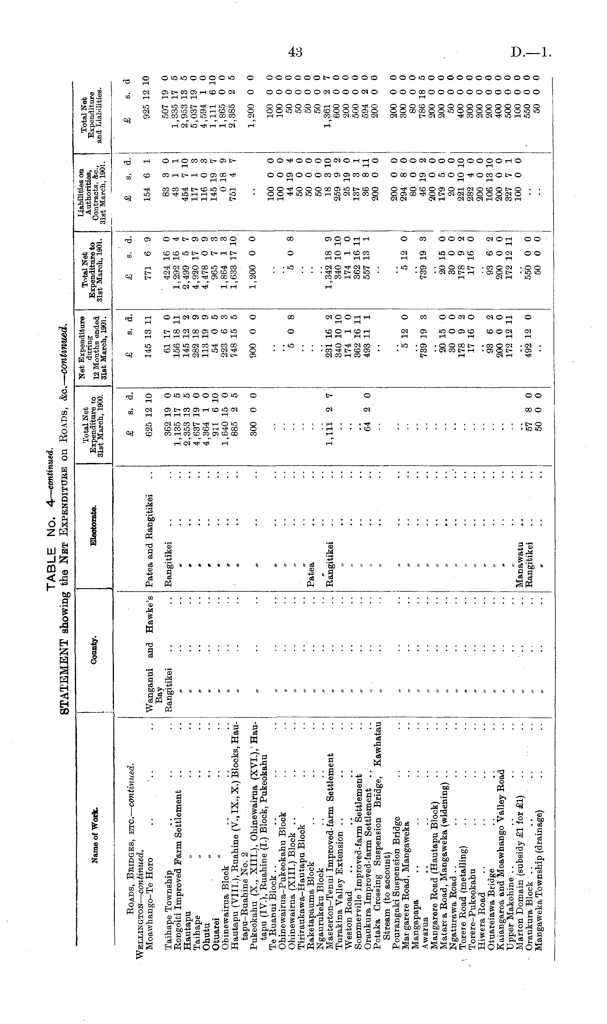 Name of Work. Comity. Electorate. Total Net Expenditure to 31st March, 1900. Net Expenditure during 12 Months ended 31st March, 1901. Total Net Expenditure to 31st March, 1901. Liabilities on Authorities, Contracts, &c, 31st March, 1901. Total Net Expenditure and Liabilities. Roads, Bridges, etc. — continued. Wellington — continued. Moawhango-Te Horo £ s. d. £ s. d. £ s. d. £ s. d. £ s. d Patea and Rangitikei 625 12 10 145 13 11 771 6 9 154 6 1 925 12 1C Taihape Township Rongoiti Improved Farm Settlement Hautapu „ Taihape Ohutu Otuarei Obinewairua Blook Hautapu (VIII.), Ruahine (V.,IX.,X.) Blocks, Hau-tapu-Ruahine No. 2 Pukeokahu (X., XIII.), Ohinewairua (XVI.),' Hautapu (IV.), Ruahine (I.) Blook, Pukeokahu Te Ruanui Block .. Ohinewairua-Pukeokahu Block Ohinewairua (XIII.) Block .. Tiriraukawa-Hautapu Block Raketapauma Block Ngaurukeku Block Masterton-Tenui Improved- farm Settlement Turakina Valley Extension .. .. Weston Road Sommerville Improved-farm Settlement Oraukura Improved-farm Settlement Potaka Crossing Suspension Bridge, Kawhatau Stream (to aooount) Pourangaki Suspension Bridge Margarere Eoad, Mangaweka Mangapapa Awarua Mangarere Road (Hautapu Block) Matarra Road, Mangaweka (widening) Ngaturawa Road Torere Road (metalling) Torere-Pukeokahu Hiwera Road Otuareiawa Bridge Kaiangaroa and Moawhango Valley Road Upper Makohine Marton Domain (subsidy £1 for £1) Oraukura Block Mangaweka Township (drainage) Wanganui and Hawke's Bay Bangitikei Rangitikei 362 19 0 1,135 17 5 2,353 13 5 4,637 19 0 4,364 1 0 911 6 10 1,640 15 0 885 2 5 61 17 0 156 18 11 145 12 2 282 18 9 113 19 9 54 0 5 223 6 3 748 15 5 83 3 0 43 1 1 454 7 10 117 1 3 116 0 3 145 19 7 0 18 9 751 4 7 507 19 C 1,335 17 £ 2,953 13 i 5,037 19 C 4,594 1 C 1,111 6 1C 1,865 0 ( 2,385 2 t * • • 424 16 0 1,292 16 4 2,499 5 7 4,920 17 9 4,478 0 9 965 7 3 1,864 1 3 1,633 17 10 * • • 300 0 0 900 0 0 1,200 0 0 1,200 0 C Patea Rangitikei l.iii 2 7 5 0 8 231 16 2 340 10 10 174 1 0 362 16 11 493 11 1 5 0 8 1,342 18 9 340 10 10 174 1 0 362 16 11 557 13 1 100 0 0 100 0 0 44 19 4 50 0 0 50 0 0 50 0 0 18 3 10 259 9 2 25 19 0 137 3 1 36 8 11 200 0 0 100 0 ( 100 0 C 50 0 C 50 0 C 50 0 C 50 0 C 1,361 2 't 600 0 C 200 0 C 500 0 C 594 2 C 200 0 C 64 2 0 5 12 0 739 19 3 20 15 0 30 0 0 178 9 2 17 16 0 5 12 0 739 19 3 20 15 0 30 0 0 178 9 2 17 16 0 200 0 0 294 8 0 80 0 0 46 19 2 200 0 0 179 5 0 20 0 0 221 10 10 282 4 0 200 0 0 106 13 10 200 0 0 327 7 1 100 0 0 200 0 C 300 0 C 80 0 C 786 18 £ 200 0 C 200 0 C 50 0 ( 400 0 C 300 0 C 200 0 C 200 0 C 400 0 C 500 0 C 100 0 C 550 0 C 50 0 C 93 6 2 200 0 0 172 12 11 93 6 2 200 0 0 172 12 11 Manawatu Rangitikei 57 8 0 50 0 0 492 12 0 550 0 0 50 0 0