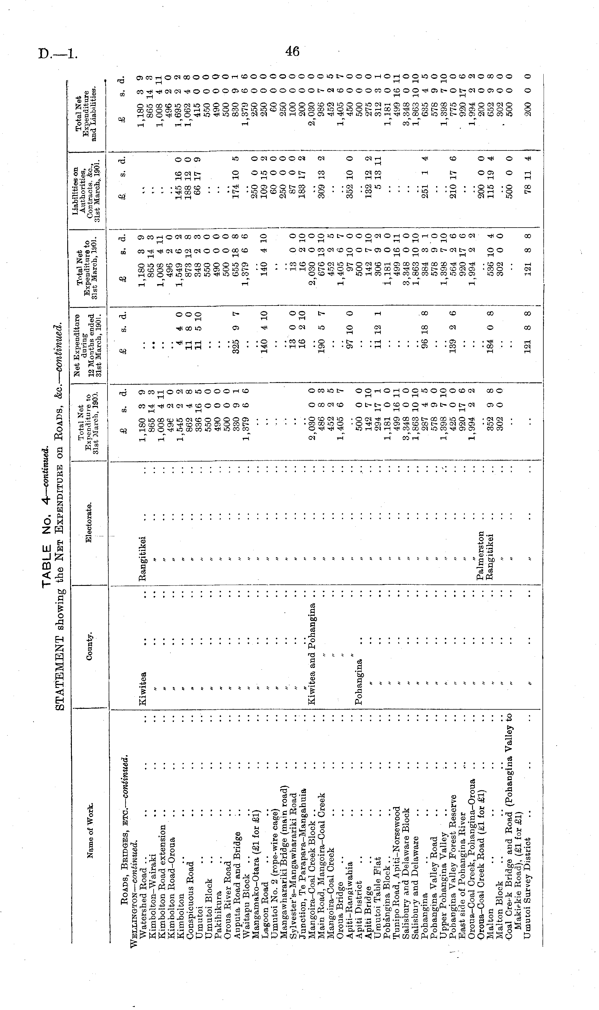 Electorate. Total Net Expenditure to Slst March, 1903. Net Expenditure during 12 Months ended 31st March, 1901. Total Net Expenditure to 31st March, 1901. Liabilities on Authorities, Contracts. &c, 31st March, 1901. Total Net Expenditure and Liabilities. Name of Work. County. Roads, Bridges, etc. — continued. Wellington — continued. Watershed Road Kimbolton-Wairaki Kimbolton Road extension Kimbolton Road-Oroua Kimbolton Conspicuous Road Umutoi Umutoi Block Pakihikura Oroua River Road Auputa Road and Bridge '.. Waitapu Block Mangamako-Otara (£1 for £1) Lagoon Road Umutoi No. 2 (rope-wire cage) Mangawharariki Bridge (main road) Sylvester's-Mangawharariki Road Junction, Te Parapara-Mangahuia Mangoira-Coal Creek Block Main Road, Mangoira-Coal Creek Mangoira-Coal Creek Oroua Bridge Apiti-Rangiwahia Apiti District Apiti Bridge Umutoi Table Plat Pohangina Block .. TunipoRoad, Apiti-Norsewood Salisbury and Delaware Block Salisbury and Delaware Pohangina Pohangina Valley Road Upper Pohangina Valley Pohangina Valley Forest Reserve East side of Pobangina River Oroua-Coal Creek, Pohangina-Oroua Oroua-Coal Creek Road (£1 for £1) Malton Malton Block Coal Creek Bridge and Road (Pohangina Valley to Makipkie Road), (£1 for £1) Umutoi Survey District £ s. d. £ S. d. £ s. d. £. s. d. £ s. d. Rangitikei 1,180 3 9 865 14 3 1,008 4 11 496 2 0 1,545 2 2 862 4 8 336 16 5 550 0 0 490 0 0 500 0 0 330 9 1 1,379 6 6 1,180 3 9 865 14 3 1,008 4 11 496 2 0 1,549 6 2 873 12 8 348 2 3 550 0 0 490 0 0 500 0 0 655 18 8 1,379 6 6 1.180 3 9 865 14 3 1,008 4 11 496 2 0 1,695 2 2 1,062 4 8 415 0 0 550 0 0 490 0 0 500 0 0 830 9 1 1,379 6 6 250 0 0 250 0 0 60 0 0 250 0 0 100 0 0 200 0 0 2,030 0 0 986 7 0 452 2 5 1,405 6 7 450 0 0 500 0 0 275 0 0 312 3 1 1.181 0 0 499 16 11 3,348 0 0 1,863 10 10 635 4 5 578 9 0 1,398 7 10 775 0 0 ' 920 17 6 1,994 2 2 200 0 0 652 9 8 . 302 0 0 500 0 0 Kiwitea ■ • 4 4 0 11 8 0 11 5 10 145 16 0 188 12 0 66 17 9 325 9 7 174 10 5 140 4 10 140 4 10 250 0 0 109 15 2 60 0 0 250 0 0 87 0 0 183 17 2 13 0 0 16 2 10 13 0 0 16 2 10 2,030 0 0 676 13 10 452 2 5 1,405 6 7 97 10 0 500 0 0 142 7 10 306 9 2 1,181 0 0 499 16 11 3,348 0 0 1,863 10 10 384 3 1 578 9 0 1,398 7 10 564 2 6 920 17 6 1,994 2 2 Kiwitea and Pohangina .. 2,030 0 0 486 8 3 452 2 5 1,405 6 7 190 5 7 309 13 2 97 10 0 352 10 0 Pohangina 500 0 0 142 7 10 294 17 1 1,181 0 0 499 16 11 3,348 0 0 1,863 10 10 287 4 5 578 9 0 1,398 7 10 425 0 0 920 17 6 1,994 2 2 11 12 1 96 18 8 132 12 2 5 13 11 251 1 4 139 2 6 210 17 6 Palmerston Rangitikei 352 9 8 302 0 0 184 0 8 536 10 4 302 0 0 200 0 0 115 19 4 500 0 0 121 8 8 121 8 8 78 11 4 200 0 0
