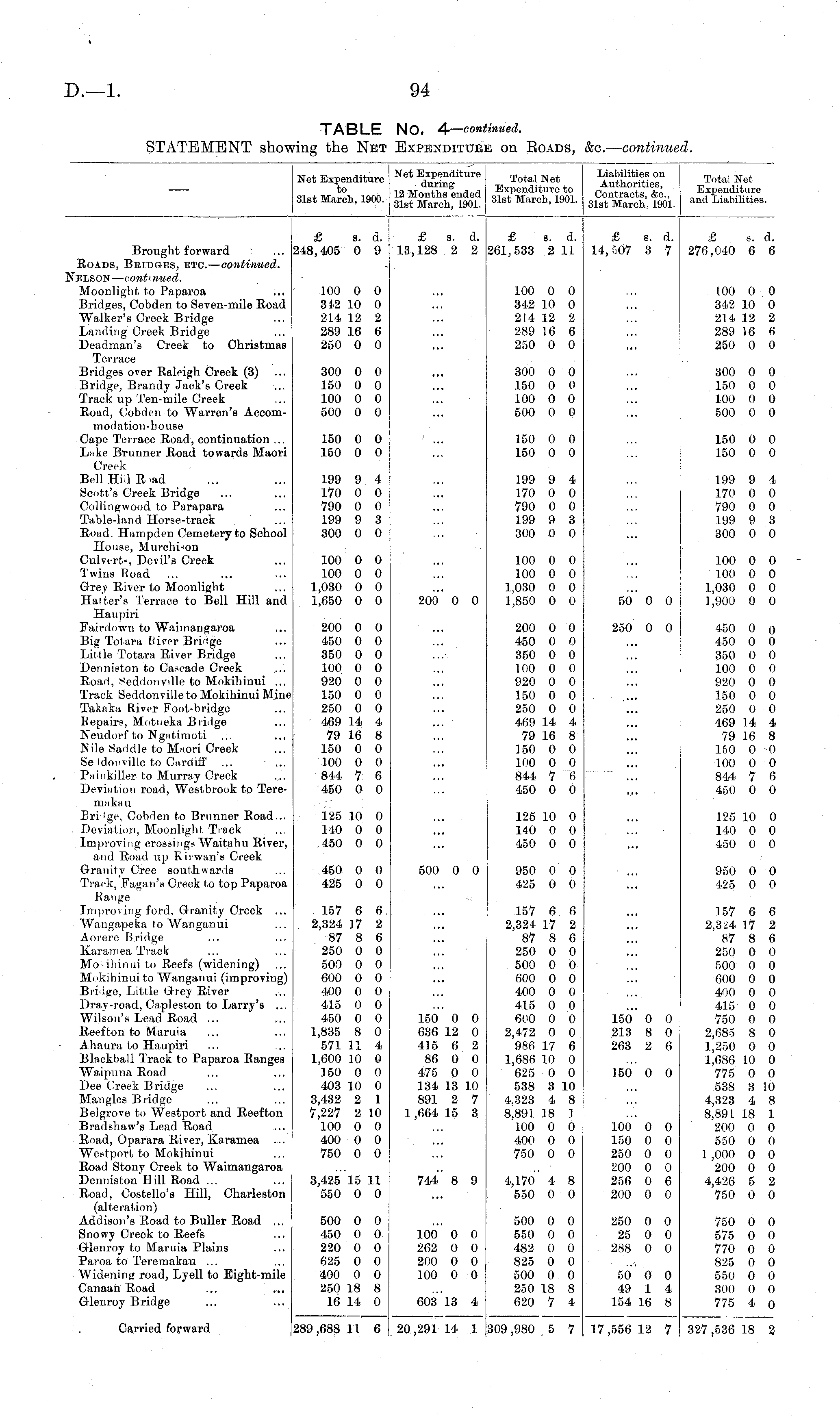 Net Expenditure to Slst March, 1900. Net Expenditure Total Net 12 31st March, 1901. rfist Maron ' 190J - Liabilities on Authorities, Contracts, &c, 31st March, 1901. Total Net Expenditure and Liabilities. Brought forward Roads, Bkidges, etc. — continued. ELSON — continued. Moonlight to Paparoa Bridges, Cobden to Seven-mile Road Walker's Creek Bridge Landing Creek Bridge Deadman's Creek to Christmas Terrace Bridges over Raleigh Creek (3) Bridge, Brandy Jack's Creek Track up Ten-mile Creek Road, Cobden to Warren's Accom-modation-house Cape Terrace Road, continuation ... Luke Brunner Road towards Maori Creek Bell Hill R<ad Scott's Creek Bridge Collinewood to Parapara Table-land Horse-track Road. Hampden Cemetery to School House, Murchi*on Culvert-, Devil's Creek Twins Road Grey River to Moonlight Halter's Terrace to Bell Hill and Haupiri Fairdown to Waimangaroa Big Totara iiiver Bridge Little Totara River Bridge Denniston to Cascade Creek Road, Seddonville to Mokihinui ... Track- Seddonville to Mokihinui Mine Takaka River Foot-bridge Kepairs, Motueka Bridge Neudorf to Ngatimoti Nile Saddle to Maori Creek Se Idonvilie to Cardiff ... Painkiller to Murray Creek Deviation road, Westbrook to Teremakau Bri ige. Cobden to Brunner Road... Deviation, Moonlight Track Improving crossingsWaita.hu River, and Road up Kiiwnn's Creek Granity Cree southwards Track, Creek to top Paparoa Kange Improting ford, Granity Creek ... Wangapeka to Wanganui Aorere Bridge Kararnea Track Mo ihinui to Reefs (widening) Mokihinui to Wanganui (improving) Bridge, Little Grey River Dray-road, Capleston to Larry's ... Wilson's Lead Road ... Reef ton to Maruia Ah aura to Haupiri Blackball Track to Paparoa Ranges Waipuna Road Dee Creek Bridge Mangles Bridge Belgrove to Westport and Reefton Bradshaw's Lead Road Road, Oparara River, Karamea ... Westport to Mokihinui Road Stony Creek to Waimangaroa Denniston Hill Road ... Road, Oostello's Hill, Charleston (alteration) | Addison's Road to Buller Road ... ! Snowy Creek to Reefs Glenroy to Maruia Plains Paroa to Teremakau ... Widening road, Lyell to Eight-mile Canaan Road ... ... Glenroy Bridge £ s. d. 248,405 0 9 £ s. d. 13,128 2 2 £ s. d. 261,533 2 11 £ s. d. 14,507 3 7 £ s. d. 276,040 6 6 100 0 0 342 10 0 214 12 2 289 16 6 250 0 0 100 0 0 342 10 0 214 12 2 289 16 6 250 0 0 100 0 0 342 10 0 214 12 2 289 16 6 250 0 0 300 0 0 150 0 0 100 0 0 500 0 0 300 0 0 150 0 0 100 0 0 500 0 0 300 0 0 150 0 0 100 0 0 500 0 0 150 0 0 150 0 0 150 0 0 150 0 0 150 0 0 150 0 0 199 9 4 170 0 0 790 0 0 199 9 3 300 0 0 199 9 4 170 0 0 790 0 0 199 9 3 300 0 0 199 9 4 170 0 0 790 0 0 199 9 3 300 0 0 100 0 0 100 0 0 1,030 0 0 1,650 0 0 100 0 0 100 0 0 1,030 0 0 1,850 0 0 100 0 0 100 0 0 1,030 0 0 1,900 0 0 200 0 0 50 0 0 200 0 0 450 0 0 350 0 0 100 0 0 920 0 0 150 0 0 250 0 0 469 14 4 79 16 8 150 0 0 100 0 0 844 7 6 450 0 0 200 0 0 450 0 0 350 0 0 100 0 0 920 0 0 150 0 0 250 0 0 469 14 4 79 16 8 150 0 0 100 0 0 844 7 6 450 0 0 250 0 0 450 0 o 450 0 0 350 0 0 100 0 0 920 0 0 150 0 0 250 0 0 469 14 4 79 16 8 150 0 0 100 0 0 844 7 6 450 0 0 125 10 0 140 0 0 450 0 0 125 10 0 140 0 0 450 0 0 125 10 0 140 0 0 450 0 0 450 0 0 425 0 0 500 0 0 950 0 0 425 0 0 950 0 0 425 0 0 157 6 6 2,324 17 2 87 8 6 250 0 0 500 0 0 600 0 0 400 0 0 415 0 0 450 0 0 1,835 8 0 571 11 4 1,600 10 0 150 0 0 403 10 0 3,432 2 1 7,227 2 10 100 0 0 400 0 0 750 0 0 150 0 0 636 12 0 415 6 2 86 0 0 475 0 0 134 13 10 891 2 7 1,664 15 3 157 6 6 2,324 17 2 87 8 6 250 0 0 500 0 0 600 0 0 400 0 0 415 0 0 600 0 0 2,472 0 0 986 17 6 1,686 10 0 625 0 0 538 3 10 4,323 4 8 8.891 18 1 100 0 0 400 0 0 750 0 0 150 0 0 213 8 0 263 2 6 157 6 6 2,324 17 2 87 8 6 250 0 0 500 0 0 600 0 0 400 0 0 415 0 0 750 0 0 2.685 8 0 1,250 0 0 1.686 10 0 775 0 0 538 3 10 4,323 4 8 8,891 18 1 200 0 0 550 0 0 1 ,000 0 0 200 0 0 4,426 5 2 750 0 0 150 0 0 100 0 0 150 0 0 250 0 0 200 0 0 256 0 6 200 0 0 3,425 15 11 550 0 0 744 8 9 4,170 4 8 550 0 0 500 0 0 450 0 0 220 0 0 625 0 0 400 0 0 250 18 8 16 14 0 100 0 0 262 0 0 200 0 0 100 0 0 500 0 0 550 0 0 482 0 0 825 0 0 500 0 0 250 18 8 620 7 4 250 0 0 25 0 0 238 0 0 750 0 0 575 0 0 770 0 0 825 0 0 550 0 0 300 0 0 775 4 0 50 0 0 49 1 4 154 16 8 603 13 4 Carried forward 289,688 11 6 20,291 14 1 309,980 5 7 17,556 12 7 327,536 18 2