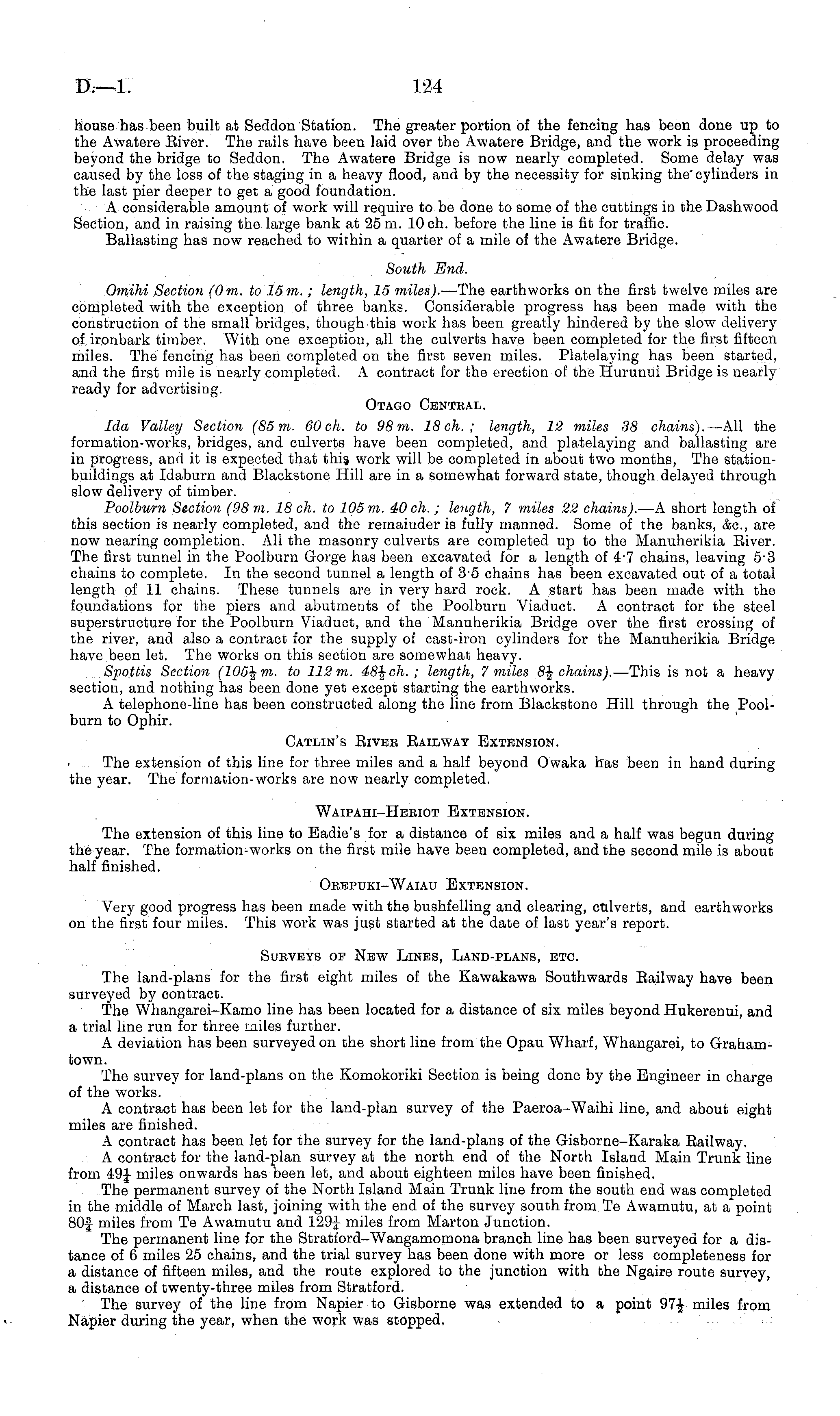 house has been built at Seddon Station. The greater portion of the fencing has been done up to the Awatere Eiver. The rails have been laid over the Awatere Bridge, and the work is proceeding beyond the bridge to Seddon. The Awatere Bridge is now nearly completed. Some delay was caused by the loss of the staging in a heavy flood, and by the necessity for sinking the cylinders in the last pier deeper to get a good foundation. A considerable amount of work will require to be done to some of the cuttings in the Dashwood Section, and in raising the large bank at 25 m. 10 eh. before the line is fit for traffic. Ballasting has now reached to within a quarter of a mile of the Awatere Bridge. South End. Omihi Section (0 m. to 15 m. ; length, 15 miles). —The earthworks on the first twelve miles are completed with the exception of three banks. Considerable progress has been made with the construction of the small bridges, though this work has been greatly hindered by the slow delivery of ironbark timber. With one exception, all the culverts have been completed for the first fifteen miles. The fencing has been completed on the first seven miles. Platelaying has been started, and the first mile is nearly completed. A contract for the erection of the Hurunui Bridge is nearly ready for advertising. Otago Central. Ida Valley Section (85 m. 60ch. to 98 m. 18ch. ; length, 12 miles 38 chains). —All the formation-works, bridges, and culverts have been completed, and platelaying and ballasting are in progress, and it is expected that this work will be completed in about two months, The stationbuildings at Idaburn and Blackstone Hill are in a somewhat forward state, though delayed through slow delivery of timber. Poolburn Section (98 m. 18 eh. to 105 m. 40 eh. ; length, 7 miles 22 chains). —A short length of this section is nearly completed, and the remainder is fully manned. Some of the banks, &c, are now nearing completion. All the masonry culverts are completed up to the Manuherikia Eiver. The first tunnel in the Poolburn Gorge has been excavated for a length of 4-7 chains, leaving 5 - 3 chains to complete. In the second tunnel a length of 3-5 chains has been excavated out of a total length of 11 chains. These tunnels are in very hard rock. A start has been made with the foundations for the piers and abutments of the Poolburn Viaduct. A contract for the steel superstructure for the Poolburn Viaduct, and the Manuherikia Bridge over the first crossing of the river, and also a contract for the supply of cast-iron cylinders for the Manuherikia Bridge have been let. The works on this section are somewhat heavy. Spottis Section (105\m. to 112 m. 48\ch. ; length, 7 miles 8\ chains). —This is not a heavy section, and nothing has been done yet except starting the earthworks. A telephone-line has been constructed along the line from Blackstone Hill through the Poolburn to Ophir. Catlin's Eiver Eailway Extension. • . The extension of this line for three miles and a half beyond Owaka has been in hand during the year. The formation-works are now nearly completed. Waipahi-Heriot Extension. The extension of this line to Eadie's for a distance of six miles and a half was begun during the year. The formation-works on the first mile have been completed, and the second mile is about half finished. Orepuki-Waiau Extension. Very good progress has been made with the bushfelling and clearing, culverts, and earthworks on the first four miles. This work was just started at the date of last year's report. Surveys of New Lines, Land-plans, etc. The land-plans for the first eight miles of the Kawakawa Southwards Eailway have been surveyed by contract. The Whangarei-Kamo line has been located for a distance of six miles beyond Hukerenui, and a trial line run for three miles further. A deviation has been surveyed on the short line from the Opau Wharf, Whangarei, to Grahamtown. The survey for land-plans on the Komokoriki Section is being done by the Engineer in charge of the works. A contract has been let for the land-plan survey of the Paeroa-Waihi line, and about eight miles are finished. A contract has been let for the survey for the land-plans of the Gisborne-Karaka Eailway. A contract for the land-plan survey at the north end of the North Island Main Trunk line from 49f miles onwards has been let, and about eighteen miles have been finished. The permanent survey of the North Island Main Trunk line from the south end was completed in the middle of March last, joining with the end of the survey south from Te Awamutu, at a point 80f miles from Te Awamutu and 129J miles from Marton Junction. The permanent line for the Stratford-Wangamomona branch line has been surveyed for a distance of 6 miles 25 chains, and the trial survey has been done with more or less completeness for a distance of fifteen miles, and the route explored to the junction with the Ngaire route survey, a distance of twenty-three miles from Stratford. The survey of the line from Napier to Gisborne was extended to a point 97-J miles from Napier during the year, when the work was stopped.