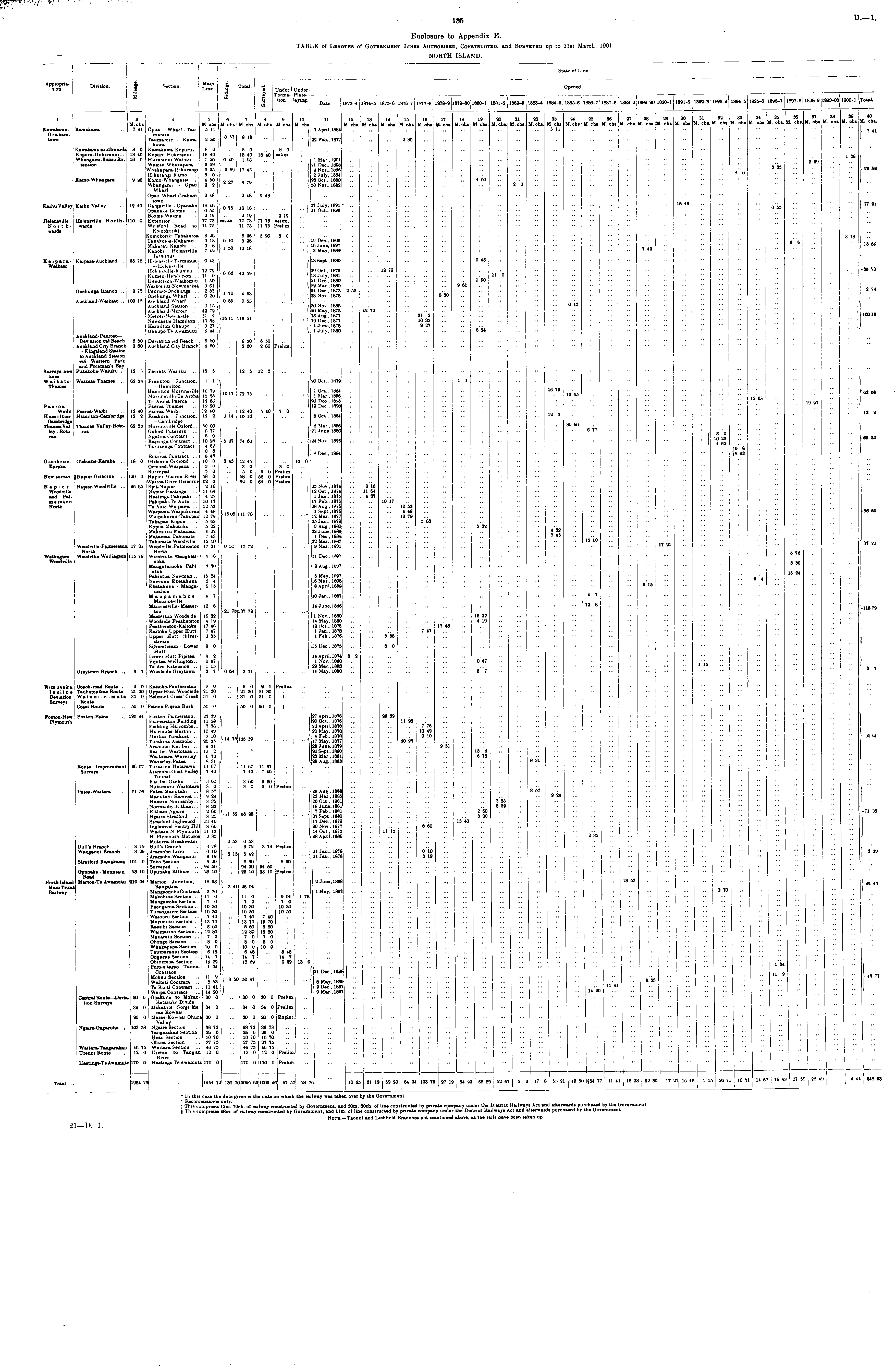 Enclosure to Appendix E. TABLE of Lengths of Government Lines Authorised, Constructed, and Sukveyed up to 31st March, 1901. NORTH ISLAND. - - I [ St ate of Line. I g ! ■ i ■ ■ Section. |S f Total. J, J ■ I l Under ; Under .... Forma-; Plate- — - - . , - . — . ■■ -—- tion. aying. . 1873-4 j 1874-5' 1876-7 1377-8 1878-9 1879-8oJ 1880-1 1881-2 1882-3 1883-4 1884-5 AP ti F on ria " ! Divieion. Opened. 1885-6 1886-7 1 1887-8 1888-9 1889-90 1890-1 1891-2 1892-3 1893-4 1894-5 1895-6 1896-7 I 1897-8 1898-9 |l899-00 1900--1 [ Total. ' ■ ' 1 1 Kawakawa- j Kawakawa Graham- [ Kawakawa southwards Kopuru-Hukerenui.. Whangaroi-Kamo Ex- . tension Kamo-Wh&ngarei tan G to tail 3elt N Wi ta W 1 3 4 5 6. I 7 .8 . M.ehs. M.chs. M.nhs.'M. cha. M.chs. M M.chs. M.chs. M.chs. M.chs. M.chs. M wakawa- j Rawakawa .. 7 41 Opua Wharf-Tau- 5 11 ) j Jraham- ' marete I n w i ft -ift own Taumarew - Kawa- 2 30 f ° 57 8 l8 kawa . J I ■ ; Kawakawa southwards 8 0 Kawakawa-Kopuru -- 80 ..80 .. f Ropuru-Hukerenui.. 18 40 Kopuru-Hukerenui.. 18 40 .. 18 40 18 40 ea Whangarei-KamoEs- 16 0 Hukercnni-WaioLu .. 126 0 40 166 tension Waiotu-.Whakapara 3 29 ) Wliakapara-Hikurangi 3 25 f 2 69 17 43 Hikurangi-Kamo .. 8 0 ) Kamo-Whangarei 9 20 Kamo-Whaugarei .. 4 50. ) „ „„ i Q _ o Whangarei - Opau 2 2 ] ! ° u Wharf Opau Wharf-Graham- 2 48 .. \ 2 48 2 48 town ihu Valley Kaihu Valley .. 19 40 Dargaville - Opanake 16 46 \ „ „. - |R Opanake-Booms .. 0 55 ) ° 75 18 l6 . Booms-Waima .. 2 19. .. 2 19 .. 5 lensville i Heloneville North- 110 0 Extension 77 73 estim. 77 73 77 73 esi Joit h-l wards Welsford Road to 11 75 .. 11 75 11 75 Pr. Tards . Komokoriki Romokoriki-Tahakeroa 6 26 .. 6 26 3 26 8 Talidkeroa-Makarau 3 18 0 10 3 28 Makarau-Kiuiohi .. 3 6 I i en n => i o Kanohi - Helensville 7 42 1 50 12 18 .. »ipara- Kaipara-Auokland .. 35 73 Hslensville Terminus, 0 43 \ Waikato Heknaville Helensville-Kiuneu 12 79 I - „ j Kumeu-Henderson.. 11 0 [ b tb 42 59 ! •• Hendereon-Waikomiti 1 50 Waikomiti -Newmarket 9 61 } Oneliunga Branch .. 2 73 PonroHe-Onehunga .. 2 53 1 . ~ n . c0 Onehunga Wharf .. 0 20 j X 70 4 6S Auckland-Waikato .. 100 13 Auckland Wharf .. .. 0 55 0 55 Auckland Station .. 0 15 \ Auckland-Mercer .. 42 72 Mercer-Newcastle .. 31 2 1R11 ... -. Newcastle-Hamilton 10 33 lb u | 116 24 | •■ Hamilton-Ohaupo .. 9 27 Ohaupo-Te Awamutu 6 24 . Auckland- Penrose — 3 M. chs 7 41 8 0 18 40 16 0 p 20 3 1. chs. 7 41 Op i Tai 1 8 0 Ka .8 40 Ko .6 0 Hu Wβ Wh; Hi! 9 20 K& Wr i pua marc ilUlllil awak opuri ■.I'lVu m;I.;,;M ,kui.; amo■n.iiiLj y,h ;i 4 Wharf rete Larere - -kawa-Ko] ru-Huker* renui-Wai tu-Whake ipara-Hil Kiui ,-Whauga ,garei - iarf :fopi aic s: mi put jni iot .pa iii o Tai :awe mi . itu . ara iran i ai . Opai 5 6. i 7 .8 M.chs. M.ohe. M.ohs. M.ohs. '«- 5 n ) ,a- 2 30 P 57 j 818 ■• o ii Ian ..8 0 .. I 8 0 .. 18 40 .. 18 40 18 40 i 1 26 0 40 1 66 i. 3 29 I ngi 3 25 f 2 69 17 43 .. 8 0) ■ 5 6. i 7 .8 M.chs. M.chs. M.chs. M. chs 5 11 ) . J 2 30 p 57 [ 8l8 '" 8 0 .. I 8 0 18 40 .. 18 40 18 40 1 26 0 40 1 66 3 29 I 3 25 f 2 69 17 43 8 0 j £?}■•* .« .. 2 48 .. ' 2 48 2 48 '0 55 f° 75 i 1816 - 2 19. .. 2 19 77 73 estim. 77 73 77 73 11 75 .. 11 75 11 75 6 26 .. 6 26 8 26 3 18 0 10 3 28 ?J I 150 12 18 .. .9 10 11 12 13 14 15 16 17 18 19 20 21- 22 23 M.chs. M.chs M.cha. M.chs. M.chs. M. che. M.chs. M.chs. M.chs. M.chs. M.chs. M.chs. M.chs. M.chs / 7 April, 1884 . .. .. .. .. .. .. .. .. .. .. .. 5 11 ■■ j 22 Feb., 1877 2 30 . 9 M.chs 8 0 estim. 8 0 .. .. estim. ..I 1 Mar., 1901 ( 21 Dec, 1898 I 2 July" 1894 '.'. '.'. '.'. V. '.'. '.'. '.'. '■'■ ( 28Oct., 1880 4 50 (SO Nov., 1832 .. .. .. .. .. . - . - .. - - 2 2 .9 10 11 12 13 14 15 16 17 18 19 VI. clis. M.nlis. M.nhs M.chs. ~\1. cbs. M. nh«. M.clis. M. nhs. M.chs. M.chs. M VI. chs. M.chs M.chs. M.chs. M.chs M.chs. M.chs. M.chs. M.chs. M.chs. M 1 7April,1884 ... ■ ■ j 22 Feb., 1877 .... .. 2 30 8 0 .. .. SBtim. ,.| 1 Mar., 1901 ( 21 Dec, 1898 I 2 July" 1894 '.'. '.'. '.'. V. '.'. '.'. '.'. '■'■ ( 28 Oct., 1880 4 50 JSONov.,1882 ( 27 July, 1891 * .. - •" \ 21 Oct., 1896 2 19 .. .. stim. relim. .. -. . - ■ ■ - ■ ..... 3 0.. .. 19 Dec, 1900 ( lt>June,1897 •■ \ 3 May, 1889 (18 Sept., 1880 .. .. .. .. .. .. . - 0 43 29Oct., 1875 .. .. 12 79 18 July, 1881 1 21Dec.,1880 1 50 29 Mar., 1880 .. .. .. .. .. -- 9 61 ( 24 Dec, 1873 2 53 .. .. .. .. .. .... ■ ■ { 28 Nov., 1878 .. .. -. .. .. 0 20 /3ONov".,1885 V. '.'. '.'■ '.'. V. 20 May, 1875 .. 42 72 13 Aug., 1877 .. .. .. .. 31 2 I ." I *' 1 19 Dec, 1877 10 33 I 4 June, 1878 .. .. -. .. 9 27 ! . . { 1 July, 1880 6 24 10 11 M. chs. M. chs. 1 7 April, 1884 ' ■ j 22 Feb., 1877 1 Mar., 1901 ( 21 Dec, 1898 1 2 July" 1894 ( 28 Oct., ISftO (30 Nov., 1832 12 M. chs. . .. 13 M. chs 14 M. chs 15 M. chs. 2 30 16 M. chs. 17 M.chs 18 M.chs 20 21 M.chs. M.chs. '.. 2"2 20 21 22 23 24 25 26 27 j 28 29 30 31 3a 03 * M. chs. M. chs. M. chs. M. chs. M. ohe. M. chs. M. chs. ! M. chs M. chs. M. chs. M. chs. M. cha. M. chs. M. chs. M. c M. chs. M. chs. M. chs. M. chs. M. one. M. chs. M. ehe.lM. clis ia. chs. M. ens. M. ens. ivi. ens. hl. cue. m. uus. w. u 5 11 i " " \[ " " ]\ \\ \\ \\ \\ " 8*0 ;; 2"2 w w '.'. y. .'. v. .. " .. 16 46 .. '.'. .. .. '.'. .. .. .. 7 42 '.. 11 0 '.'. '.'. .. .. 0 15 .! " i I 22 M.chs. l> 23 M.che 5 11 23 M.cl 5 1 24 25 26 M. che. M. chs. M. ct 26 27 M. chs.lM. cbs 28 29 M. chs. M. chs. 30 M. chs. 31 M. chs. 32 M. chs. 33 M. chs. 8 0 34 35 M. chs. M. chs " 3 25 34 ao 00 01 no 10 =v chs. M. chs. M. chs. M. ciis. M. chs. M. chs. M. c! 1 26 \ 3 29 .. j 325 ' -. U 2 :: 0-55 :: :: :; :: I 17 '.'. 3 18 ) .. 3 6 ... -. -■ j 13 ■35 a '.'. I ■■ '■'■ '■'■ ■■ ■■ ) ■■ ■■ 100 36 M. chs. 37 M. ens 8 29 38 II. chs. 39 M. chs 1 26 40 M. che. . 7 41 -22 52 ia.il \Vh:uf-(; m- 2 48 .. ! 2 48 2 48 i Kaihu Valley) Kaihu Valley 19 40 110 0 c .9 40 Da Op, . b£ argav t ville - Ol ike-Boom B-Waima jiaki m- •£ as .. ' 'i 4a a 48 ke 16 46 1 n „