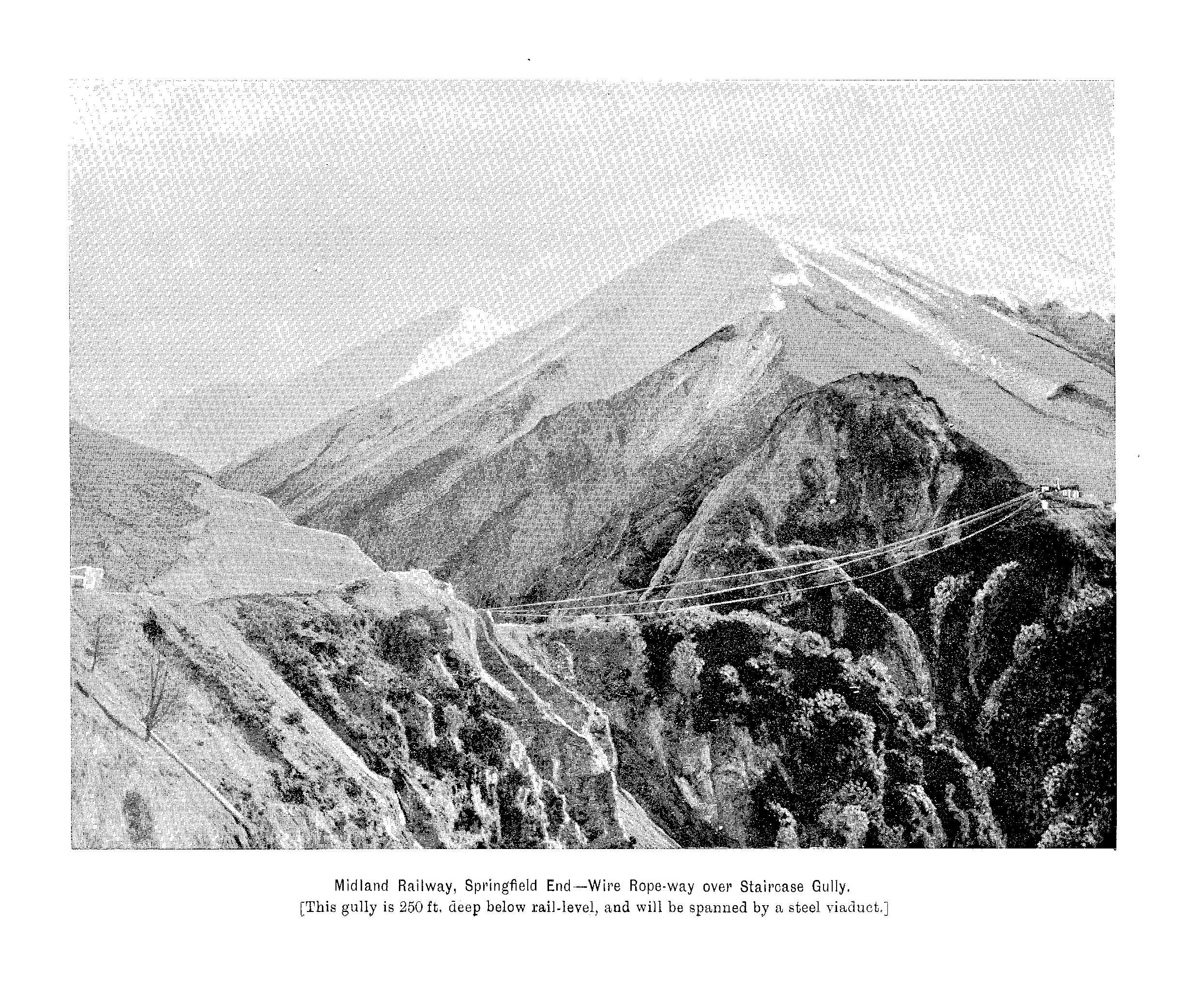 Midland Railway, Springfield End —Wire Rope-way over Staircase Gully. [This gully is 250ft. deep below rail-level, and will be spanned by a steel viaduct.]