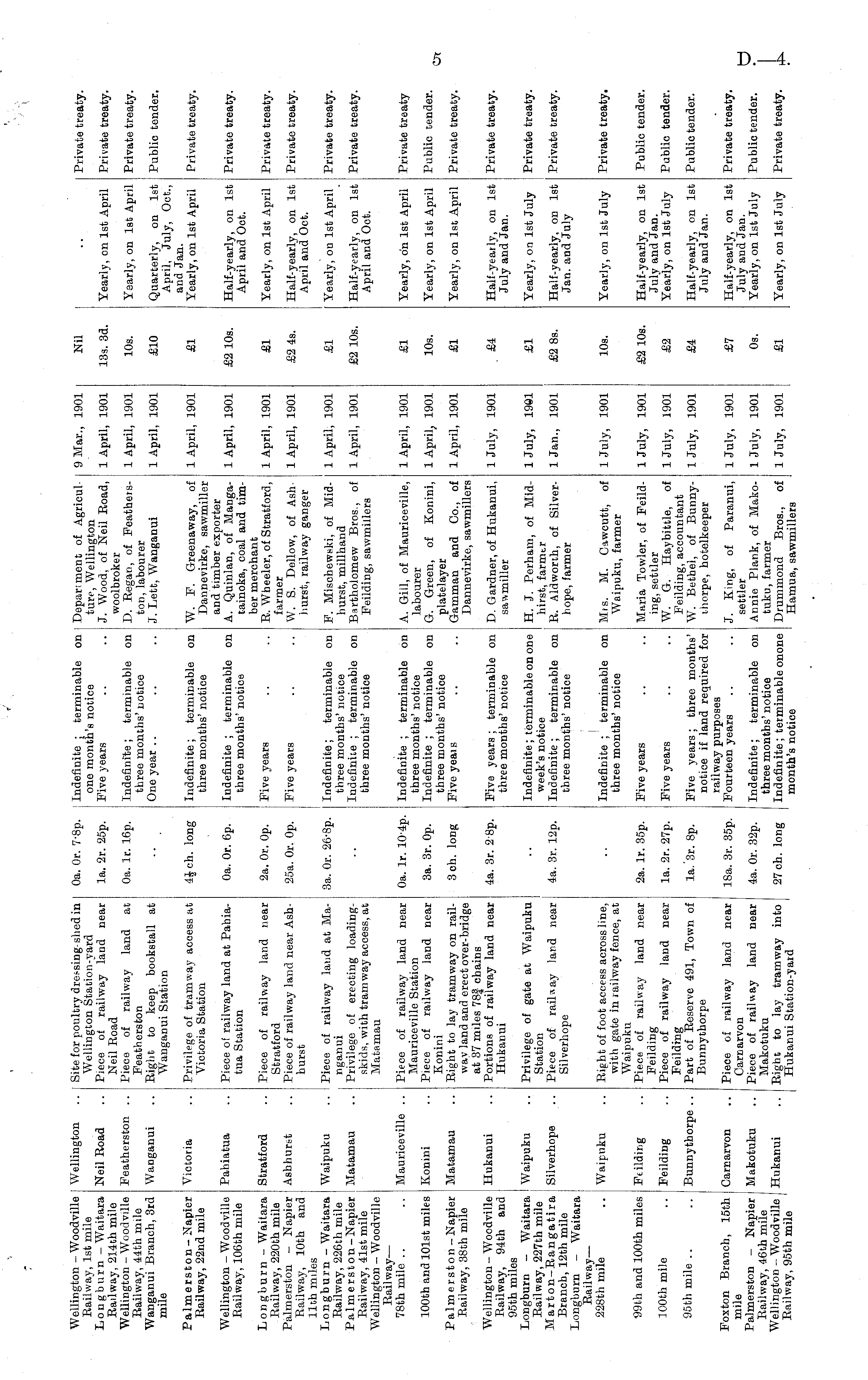 Wellington - Woodville Railway, 1st mile Iiongburn - Waitara Railway, 214th mile Wellington - Woodville Railway, 44th mile Wanganui Branch, 3rd mile Wellington Site for poultry dre^sing-shedin Wellington Station-yard Piece ot railway land near Neil Road Piece of railway land at Feathers ton Riglit to keep bookstall at Wanganui Station Oa. Or. Y-8p. Indefinite ; terminable on one month's notice Five years Depar;rnent of Agriculture, Wellington J. Wood, of Neil Road, woolbroker D. Regan, of Featherston, labourer J. Lett, Wanganui 9 Mar., 1901 Nil Private treaty Neil Road la. 2r. 25p. 1 April, 1901 13s. 3d. Yearly, on 1st April Private treaty Featherston .. Oa. lr. 16p. Indefinite; terminable on three months' notice One year 1 April, 1901 10s. Yearly, on 1st April Private treaty Wanganui 1 April, 1901 £10 Quarterly, on 1st April, July, Oct., and Jan. Yearly, on 1st April Public tender Palmerston- Napier Railway, 22nd mile Victoria Privilege of tramway access at Victoria Station 4Jch. long Indefinite; terminable on three months' notice W. F. Greenaway, of Dannevirke, sawmiller and timber exporter A. Quinlan, of Mangatainoka, coal and timber merchant R. Wheeler, of Stratford, farmer W. S. Dellow, of Ashhurst, railway ganger 1 April, 1901 £1 Private treaty Wellington - Woodville Railway, 106th mile Pabiatua Piece o! railway land at Pahiatua Station Oa. Or. 6p. Indefinite ; terminable on three months' notice 1 April, 1901 £2 10s. Half-yearly, on 1st April and Oct. Private treaty Longburn - Waitara Railway, 220th mile Palmerston — Napier Railway, 10th and 11th miles Longburn -Waitara Railway, 226th mile Palmerston- Napier Railway, 41st mile Wellington - Woodville Railway — 78th mile Stratford Piece of railway land near Stratford Piece of railway land near Ashhurst 2a. Or. Op. Five years 1 April, 1901 £1 Yearly, on 1st April Private treaty Ashhurtt 25a. Or. Op. Five years 1 April, 1901 £2 4s. Half-yearly, on 1st April and Oct. Private treaty Waipnku Piece of railway laud at Manganui Privilege of erecting loadingskids, with tramwaj 7 access, at Matamau 3a. Or. 26-8p. Indefinite; terminable on three months' notice Indefinite ; terminable on three months' notice F. Mischewaki, of Midhurst, millhand Bartholomew Bros., of Feilding, sawmillers 1 April, 1901 £1 Yearly, on 1st April Private treaty Matamau 1 April, 1901 £2 10s. Half-yearly, on 1st April and Oct. Private treaty Mauriceville .. Piece of railway land near Mauriceville Station Piece of railway land near Konini Right to lay tramway on railway land and erect over-bridge at 37 miles 78| chains Portions of railway land near Hukanui Oa. lr. 10'4p. Indefinite ; terminable on three months' notice Indefinite ; terminable on three months' notice Five yeai s A. Gill, of Mauriceville, labourer G. Green, of Konini, platelayer Gamman and Co., of Dannevirke, sawmillers 1 April, 1901 £1 Yearly, on 1st April Private treaty 100th and 101st miles Konini 3a. 3r. Op. 1 April, 1901 10s. Yearly, on 1st April Public tender Palmerston- Napier Railway, 38th mile Matamau 3 oh. long 1 April, 1901 £1 Yearly, on 1st April Private treaty Wellington - Woodville Railway, 94th and 95th miles Longburn - Waitara Railway, 227th mile Marton-Rangatira Branch, 12th mile Longburn - Waitara Railway — 228th mile Hukanui 4a. 3r. 28p. Five years; terminable on three months' notice D. Gardner, of Hukanui, sasvmiller 1 July, 1901 £4 Half-yearly, on 1st July and Jan. Private treaty Waipuku Privilege of gate at Waipuku Station Piece of railway land near Silverhope Indefinite; terminable on one week's notice Indefinite; terminable on three months' notice H. J. Perham, of Midhirst, farmtr R. Aldworth, of Silverhope, farmer 1 July, 1901 £1 Yearly, on 1st July Private treaty Silverhope 4a. 3r. 12p. 1 Jan., 1901 £2 8s. Half-yearly, on 1st Jan. and July Private treaty Waipnku Right of foot access across line, with gate in railway fence, at Waipuku Piece of railway land near Feilding Piece of railway land near Feilding Part of Reserve 491, Town of Burmythorpe Indefinite ; terminable on three months' notice Mrs. M. Cawcutt, of Waipuku, farmer 1 July, 1901 10s. Yearly, on 1st July Private treaty 99 th and 100th miles Folding 2a. lr. 35p. Five years Maria Towler, of Feilding, settler W. G. Haybittle, of Feilding, accountant W. Bethel, of Bunnythorpe, hotelkeeper 1 July, 1901 £2 10s. Half-yearly, on 1st July and Jan. Yearly, on 1st July Public tender 100th mile Feilding la. 2r. 27p. Five years 1 July, 1901 £2 Public tendei 95th mile Bunnytborpe .. la. 3r. 8p. Five years; three months' notice if land required for railway purposes Fourteen years 1 July, 1901 £4 Half-yearly, on 1st July and Jan. Public tender. Foxton Branch, 15th mile Palmerston - Napier Railway, 46th mile Wellington -Woodville Railway, 95th mile Carnarvon Makotuku Piece of railway land near Carnarvon Piece of railway land near Makotuku Right to lay tramway into Hukanui Station-yard 18a. 3r. 35p. 4a. Or. 32p. Indefinite; terminable on three months' notice Indefinite; terminable onone month's notice J. King, of Paranui, settler Annie Plank, of Makotuku, farmer Drummond Bros., of Hamua, sawmillers 1 July, 1901 1 July, 1901 £7 0s. Half-yearly, on 1st July and Jan. Yearly, on 1st July Private treaty Public tender. Hukanui 27 oh. long 1 July, 1901 £1 Yearly, on 1st July Private treaty